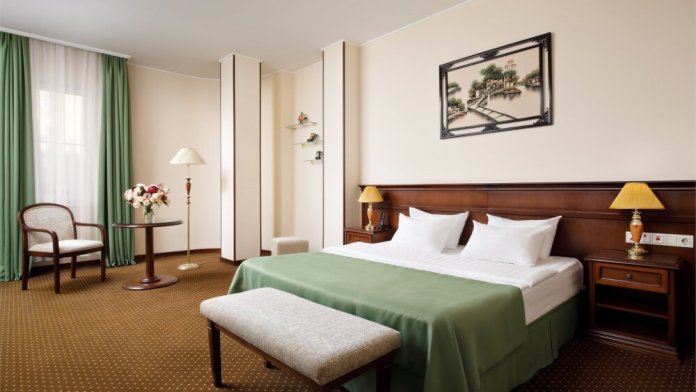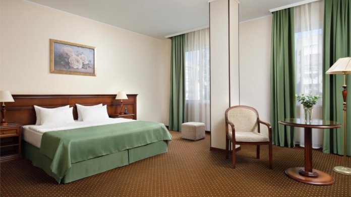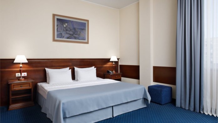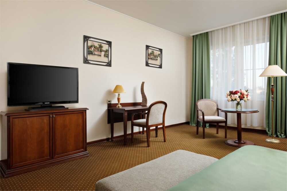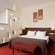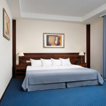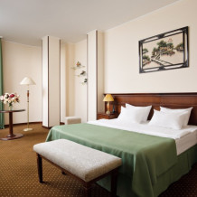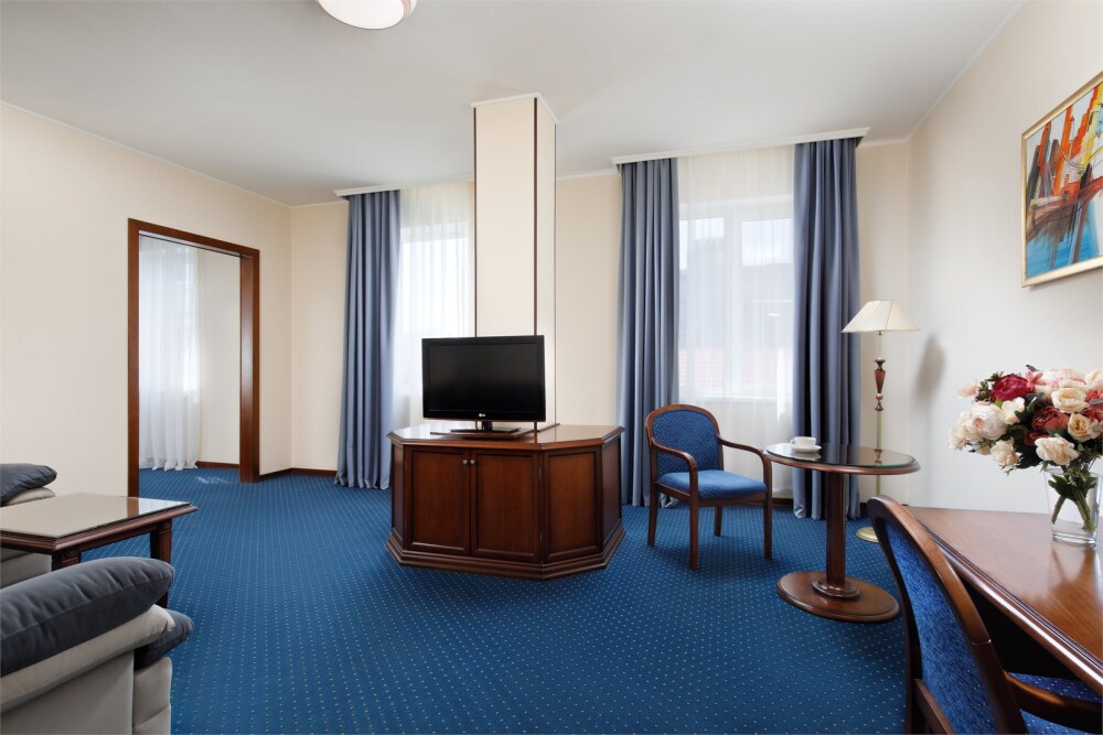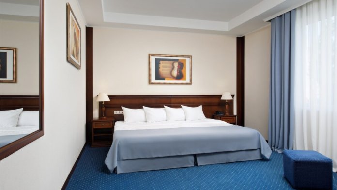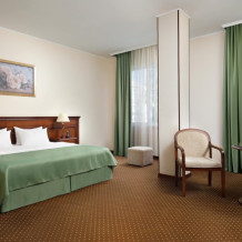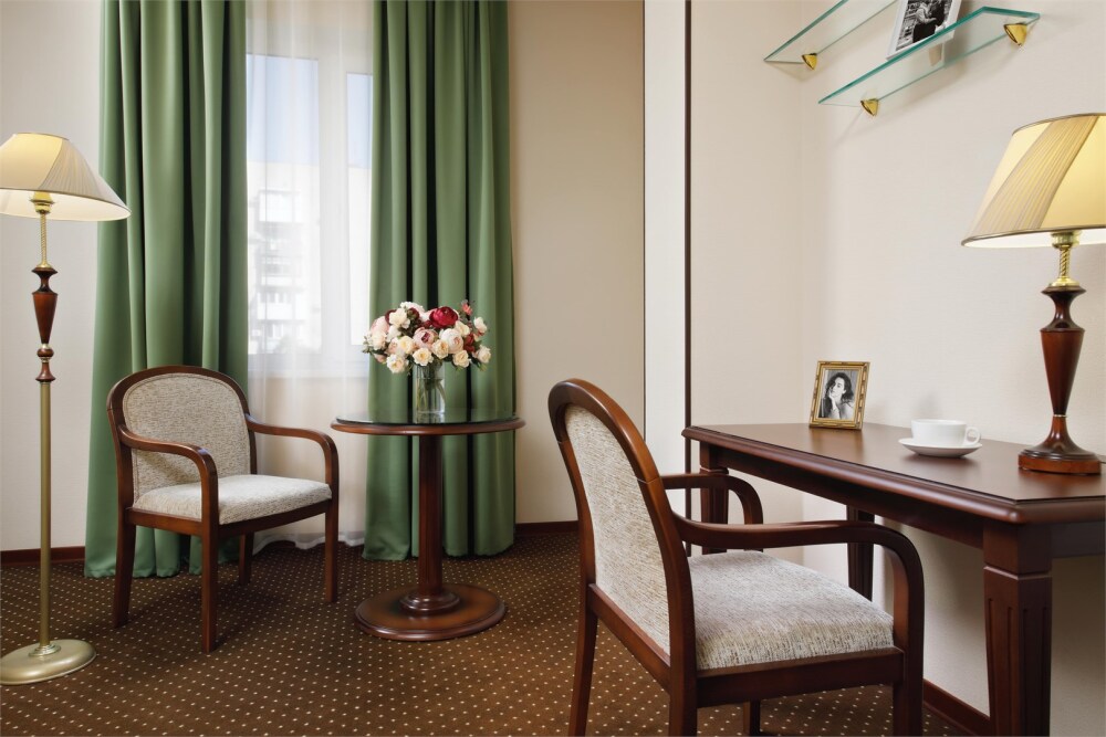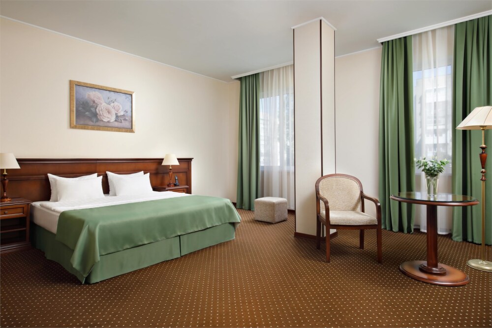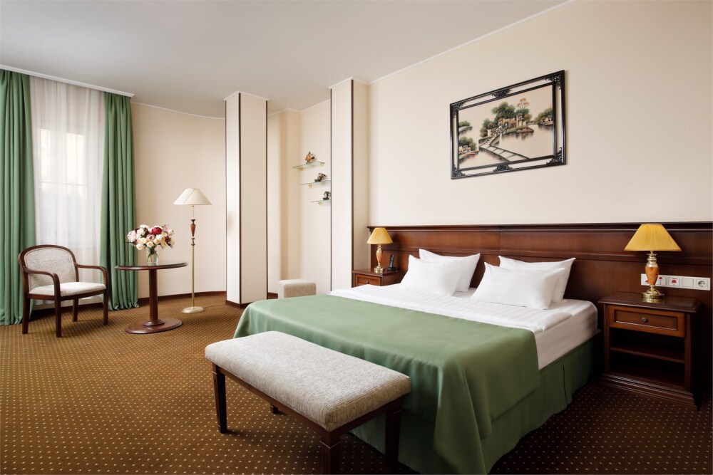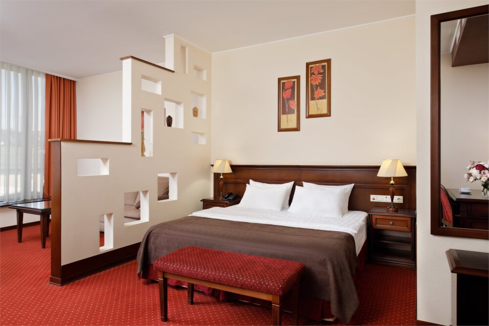 Двухкомнатный просторный, оформленные в классическом стиле номер с большой двуспальной кроватью или двумя односпальными. Из панорамных окон номера открывается красивый вид на город или на внутренний двор отеля.