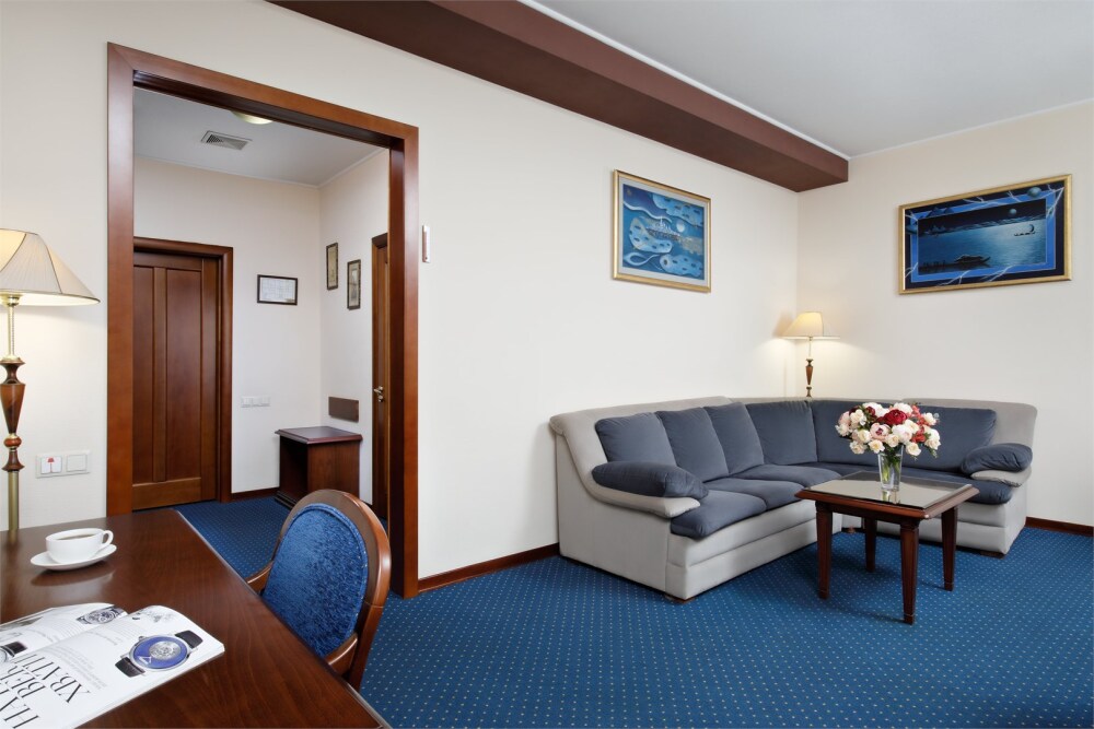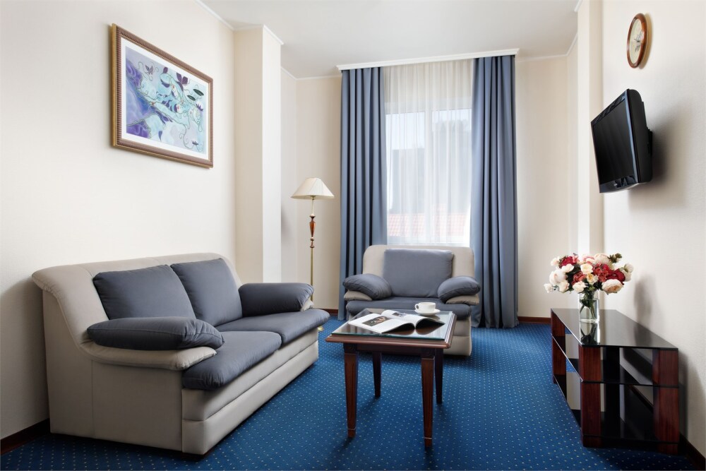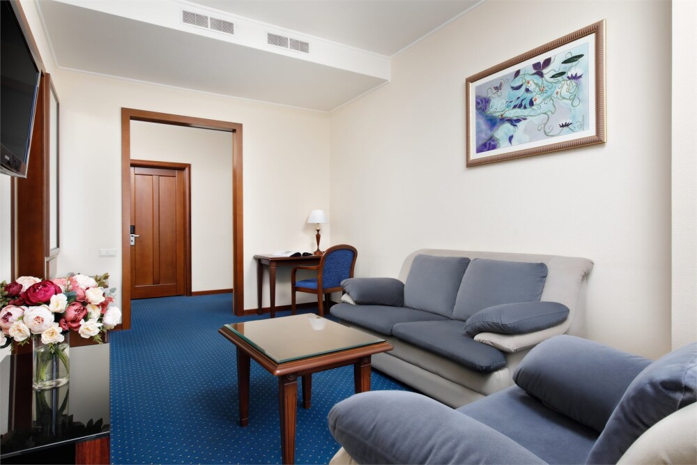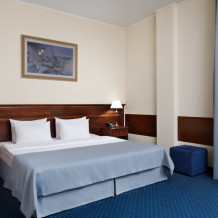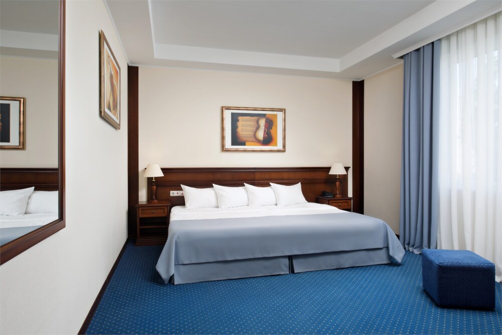 Двухкомнатный просторный номер повышенной степени комфортности с большой двуспальной кроватью или двумя односпальными, в котором гармонично сочетаются спальная и гостиная зоны. В оформлении номера использованы ярко-синие цвета.