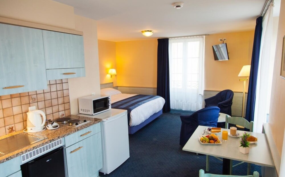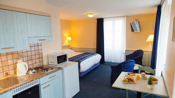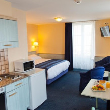 Просторный номер студия с двуспальной или двумя односпальными кроватями, одним дополнительным местом и мини-кухней.