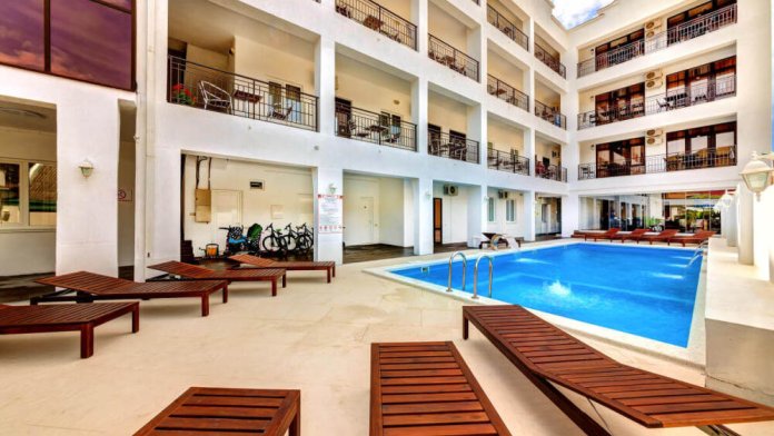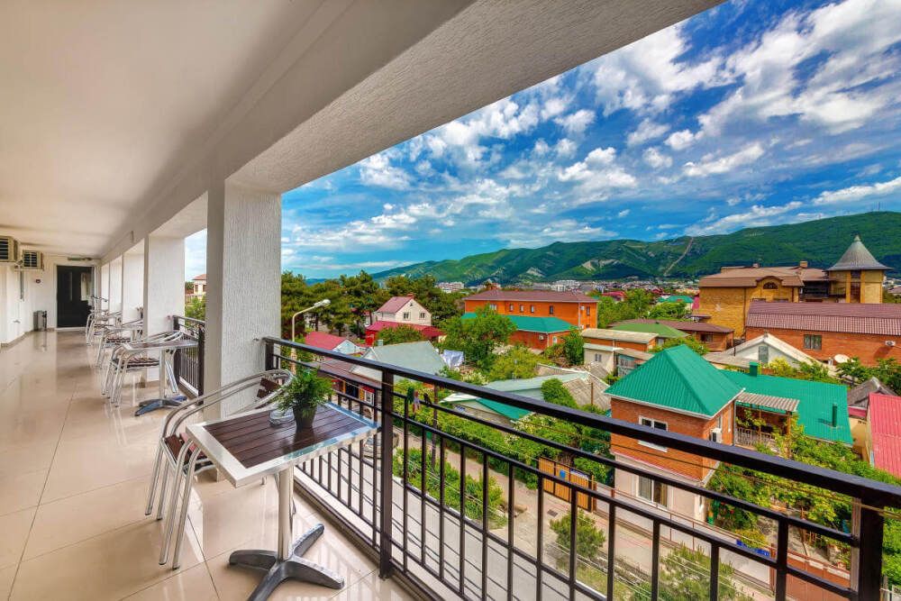 Отель расположен в самом центре Геленджике, вокруг есть вся необходимая инфраструктура: кафе и рестораны, аптеки различные магазины, а также развлекательные центры. С верхних этажей открывается прекрасный вид на горы. Но самое главное в отдыхе летом – это конечно же море и пляж. Наш отель находится в 400 метрах от песчаного пляжа и набережной – это примерно 5-7 минут неспешным шагом.