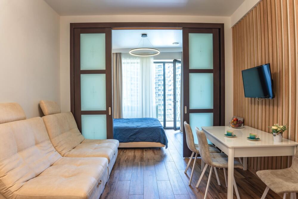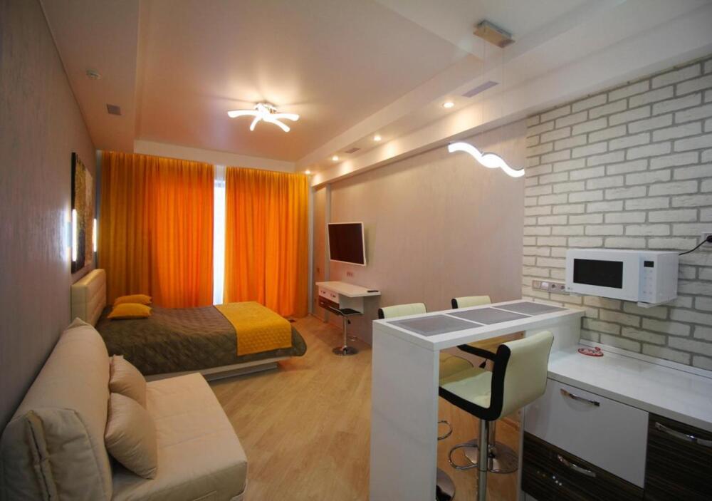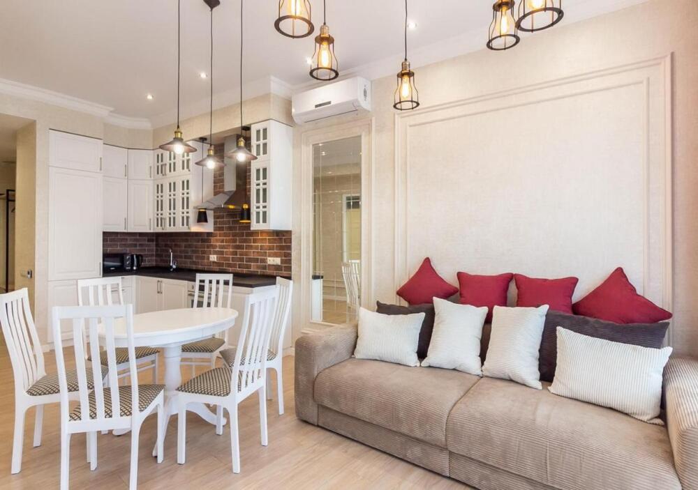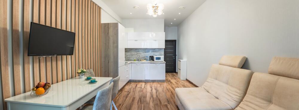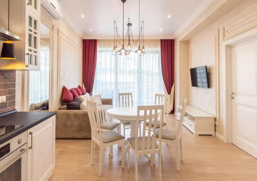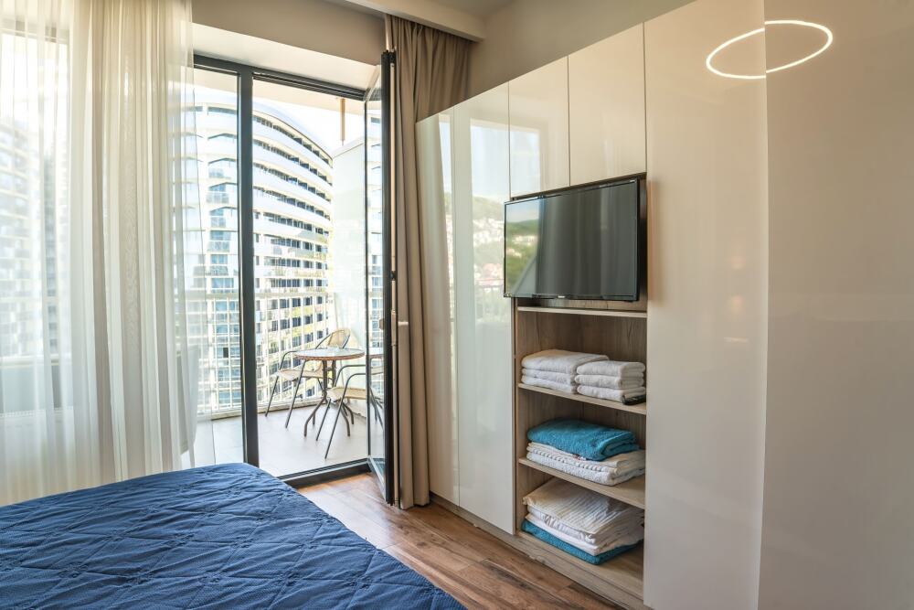 Апартаменты оборудованы всем необходимым для комфортного отдыха. Из окон открываются панорамные виды на море. В апартаментах установлены кондиционеры, есть необходимая мебель, телевизоры, стиральные машины, кухонная техника.