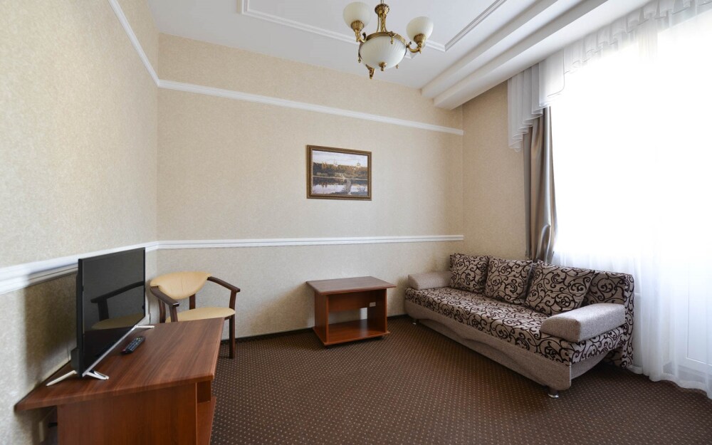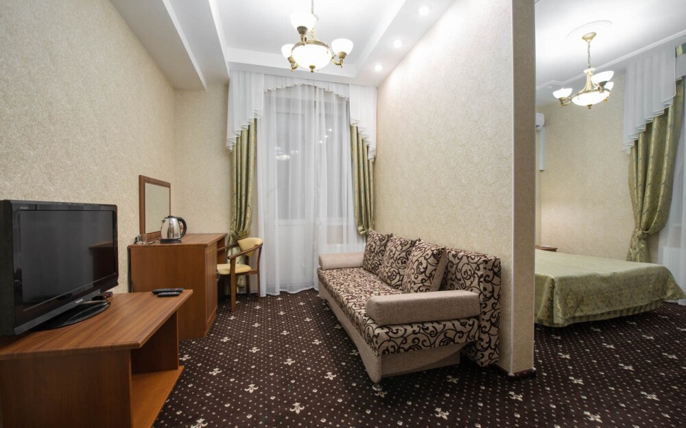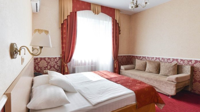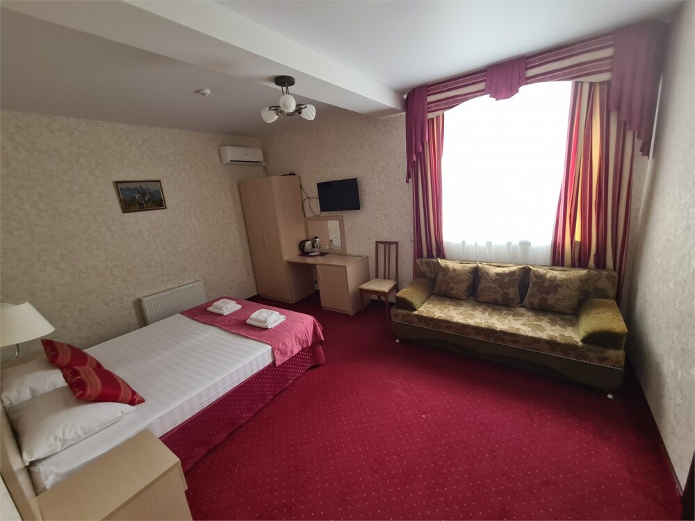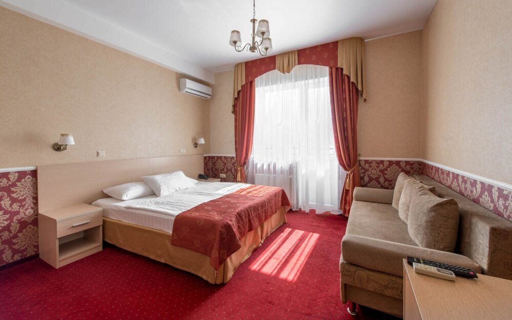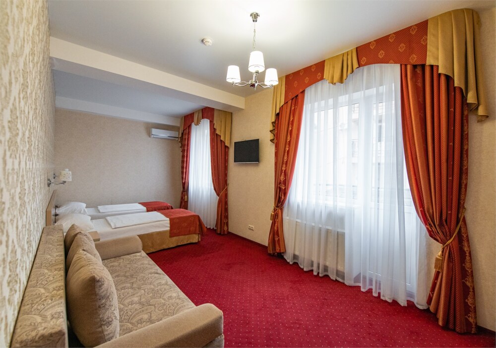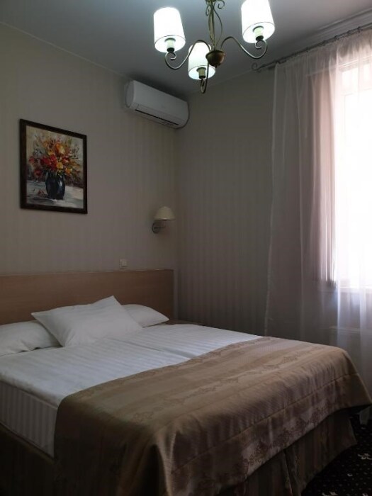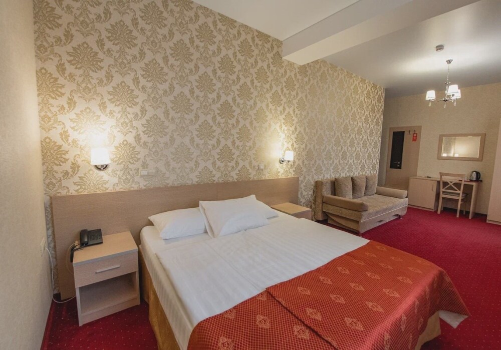 В номере двуспальная французская кровать, или две одноместные кровати, диван-кровать (возможность установки евро-раскладушки).