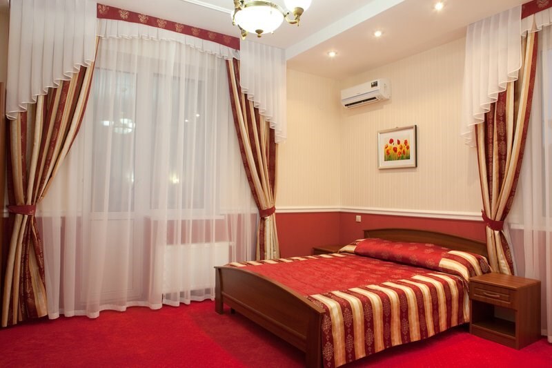 Небольшие уютные номерa оформленные в бордовом и бежевом оттенках.
