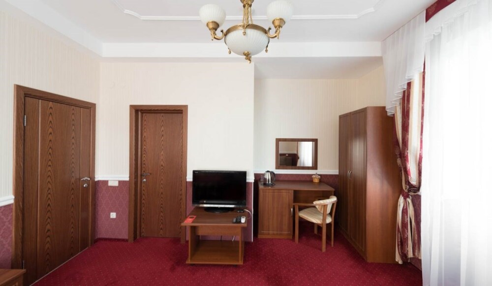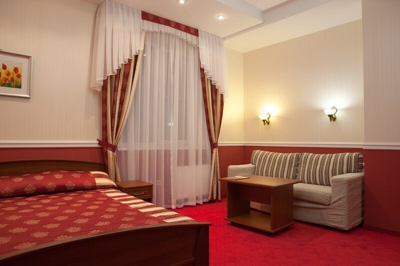 Большой уютный номер оформленный в бордовом, бежевом и коричневом оттенках.