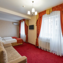 Номера с размещением на кровати (двуспальной или двух односпальных ) на двуспальном диван-кровати (для 3-го и 4-го гостей ), а так же возможность размещение ребенка до 3-х лет без предоставления места, и с установкой дополнительного места в виде евро–раскладушки для пятого гостя.