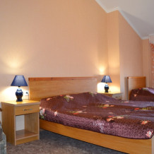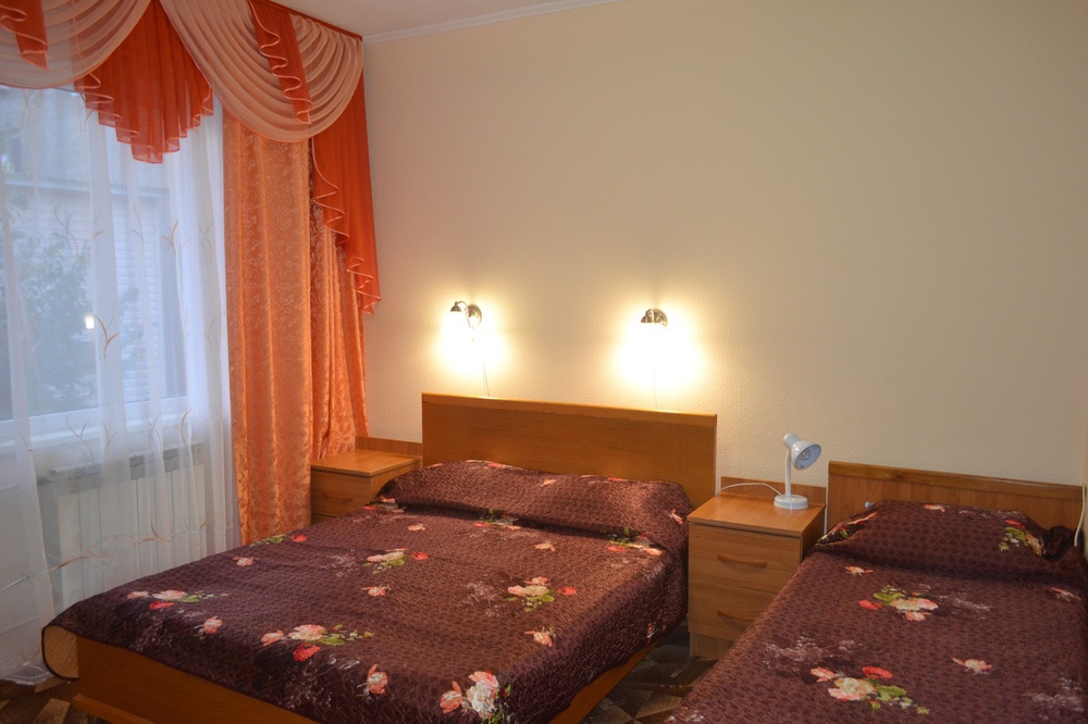 одна двуспальная и две односпальные кровати, 2 прикроватные тумбочки, стол, стул или пуфик, шкаф, зеркало; туалетные принадлежности, чайная посуда