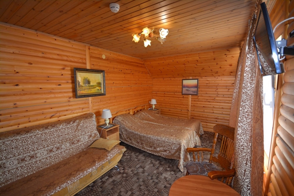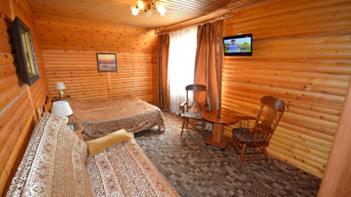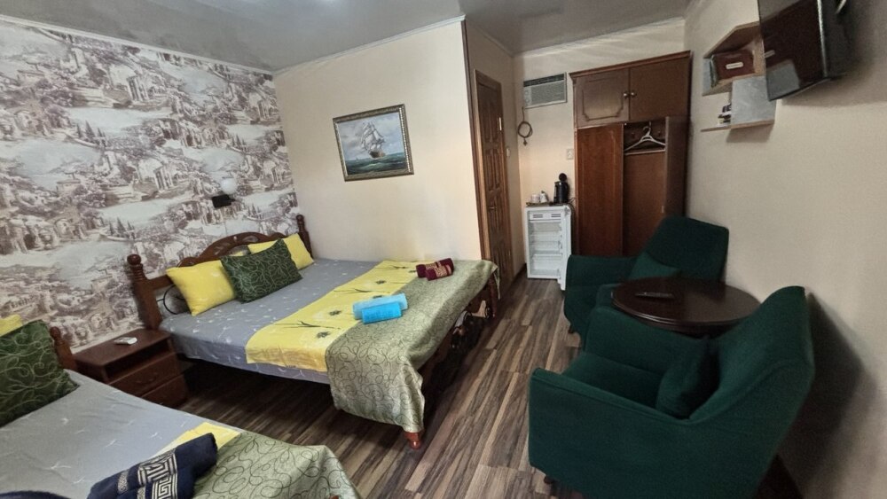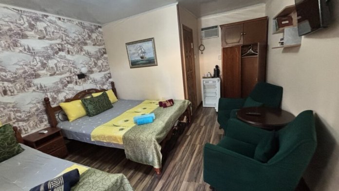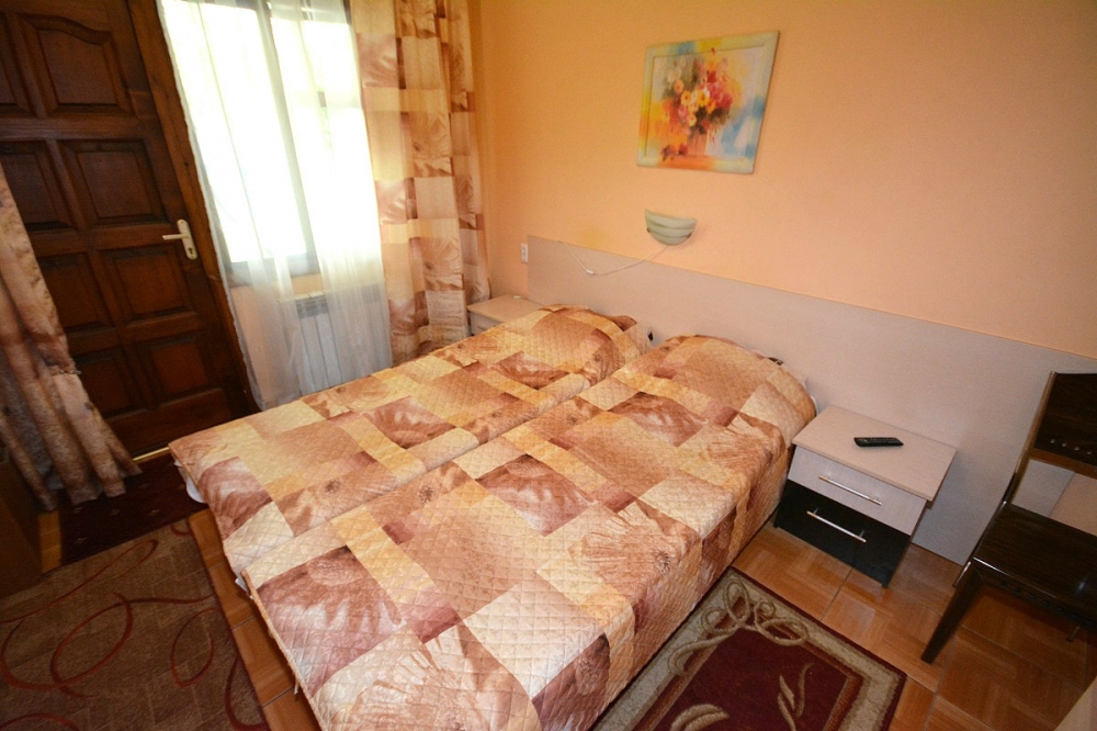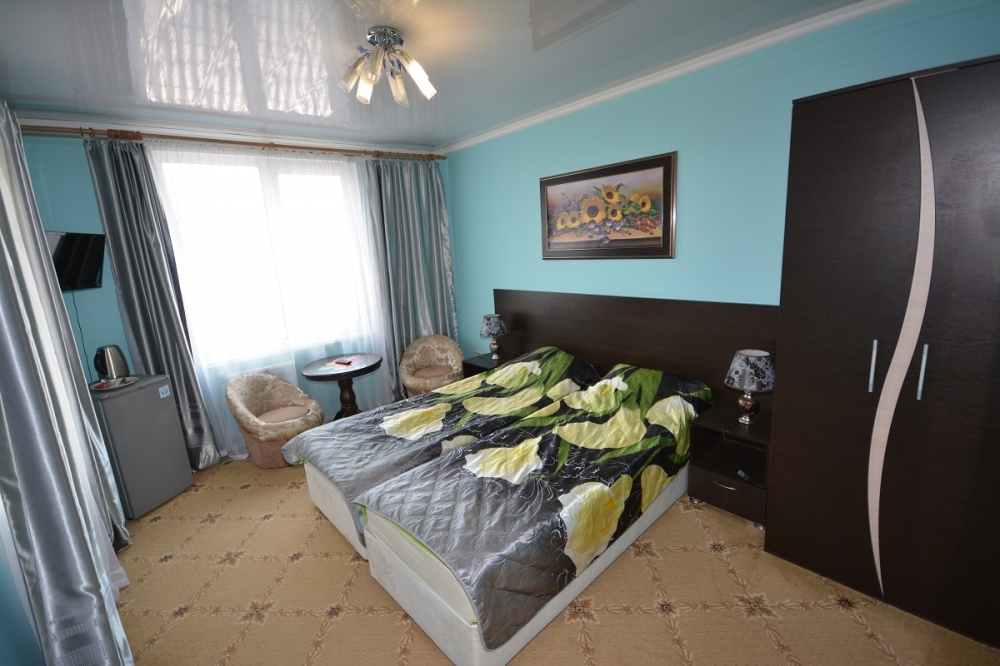Двуспальная и односпальная кровати, телевизор, холодильник, кондиционер, сейф. В ванной: душ, туалет, раковина, фен, набор полотенец, мыло, шампунь.