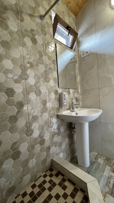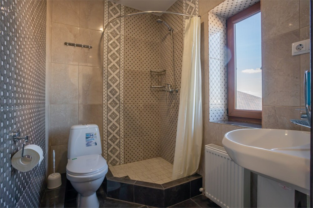 В каждом номере имеется собственная ванная комната с современной душевой кабиной, туалетом и умывальником. Мы позаботились о каждой мелочи для Вашего удобства.