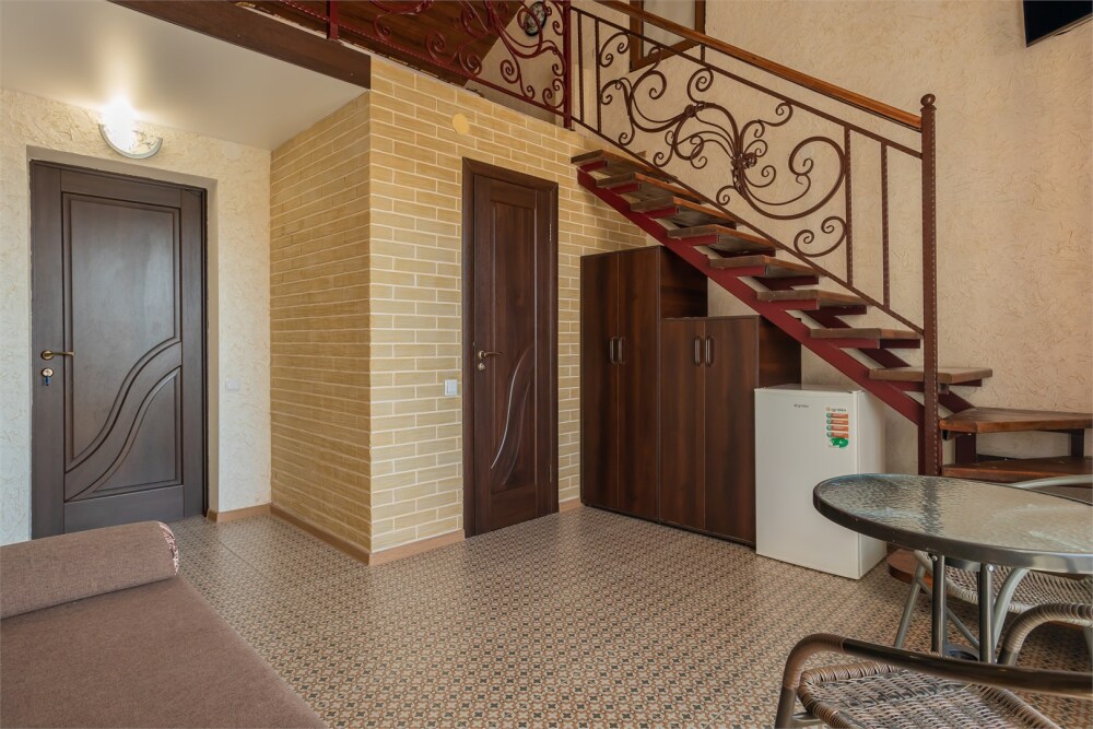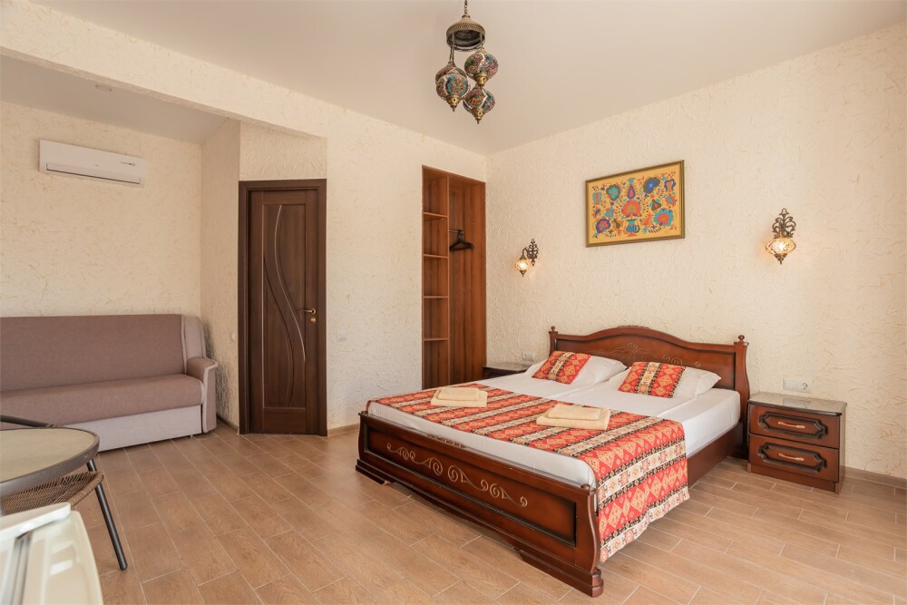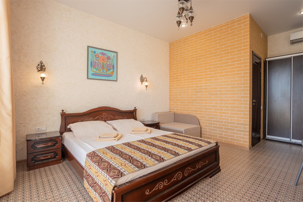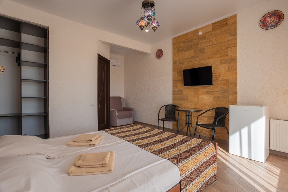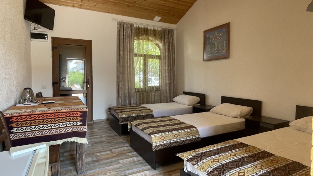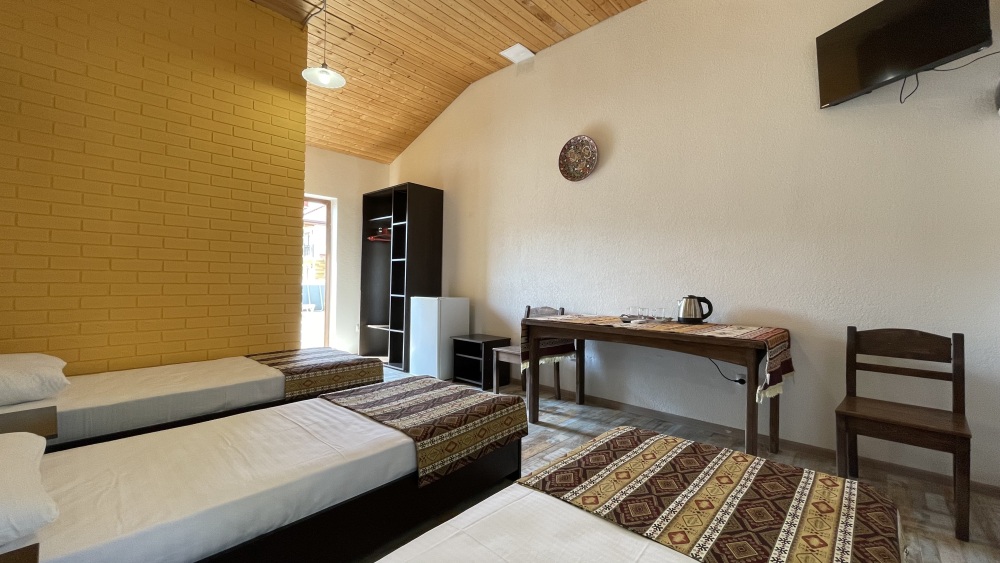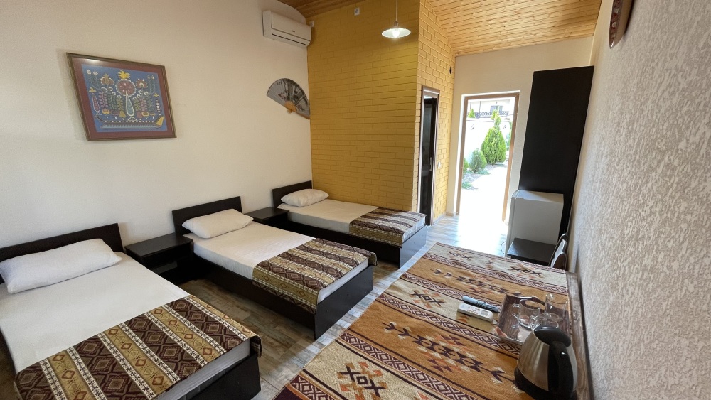 Трехместный номер Стандарт — это отдельно стоящий домик с индивидуальным входом. Номер предназначен для проживания трех человек. Возможно размещение четвертого человека (на дополнительном месте).