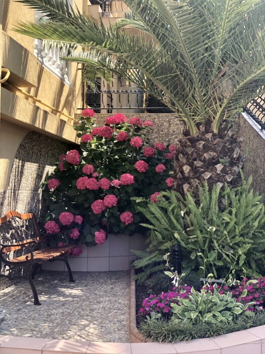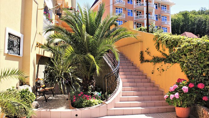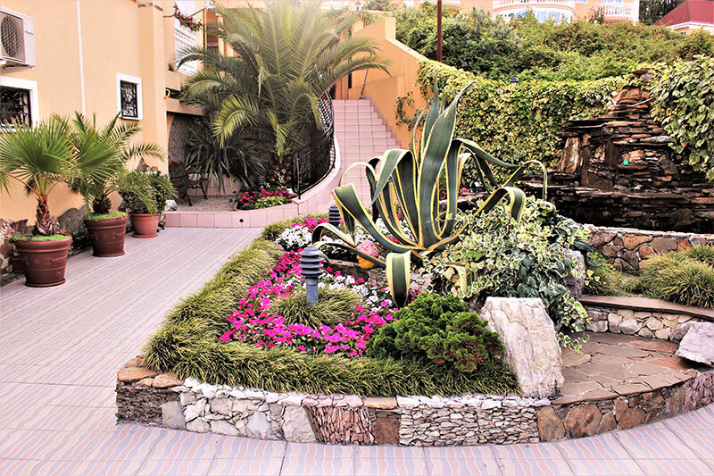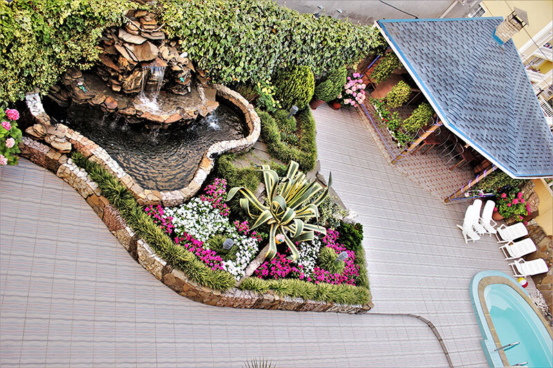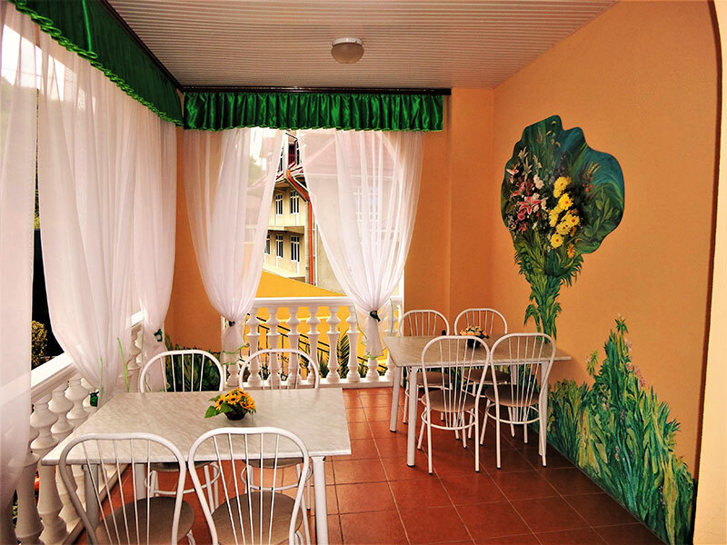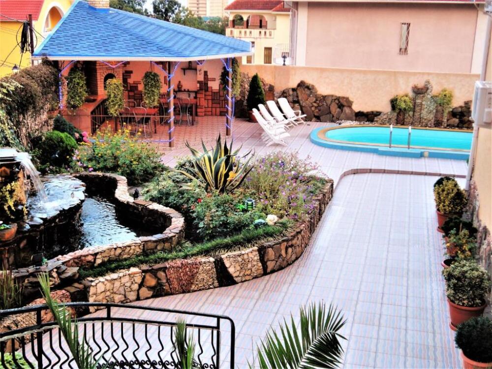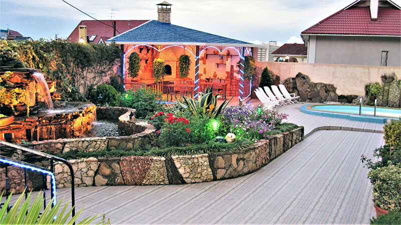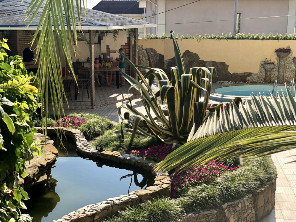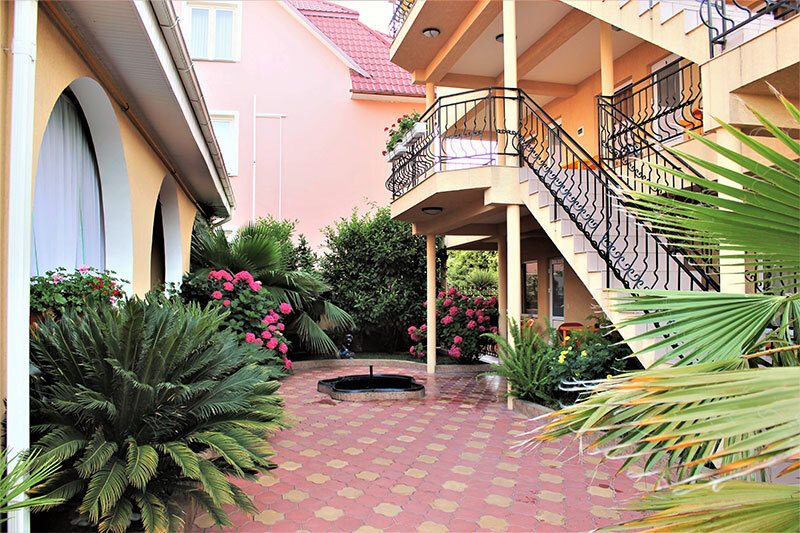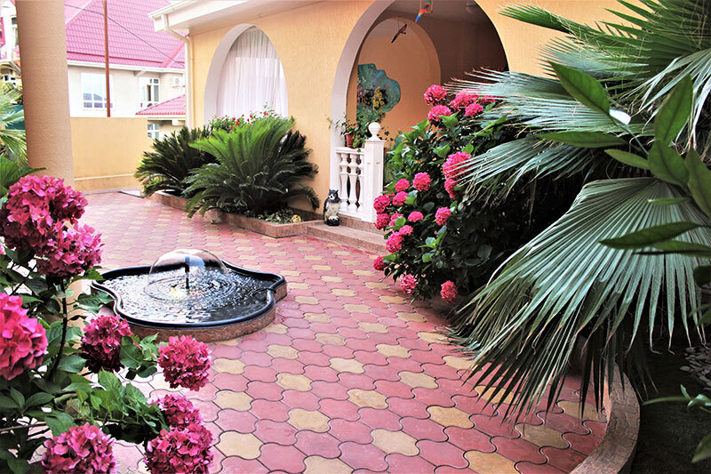Когда мы создавали наш гостевой дом, мы постарались сделать его не просто местом, куда люди приходят после купания, спят и опять уходят. Наш гостевой дом в Адлере на Медовой улице имеет уникальный ландшафтный дизайн: уютная беседка, фонтан, изящное панно на стене и множество изумительных цветов и растений. Всё это создает волшебную атмосферу, которая только усиливается вечером, когда включается подсветка. Вечером после насыщенного дня можно присесть за столики на террасе, выпить с друзьями чашку чая или бокал вина, сыграть с детьми в настольные игры и наслаждаться видом фонтана. На всей территории работает бесплатный Wi-Fi.