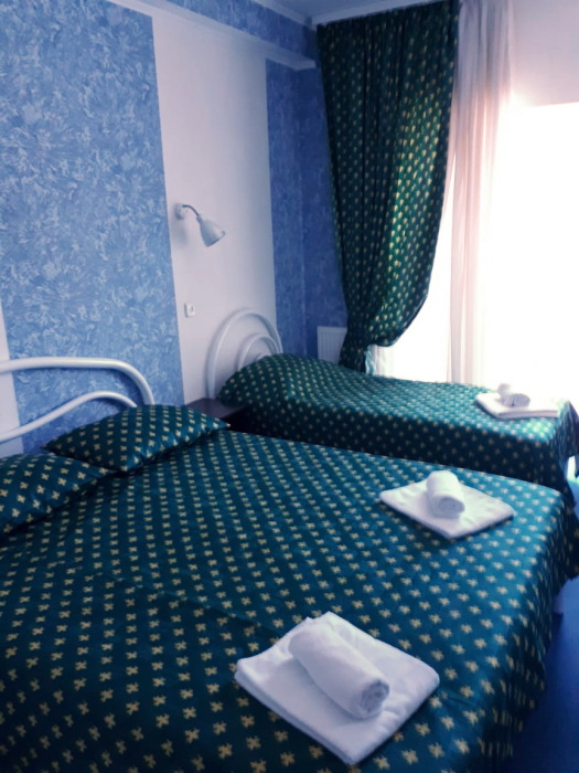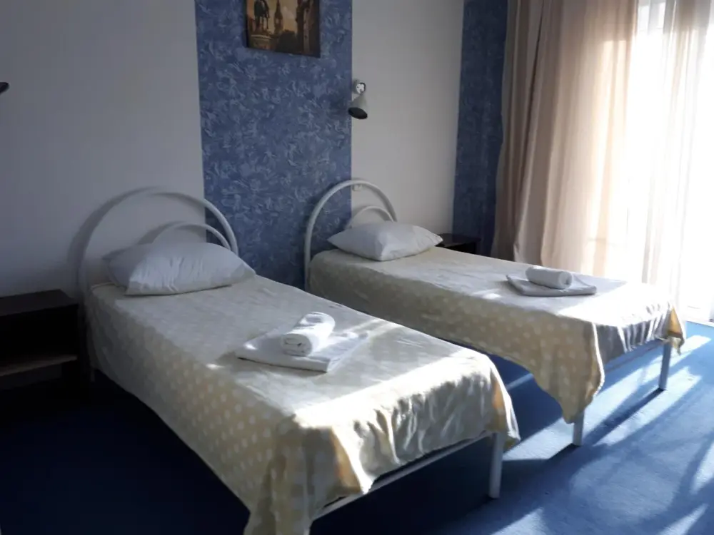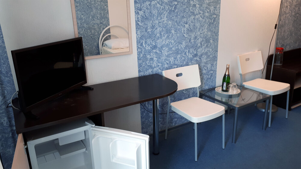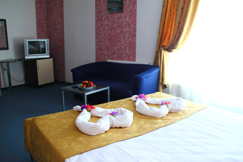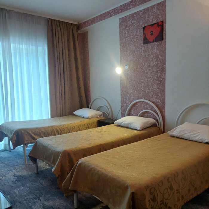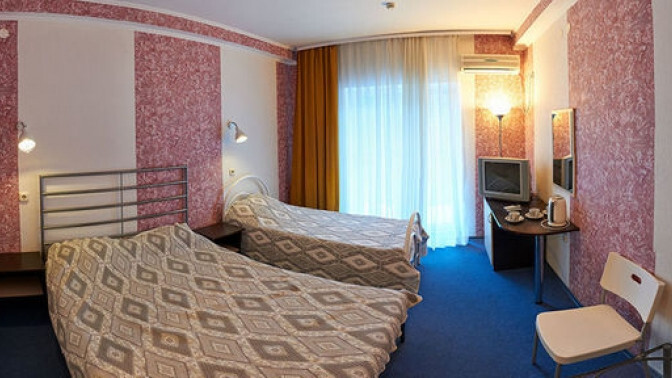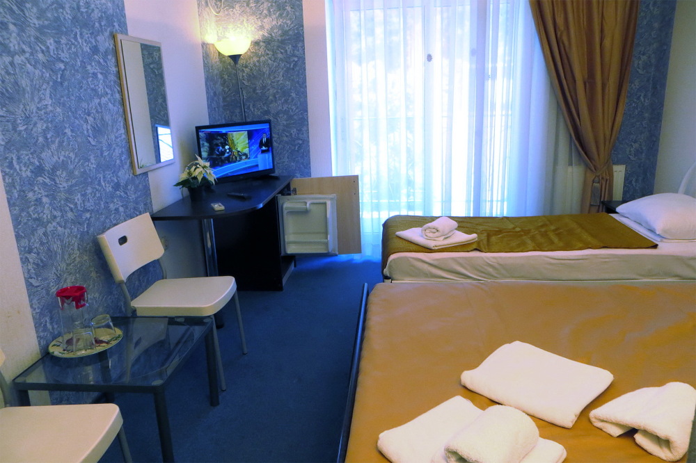 Одна комната. Одна двуспальная +односпальная кровать (или три односпальные кровати) с прикроватными тумбочками, шкаф, журнальный столик, телевизор с плоским экраном (спутниковое ТВ – 20 программ), мини-бар, торшер, кондиционер, чайный столик (эл. чайник, чай, сахар). С/у с душевой кабиной, фен. Балкон с пластиковой мебелью.