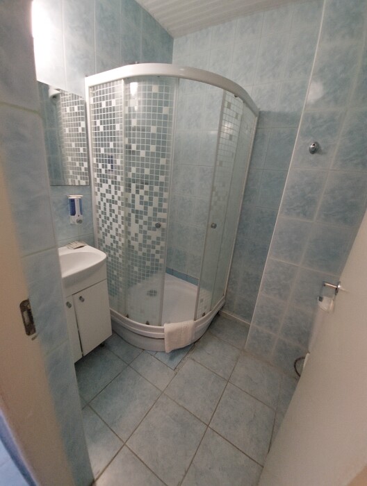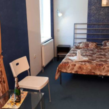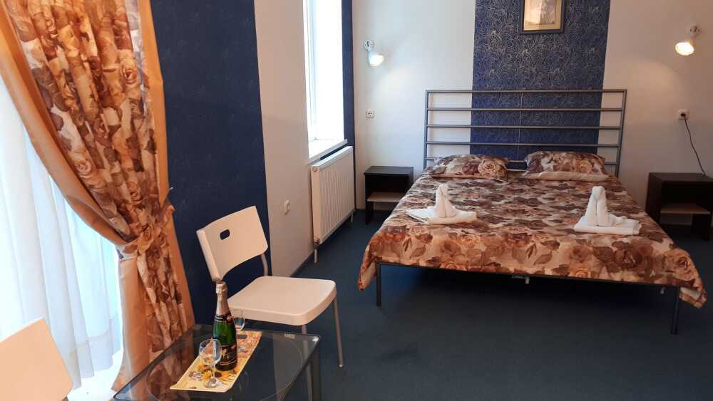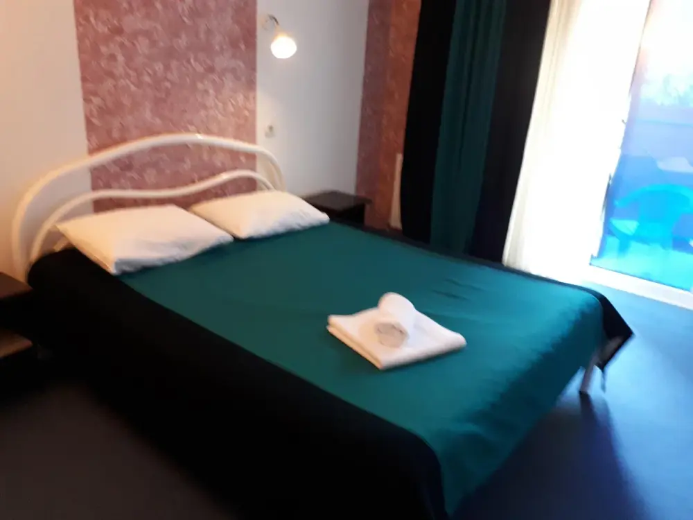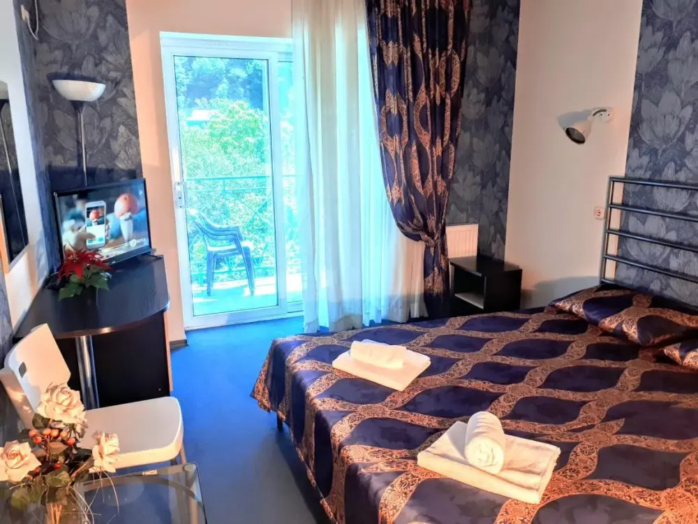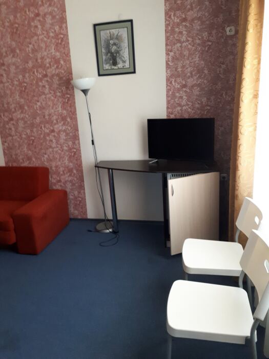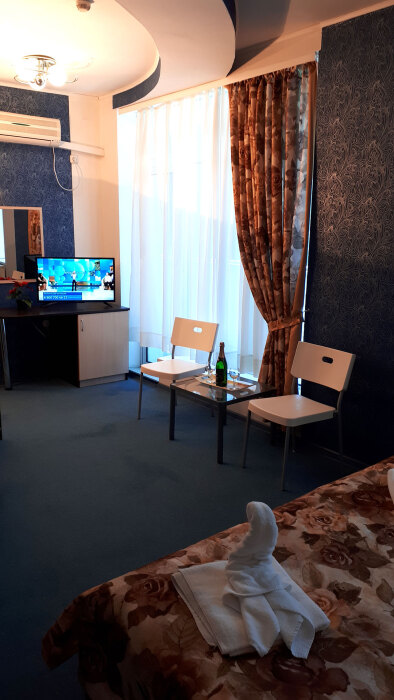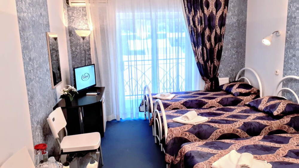 Одна комната. Одна двуспальная +односпальная кровать (или три односпальные кровати) с прикроватными тумбочками, шкаф, журнальный столик, телевизор с плоским экраном (спутниковое ТВ – 20 программ), мини-бар, торшер, кондиционер, чайный столик (эл. чайник, чай, сахар). С/у с душевой кабиной, фен. Балкон с пластиковой мебелью.