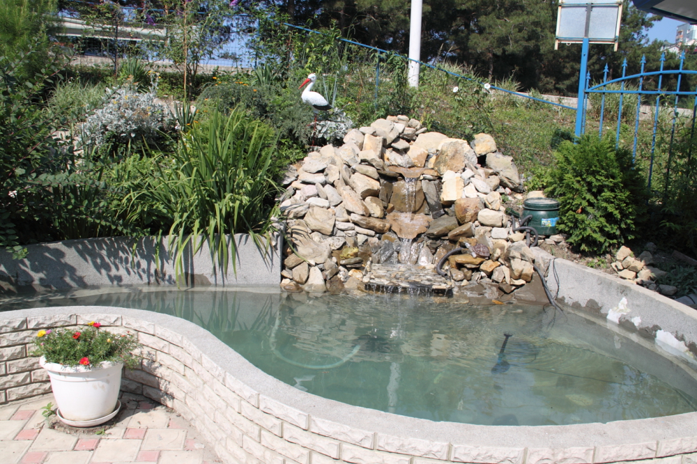 Благоустроенная территория с цветниками, прудом, беседкой.