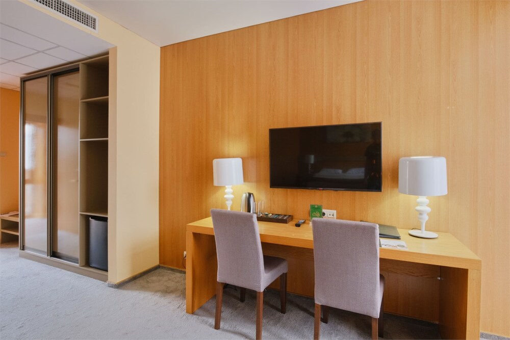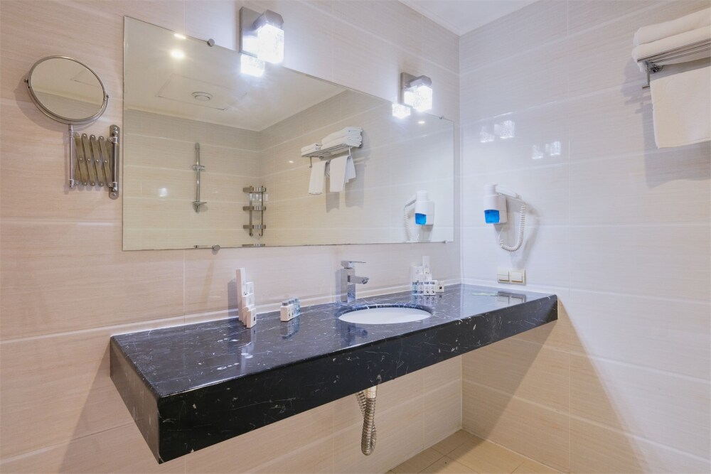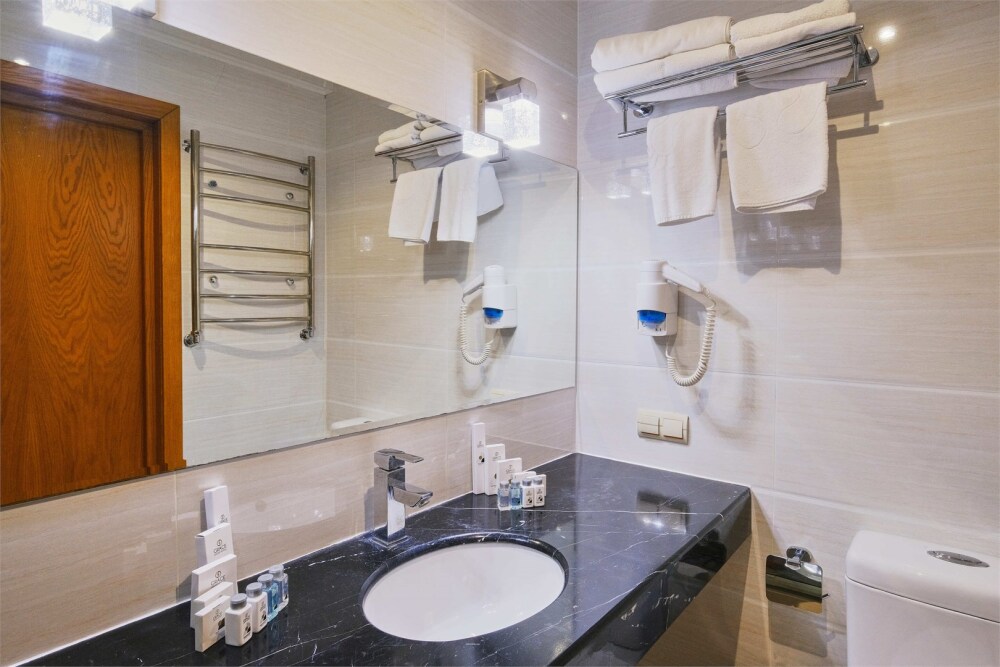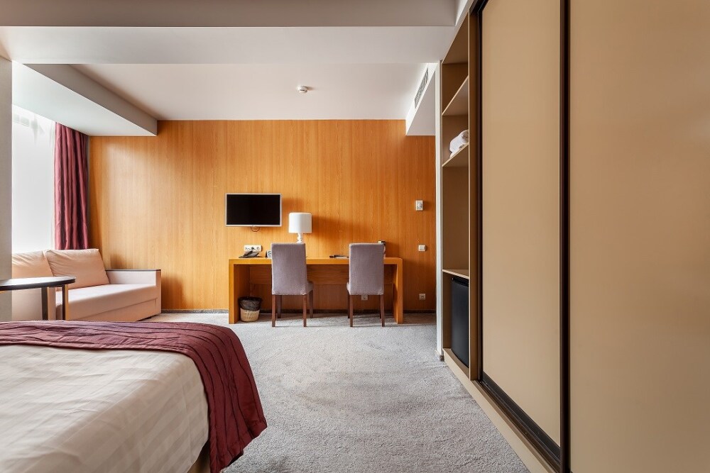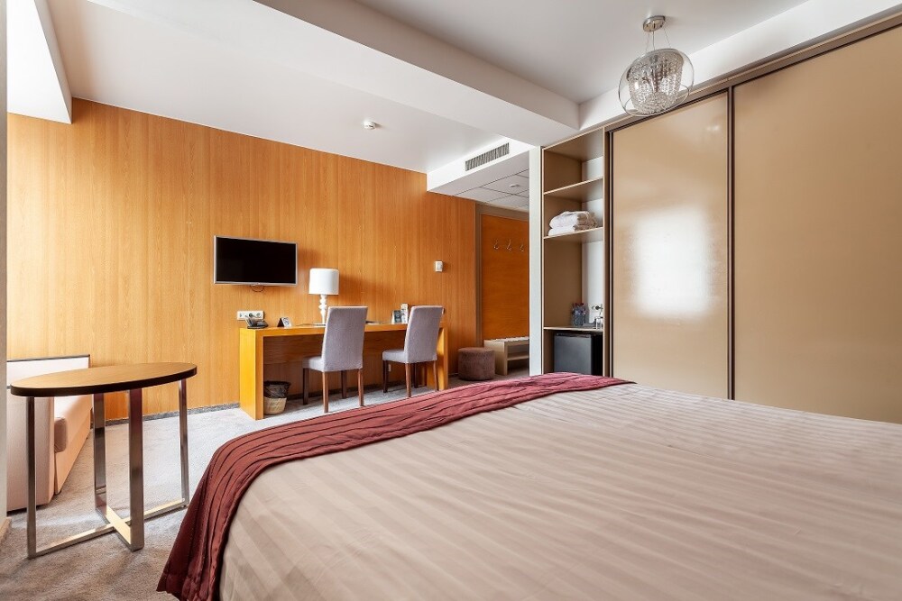 Просторный однокомнатный номер с большой двуспальной кроватью и двухместным раскладным диваном. Один ребёнок до 6 лет — можно без отдельного спального места.