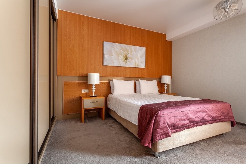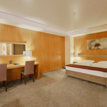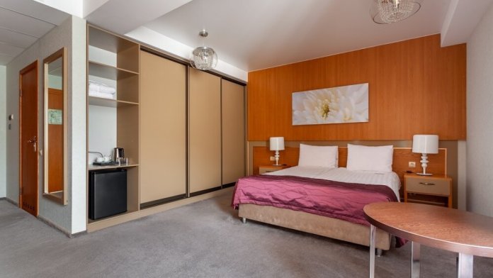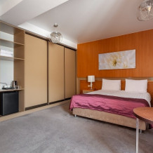 Комфортный однокомнатный номер с двуспальной кроватью и раскладным креслом. Один ребёнок до 6 лет — можно без отдельного спального места.