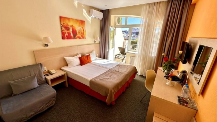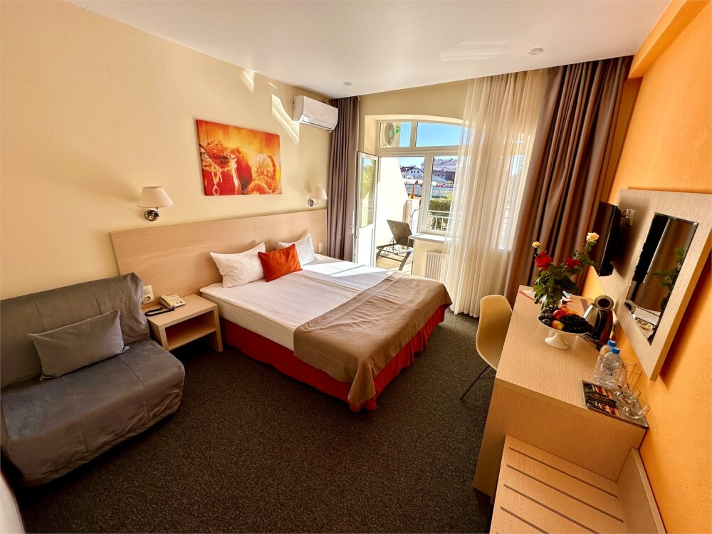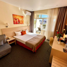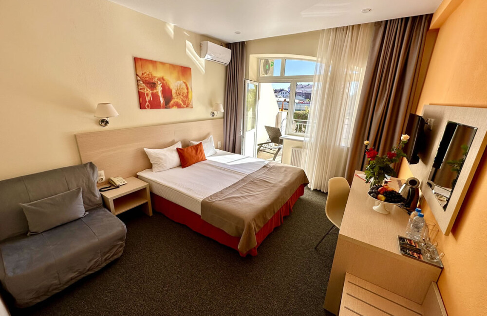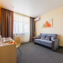 Комфорт - однокомнатный номер, расположен на 1 этаже отеля и имеет просторную террасу 12 кв м, оснащенную лежаками. В комплектацию номера входит индивидуальная косметика, халат, тапочки, рум-сервис и мини-бар.