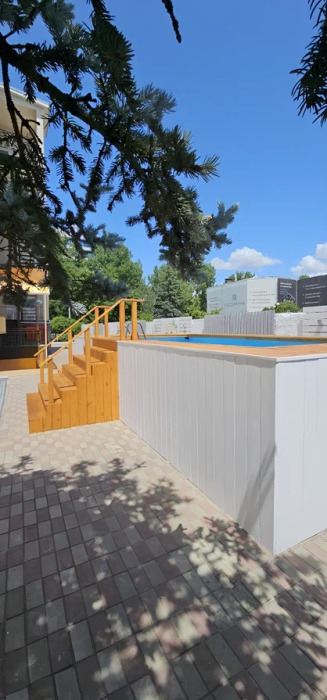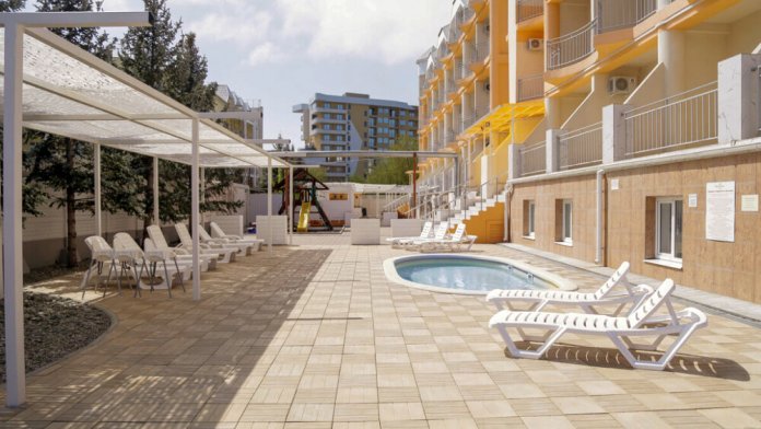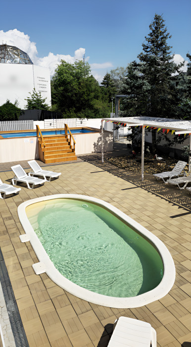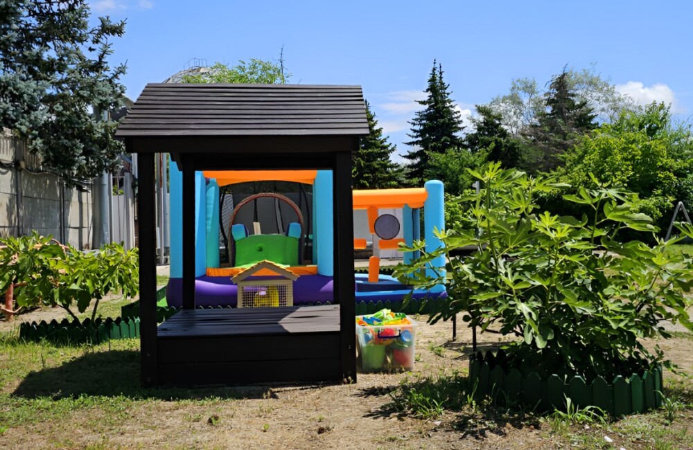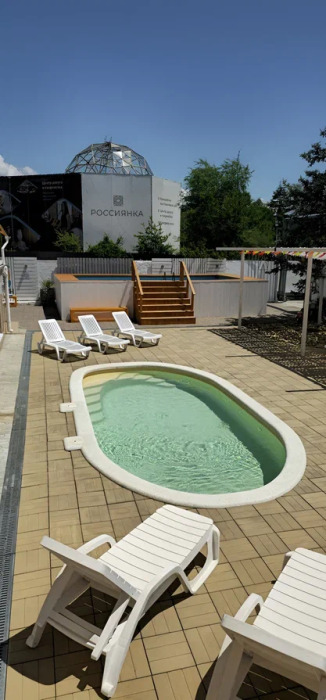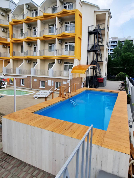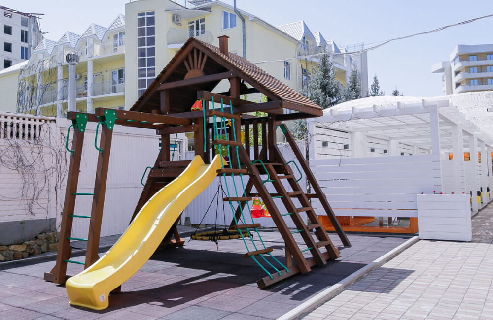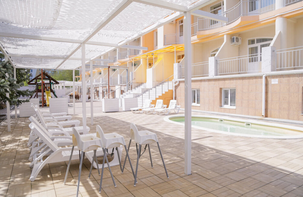 К услугам наших гостей небольшая но уютная зона отдыха рядом с самим отелем, включающая чашу детского бассейна (18 кв.м.) с подогревом, место под шезлонги, уютные скамейки и беседки, всё это украшено свежей сезонной зеленью и цветами.