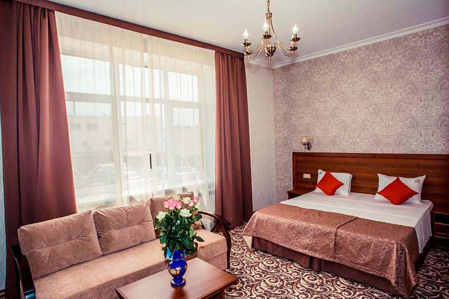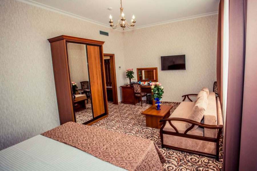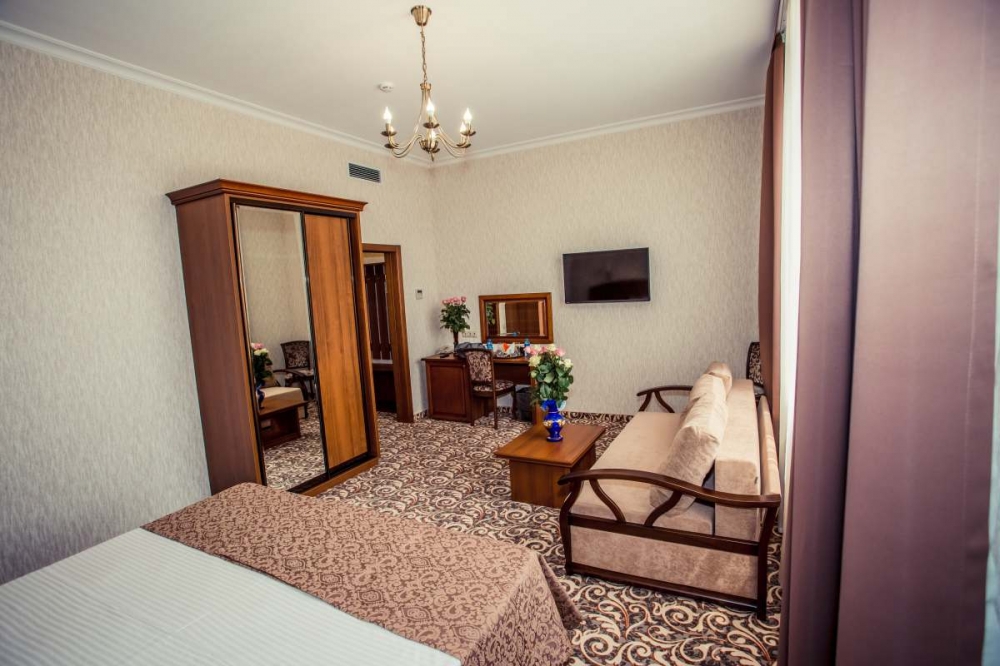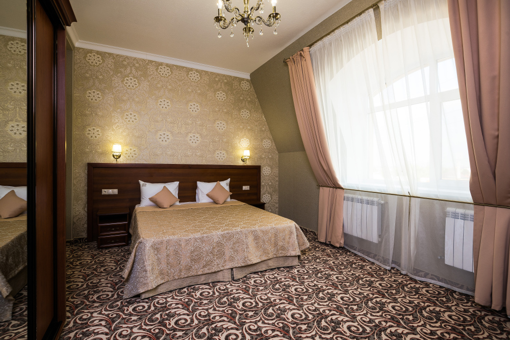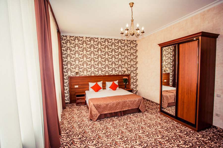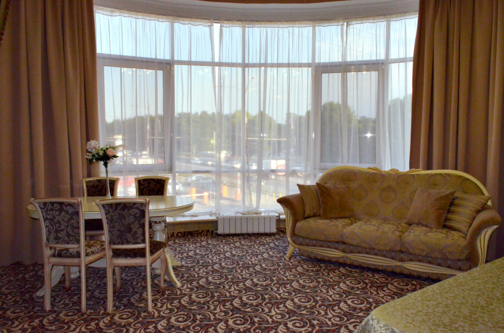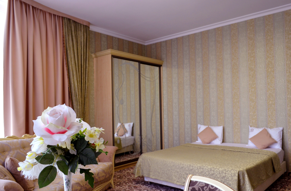 Люкс двухкомнатный, общая площадь 70 м2. В номере спальня с одной большой двухспальной кроватью и зал с раскладным диваном и обеденным столом, предметами сервировки на 4 персоны.