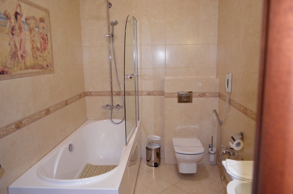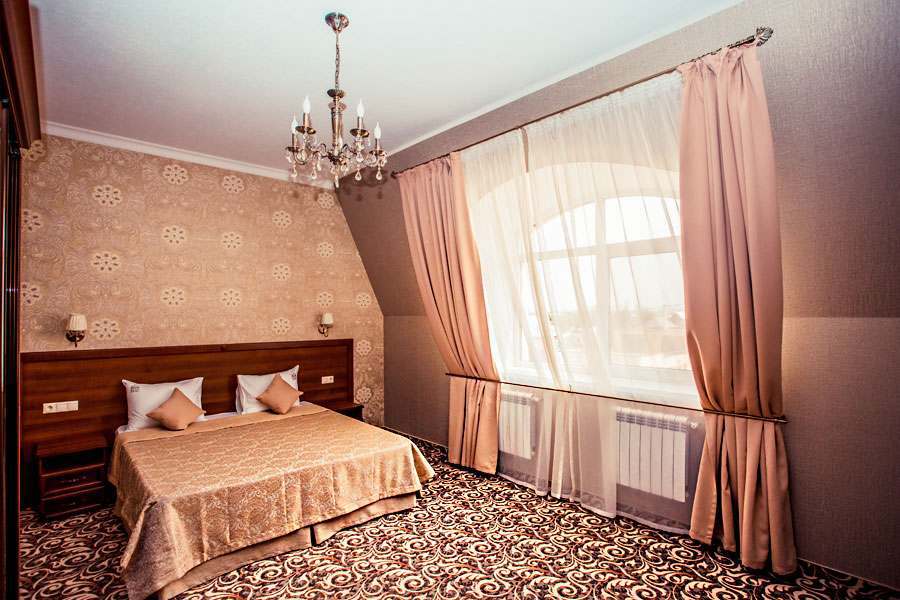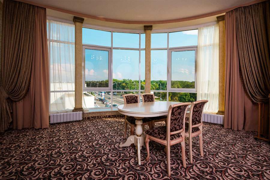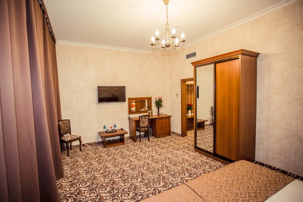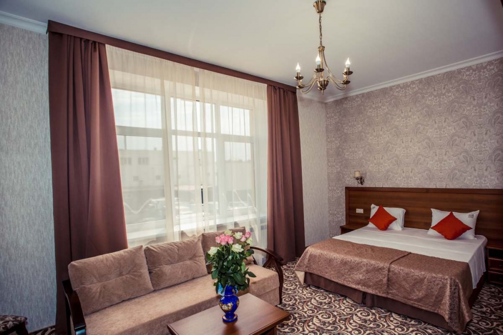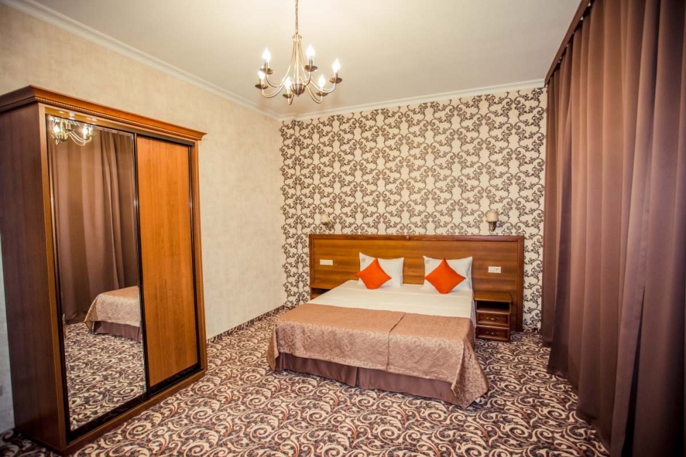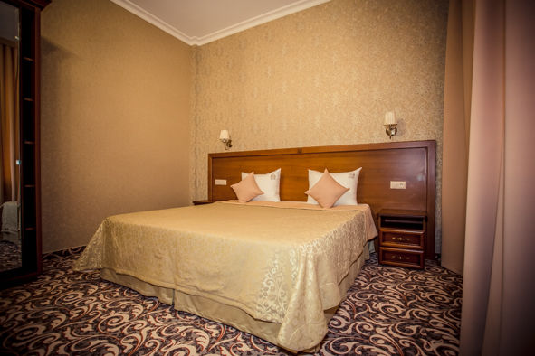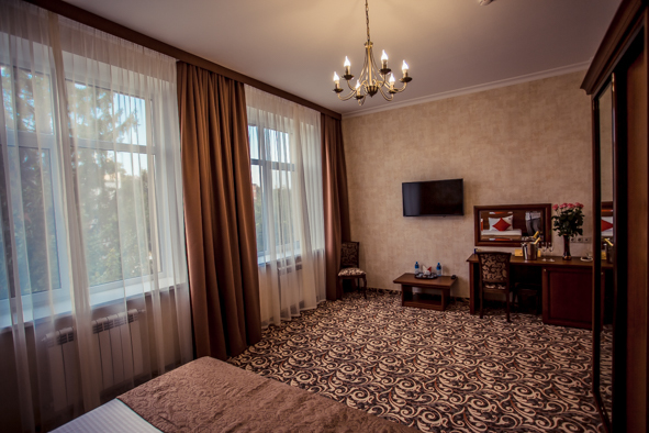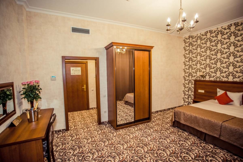 Люкс двухкомнатный, общая площадь 70 м2. В номере спальня с одной большой двухспальной кроватью и зал с раскладным диваном и обеденным столом, предметами сервировки на 4 персоны.