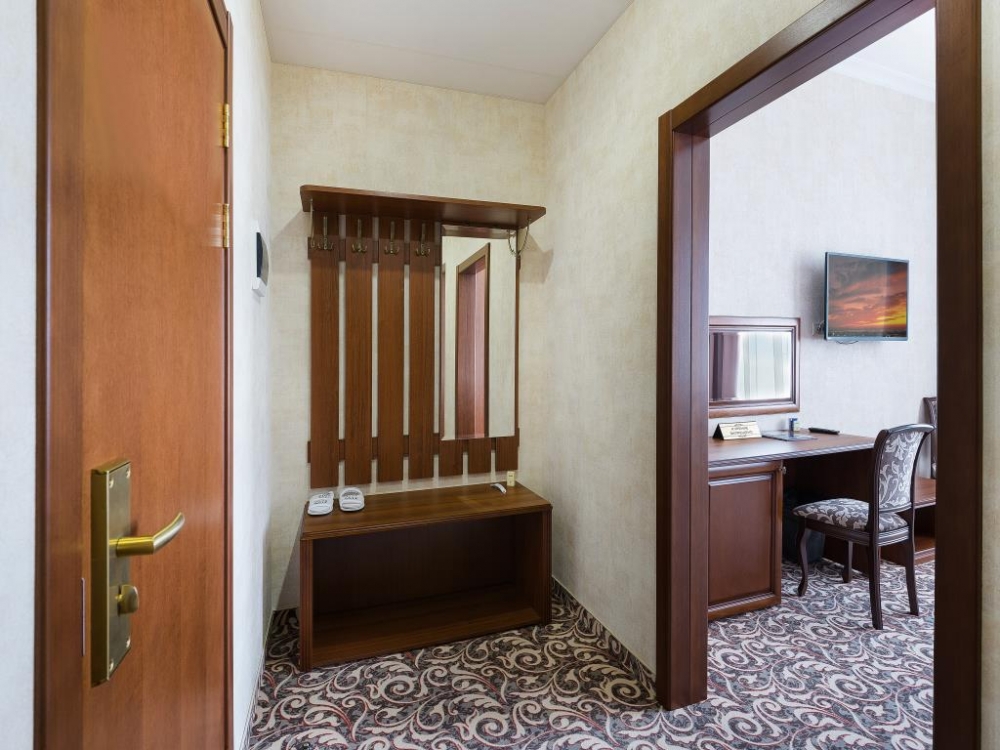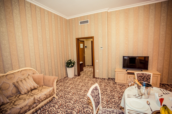 Люкс. 2 комнаты. В номере спальня с одной большой двухспальной кроватью и гостиная с двуспальной кроватью и диваном, также в номере есть обеденный стол, предметы сервировки на 4 персоны.