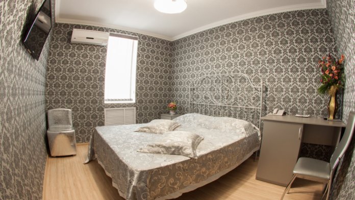 Номер меблирован двуспальной кроватью с ортопедическим матрасом и небольшим французским диванчиком для отдыха. Номер разделен на зону сна и зону отдыха.