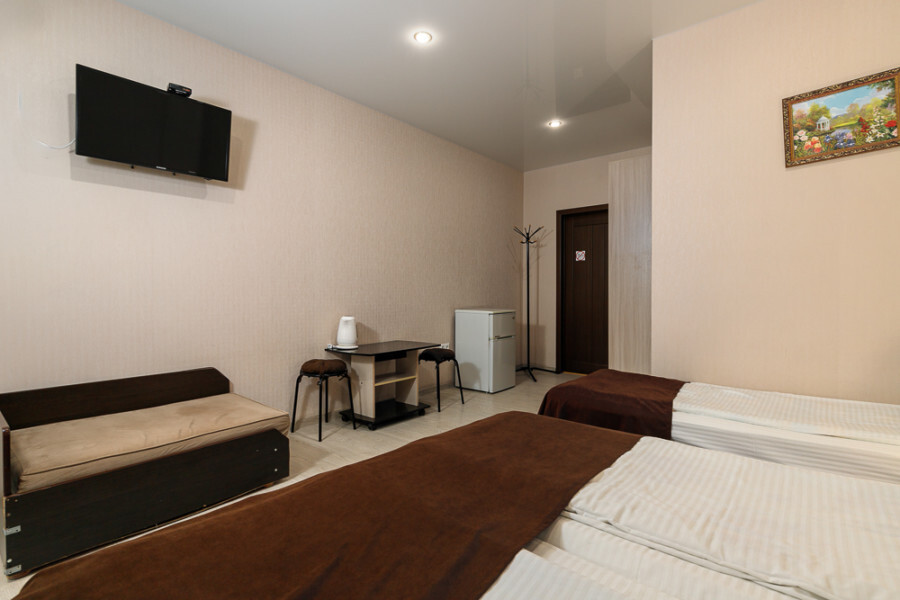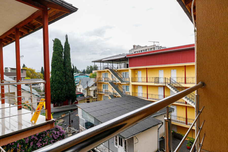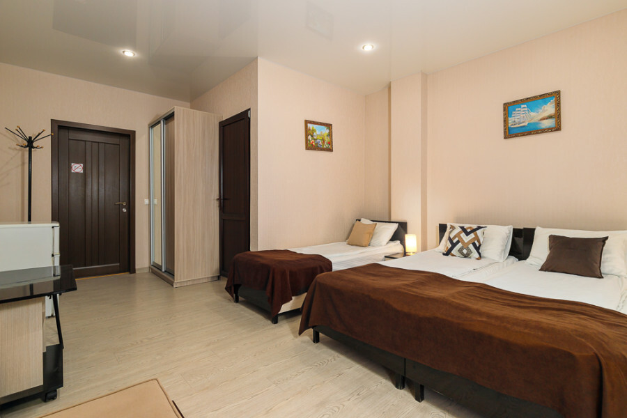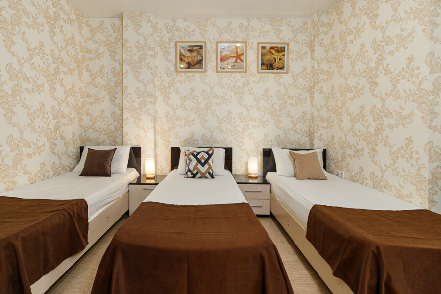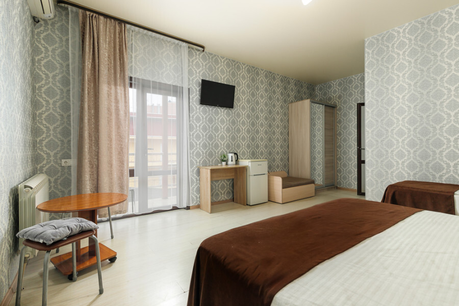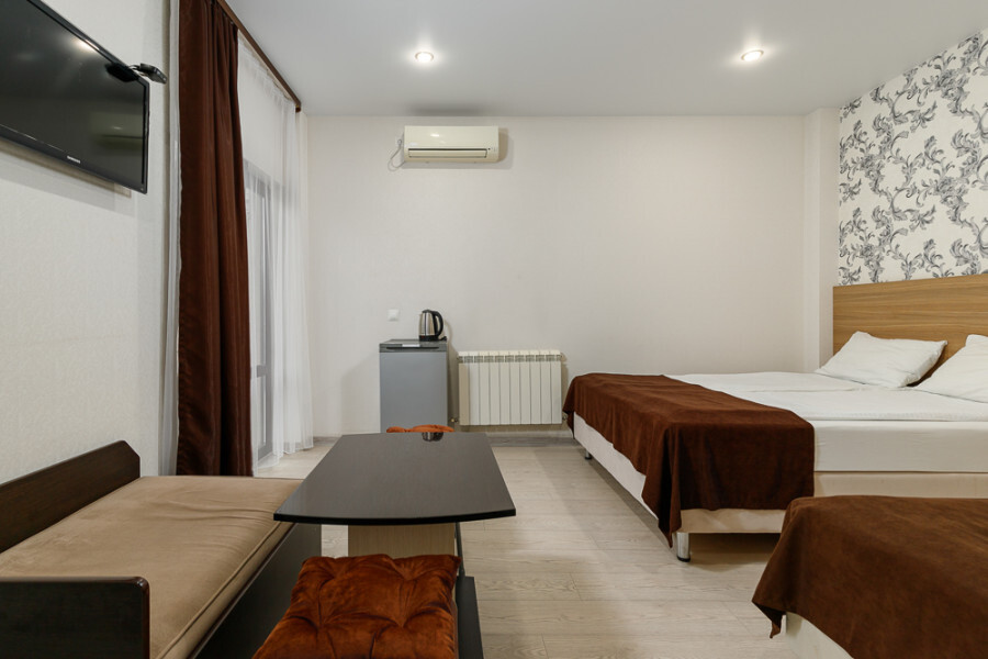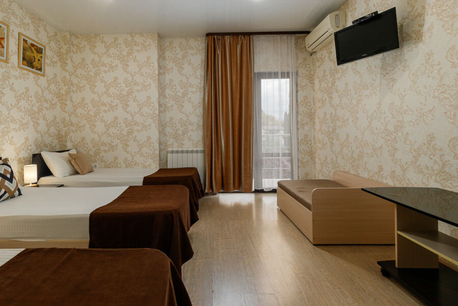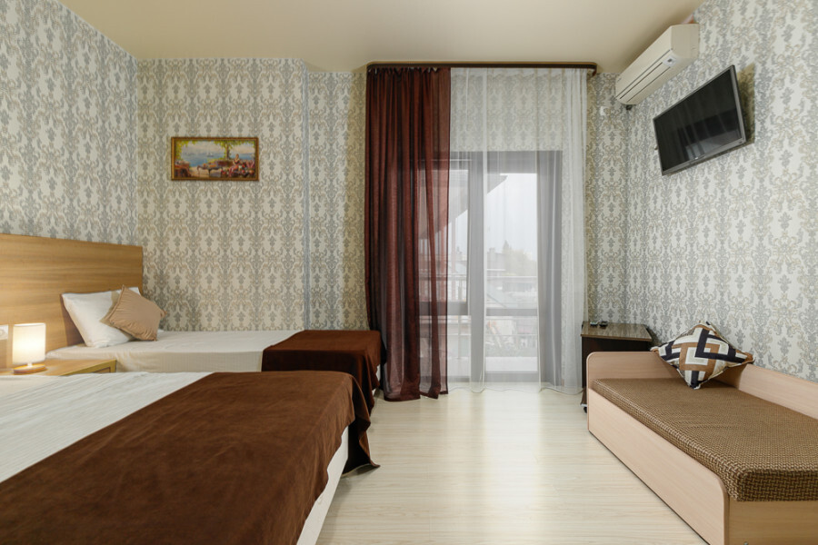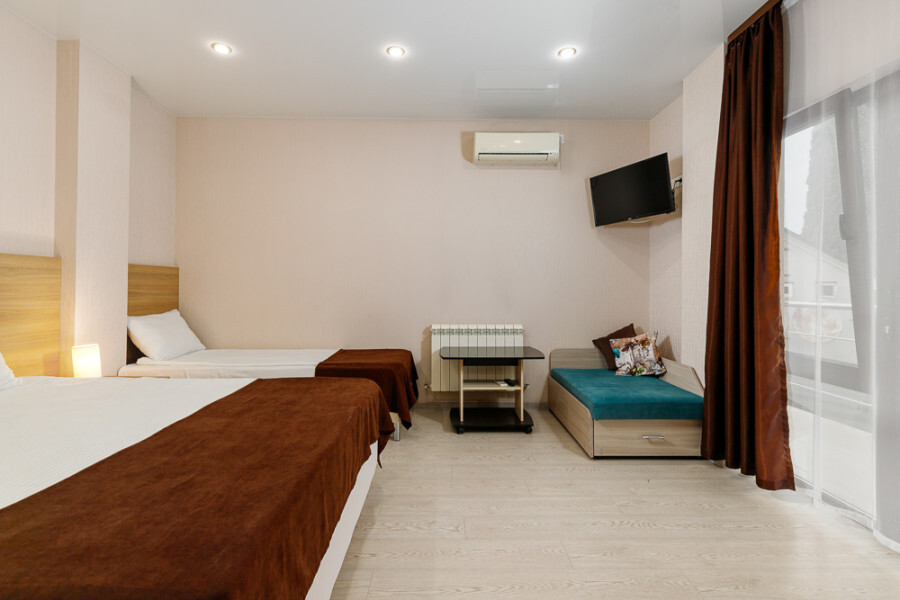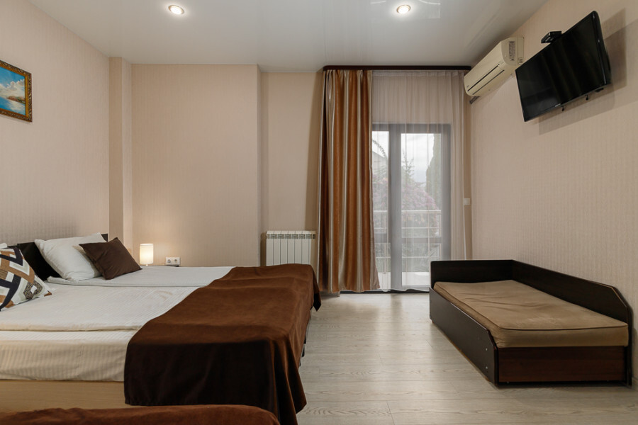 Комфортный семейный номер с одной 2-спальной, одной односпальной кроватью, диваном для 2 человек. Оснащён сплит-системой, электрическим чайником и спутниковым TV. Подойдет для размещения 5 человек. Датчик угарного газа обеспечивает безопасность. Напольное покрытие ламинат. В ванной комнате установлен душ и есть все необходимые туалетно-косметические принадлежности, фен и полотенца. С балкона открывается вид на дворик.