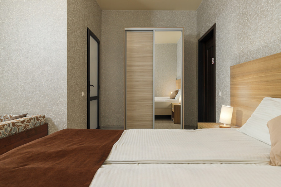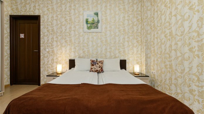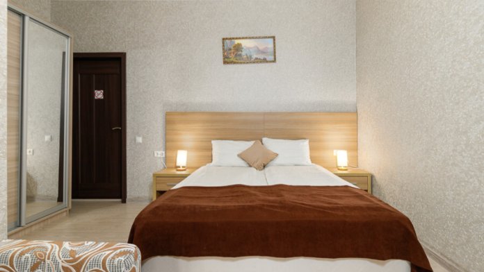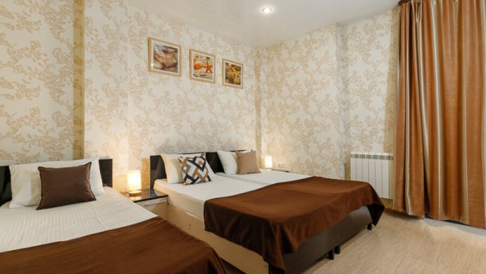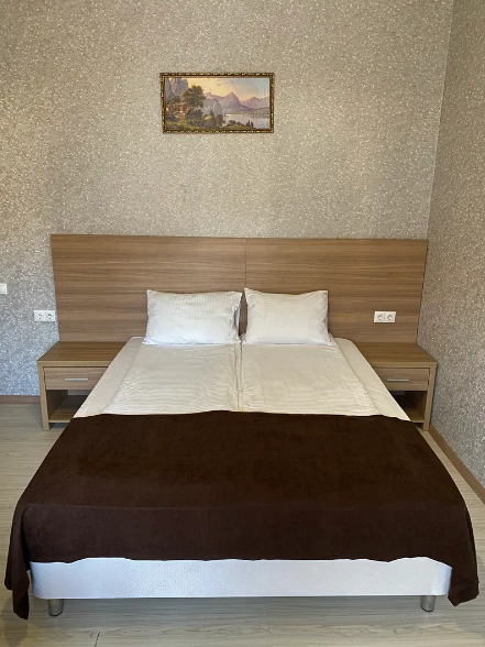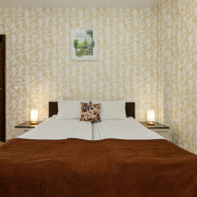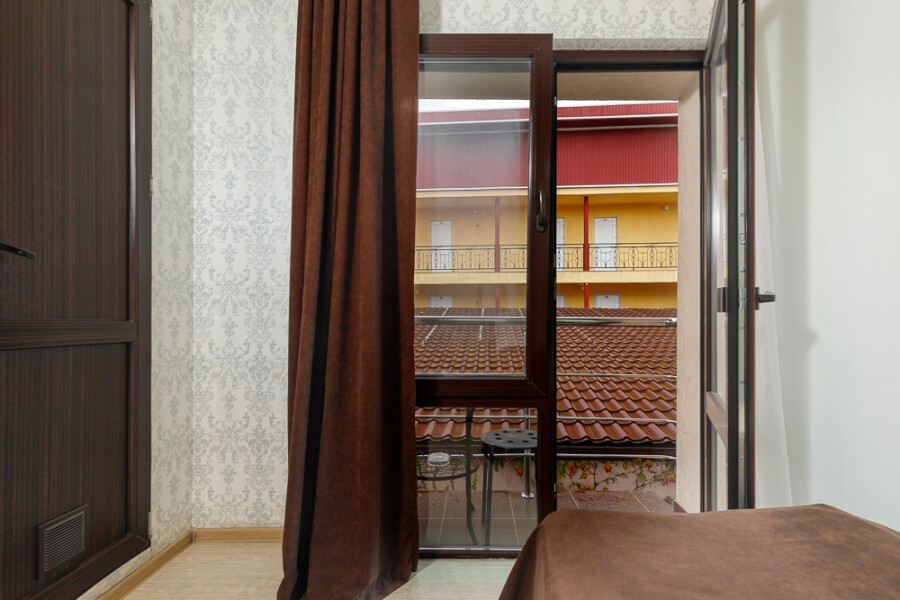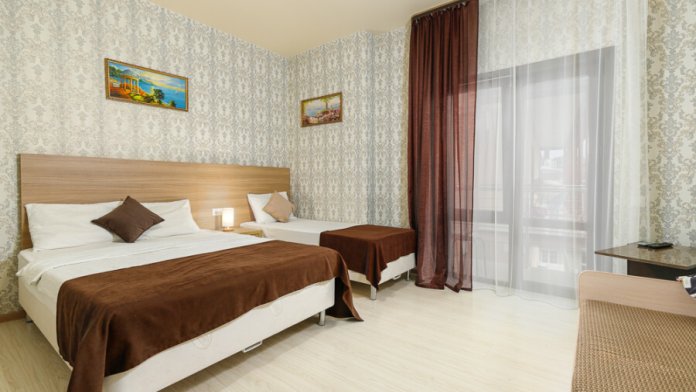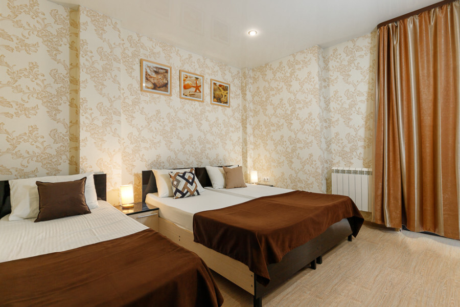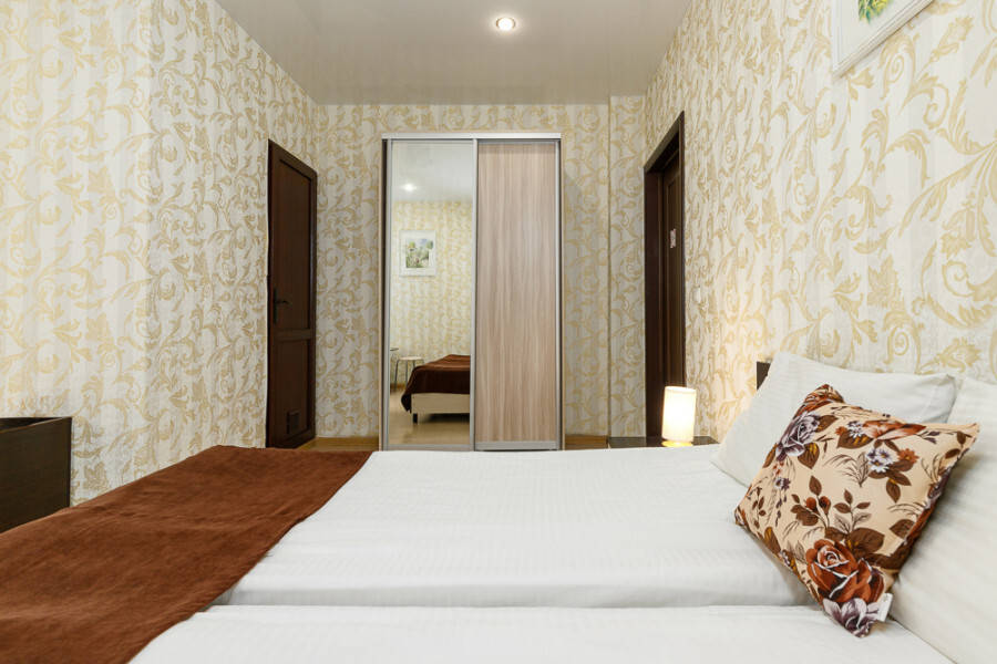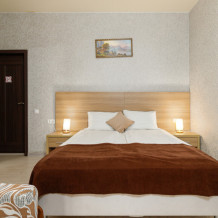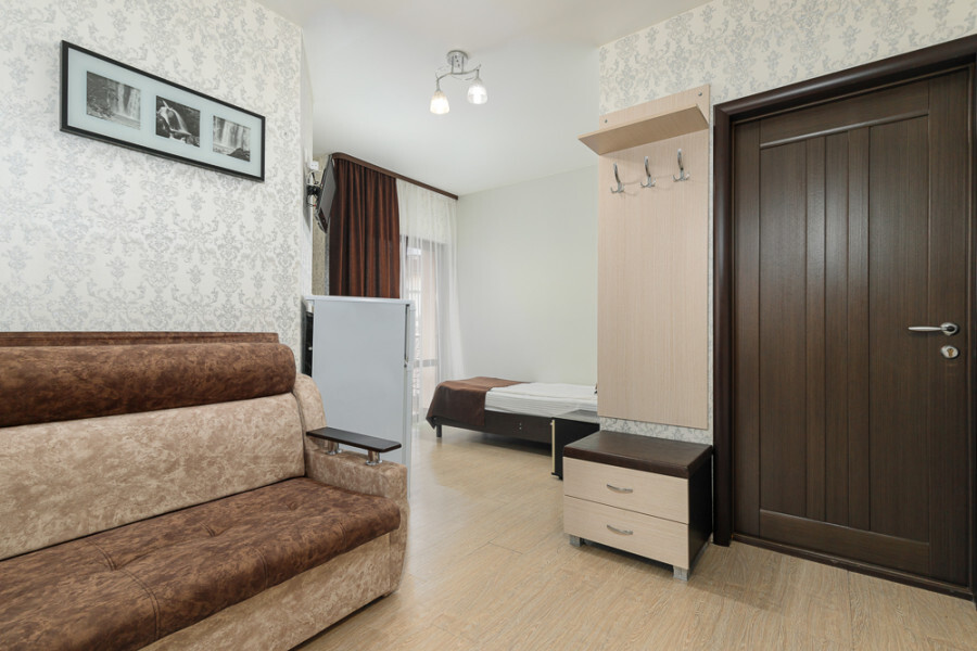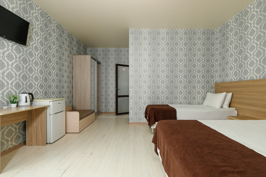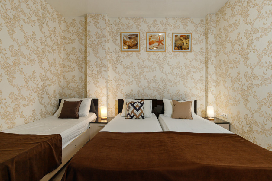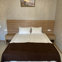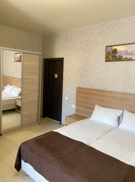 Комфортный семейный номер с одной 2-спальной, одной односпальной кроватью, диваном для 2 человек. Оснащён сплит-системой, электрическим чайником и спутниковым TV. Подойдет для размещения 5 человек. Датчик угарного газа обеспечивает безопасность. Напольное покрытие ламинат. В ванной комнате установлен душ и есть все необходимые туалетно-косметические принадлежности, фен и полотенца. С балкона открывается вид на дворик.