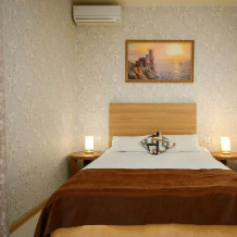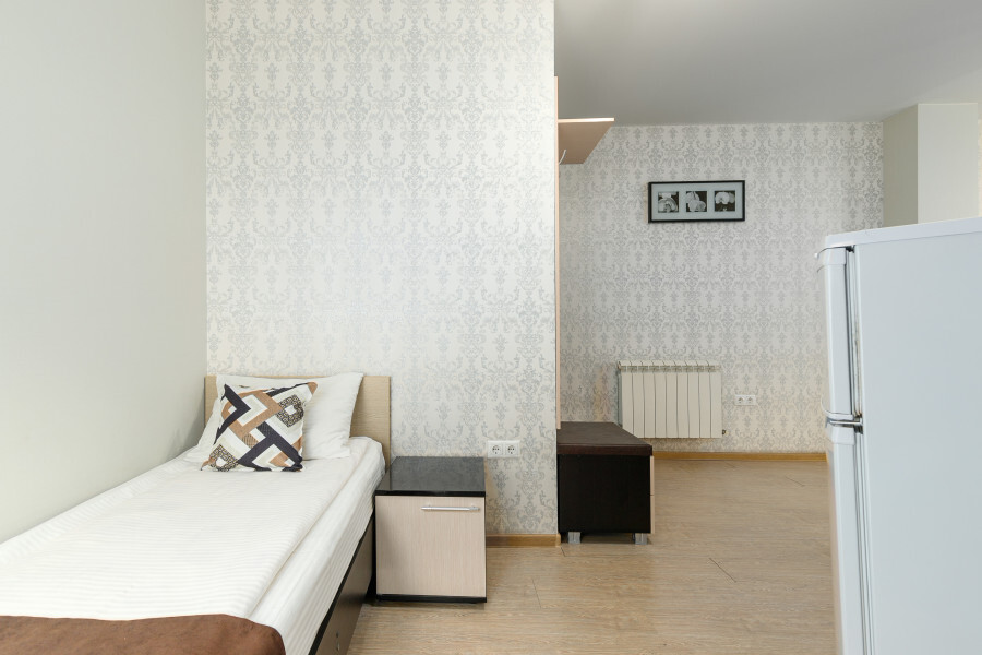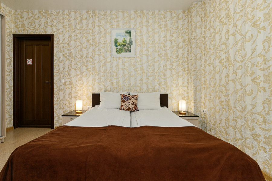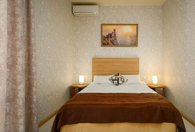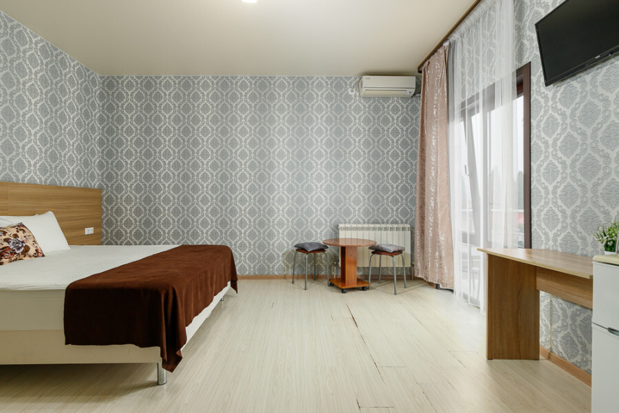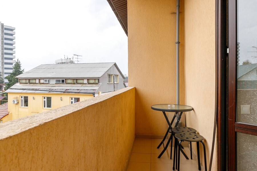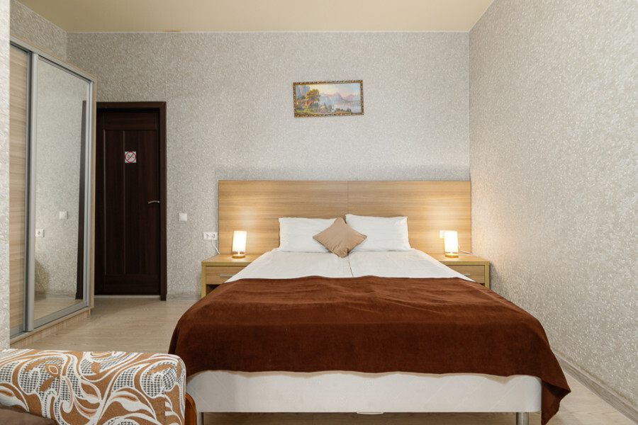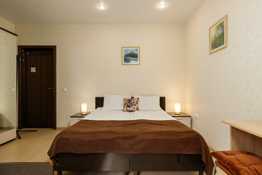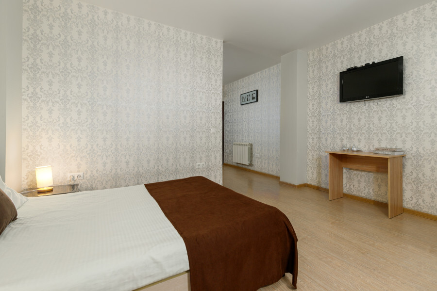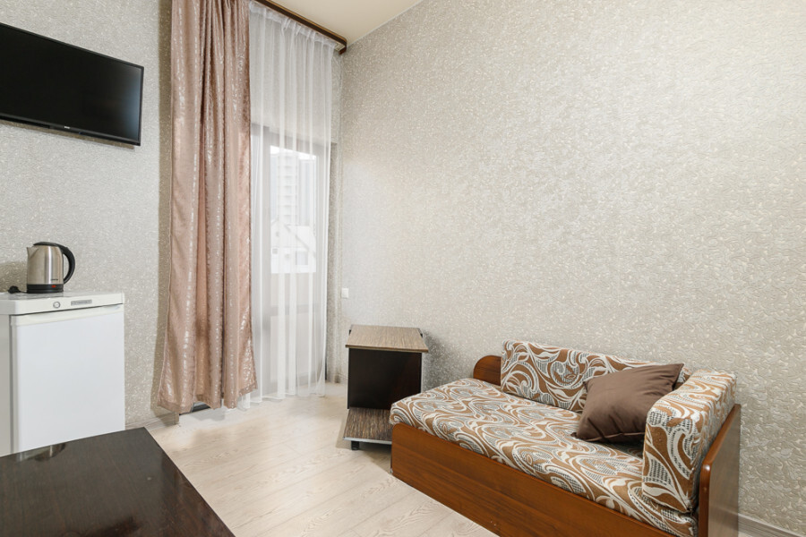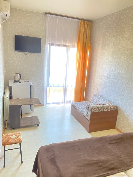 Комфортный 3-местный номер с одной 2-спальной кроватью и дополнительным местом (диван-софа для одного гостя). Оснащён сплит-системой, электрическим чайником и спутниковым TV. Подойдет для размещения 3 человек. Датчик угарного газа обеспечивает безопасность. Напольное покрытие - ламинат. В ванной комнате установлена ванна и есть все необходимые туалетно-косметические принадлежности, фен и полотенца. С балкона открывается вид на город.