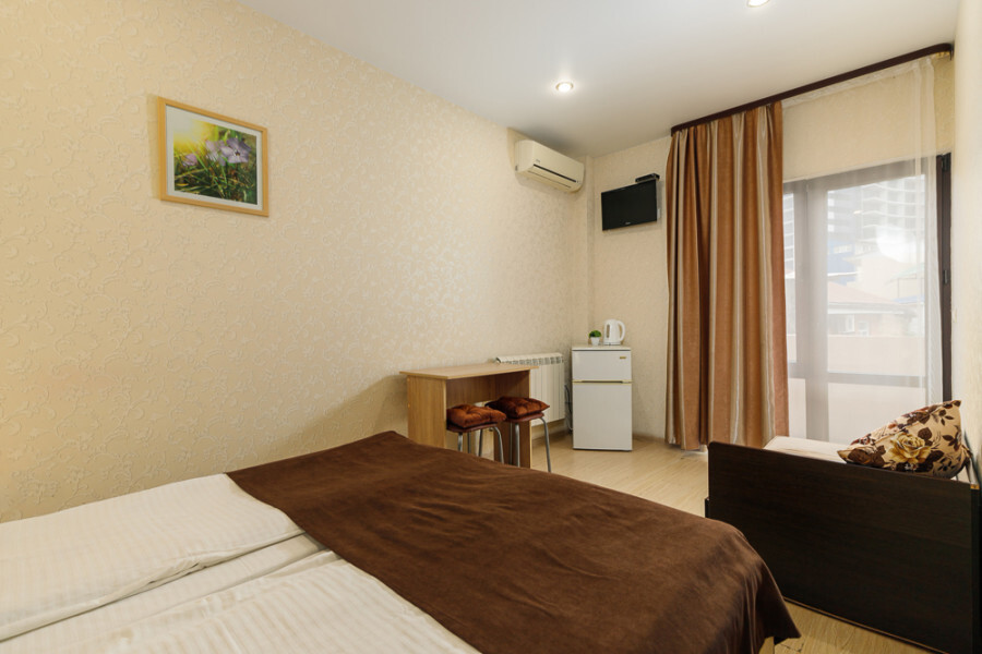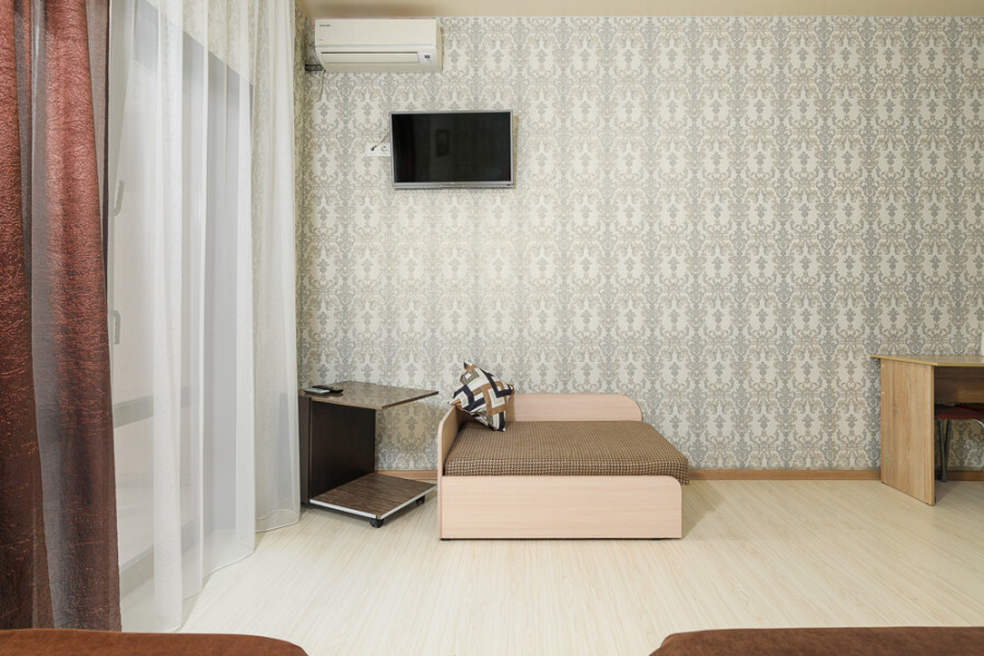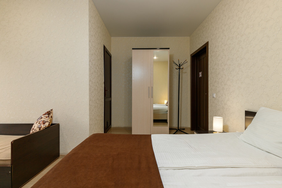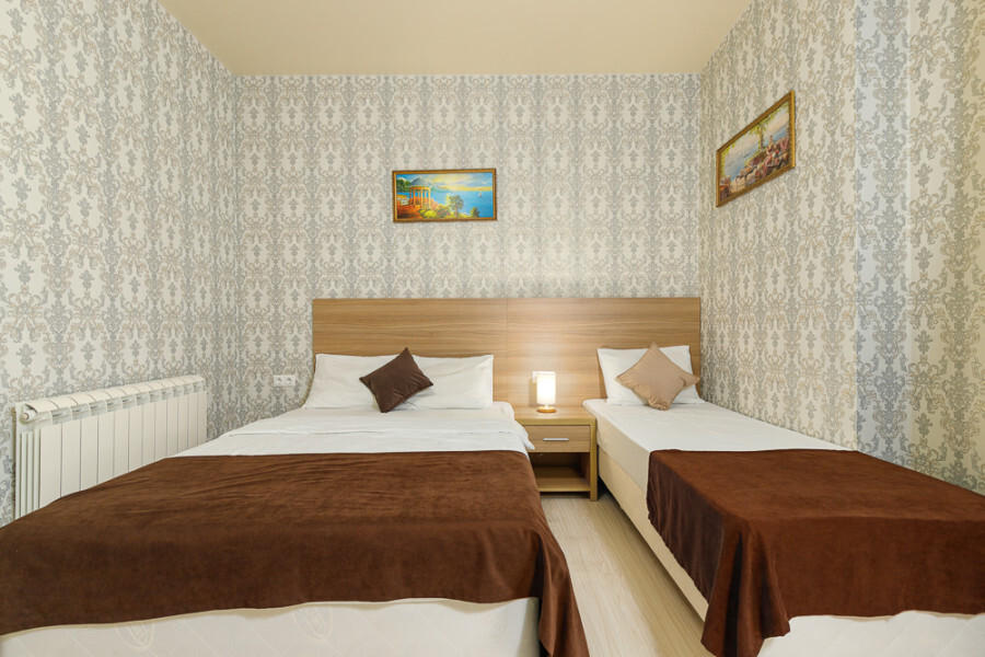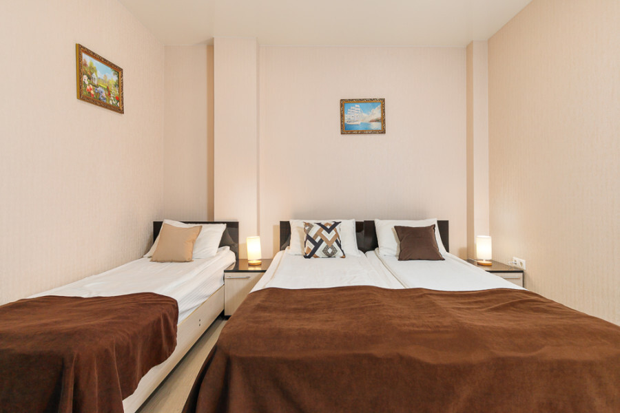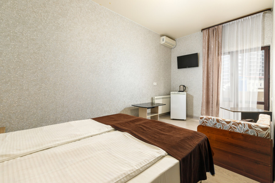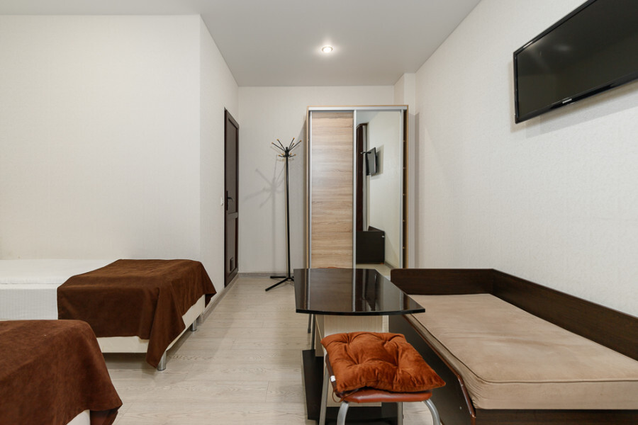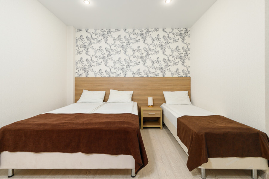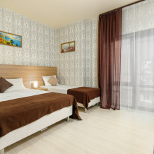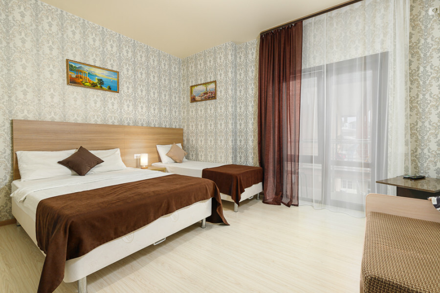Комфортный 3-местный номер с 2 раздельными кроватями и дополнительным местом (диван-софа для одного гостя). Оснащён сплит-системой, электрическим чайником и спутниковым TV. Подойдет для размещения 3 человек. Датчик угарного газа обеспечивает безопасность. Напольное покрытие - ламинат. В ванной комнате установлена ванна и есть все необходимые туалетно-косметические принадлежности, фен и полотенца. С балкона открывается вид на город.