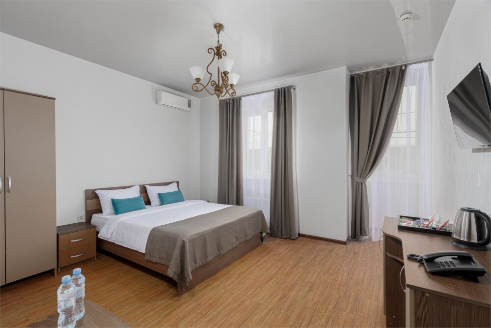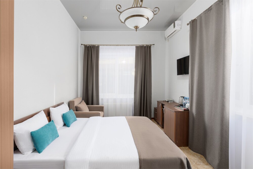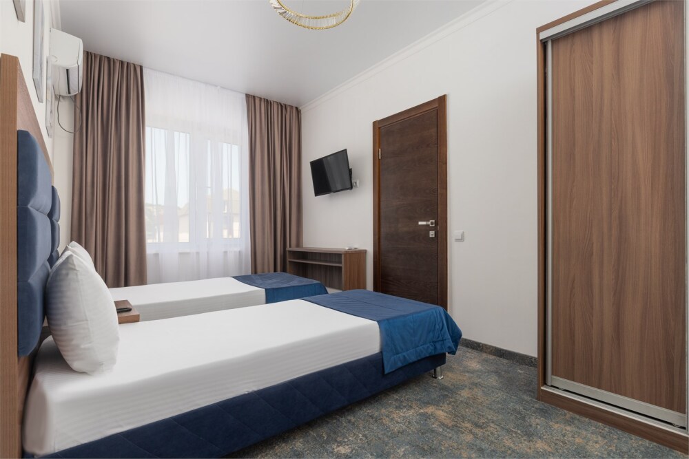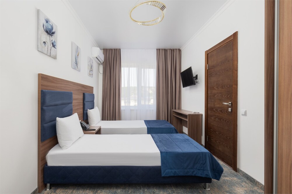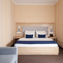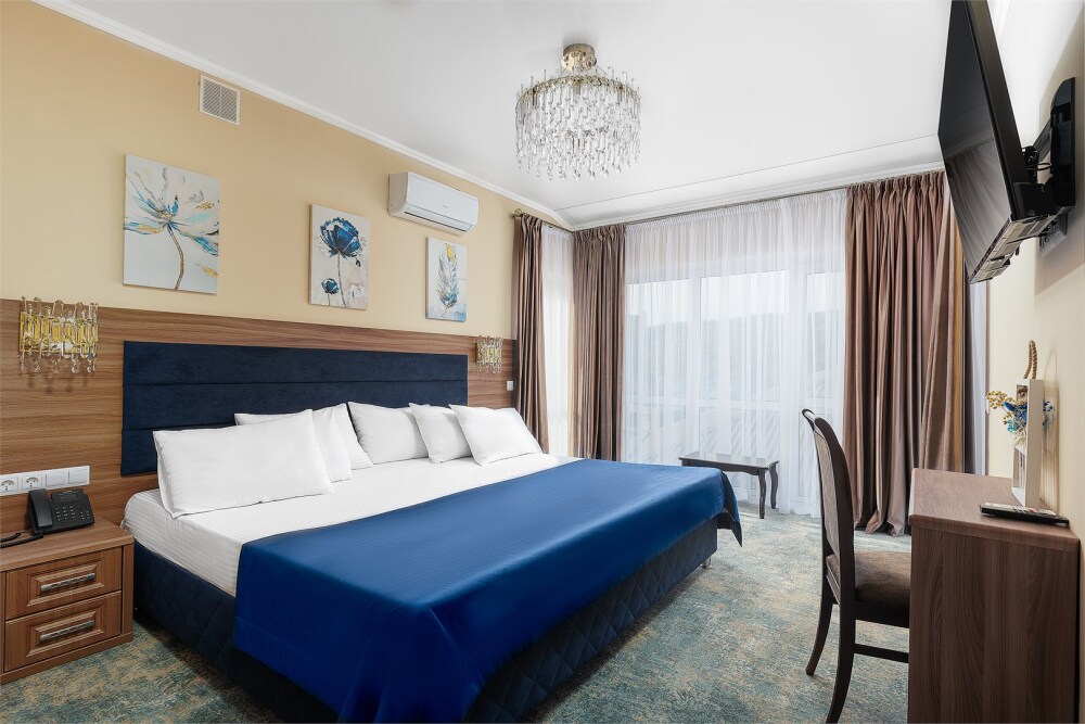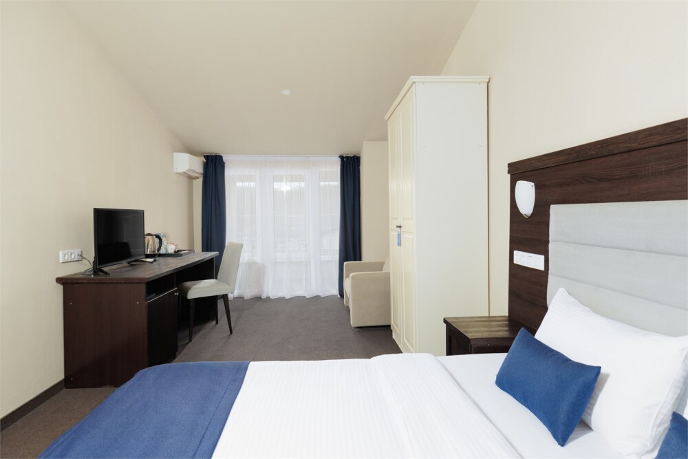 Номера Standard оснащены эргономичной мебелью, предусмотрено место для багажа, сейф. Ванная комната, фен, косметические принадлежности. Один ребёнок до 3 лет — можно без отдельного спального места.