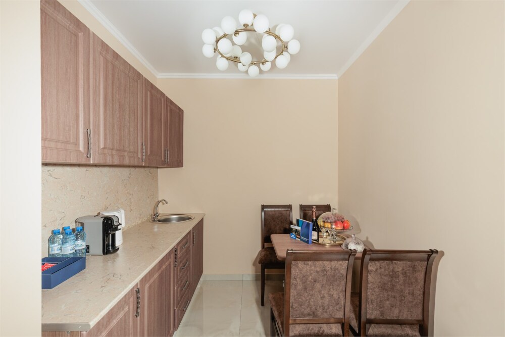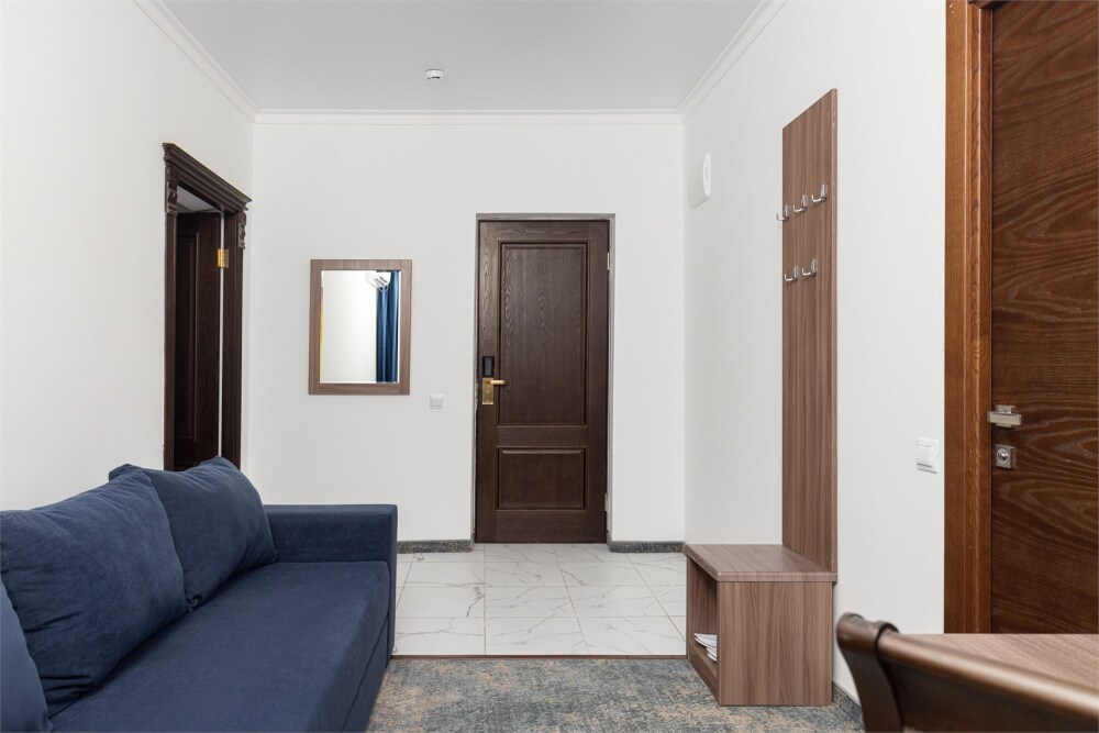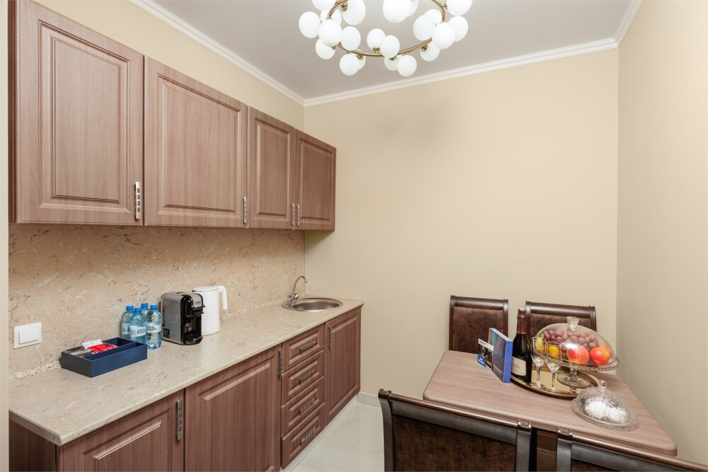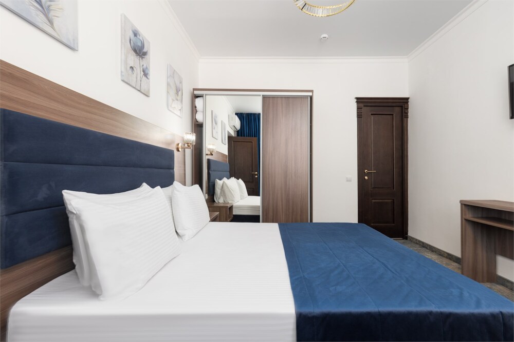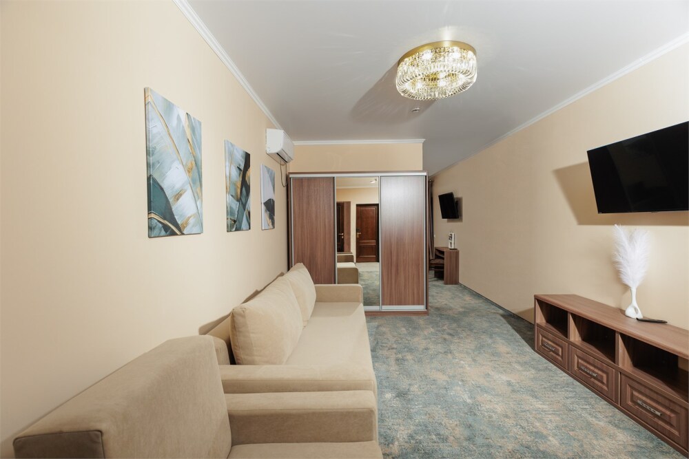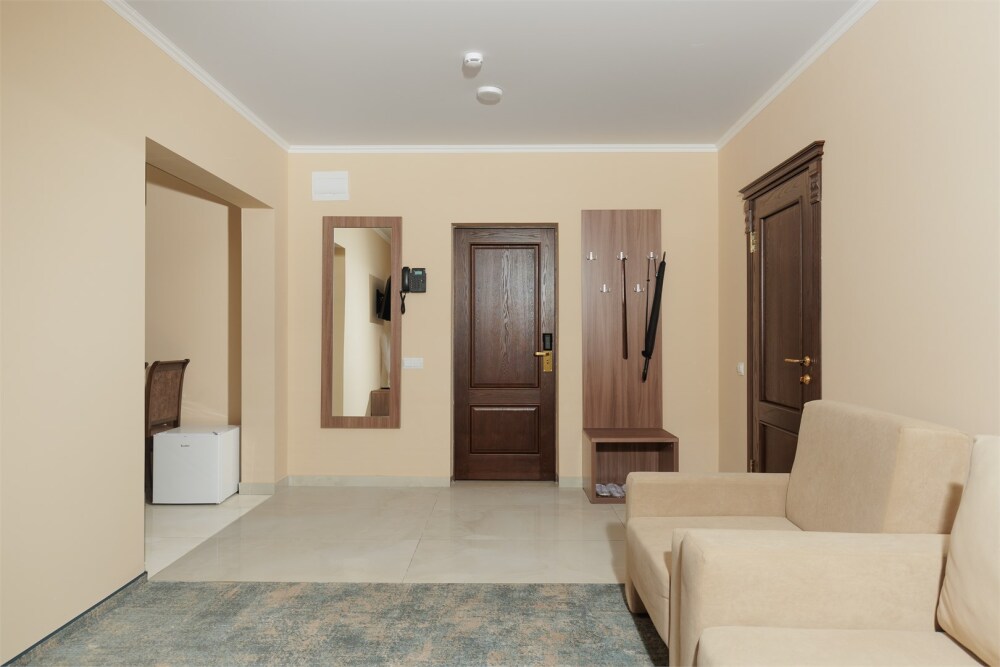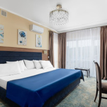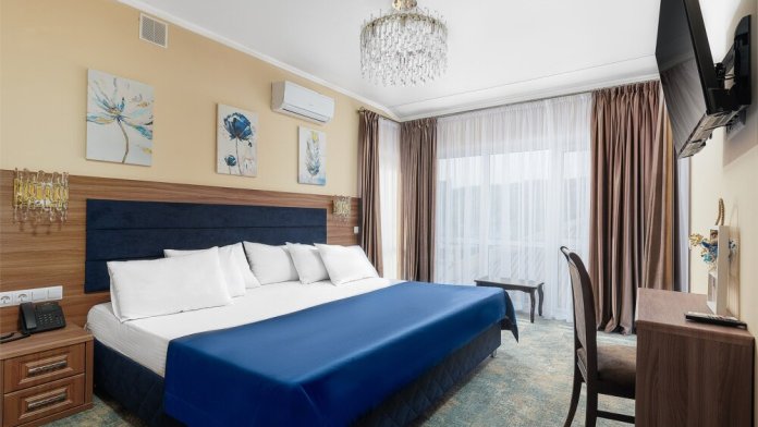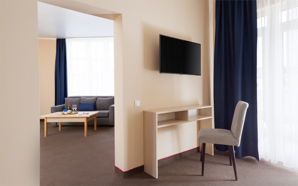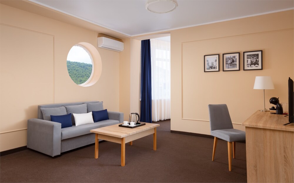 Suite Deluxe большой двухкомнатный номер: двуспальная кровать, раскладной диван, кресло, ванная комната, фен, косметические принадлежности. В номере: сплит-система, мини-холодильник, телевизор, гардеробный шкаф, зеркало, рабочий стол, стул, сейф, место для хранения багажа. Один ребёнок до 3 лет — можно без отдельного спального места.
