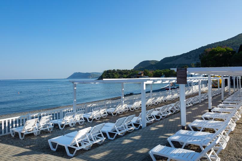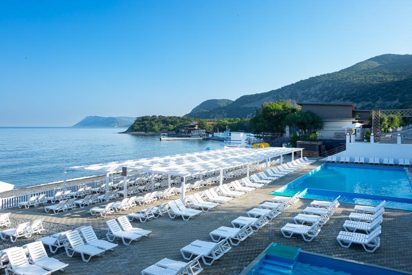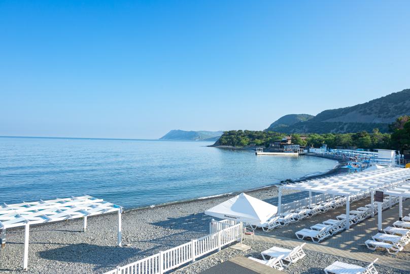 В 3 километрах от отеля расположен галечный пляж с пологим дном и плавным входом в море. Пляж расположен в окружении живописных гор природного заказника «Большой Утриш». Вода здесь очень чистая и не подвержена цветению, в отличие от песчаных пляжей. Пляж оборудован туалетами, душевыми кабинами, станцией питания в формате Ультра все включено, двумя бассейнами с морской водой. До пляжа курсирует шаттл. Режим работы пляжа: с 8:00 до 20:00.