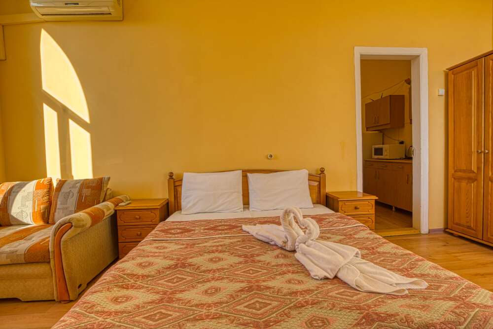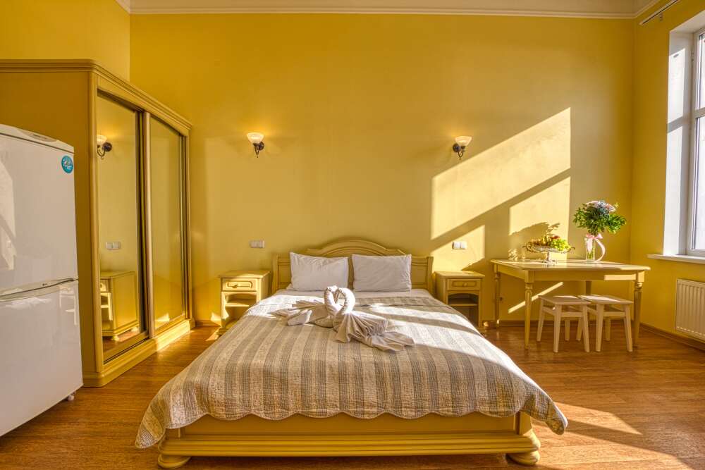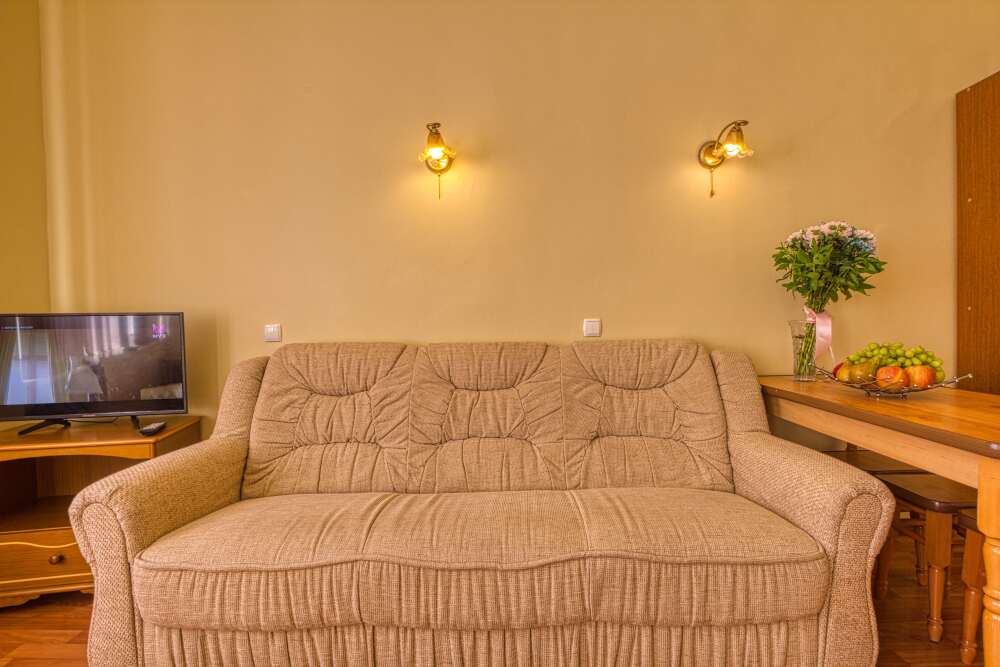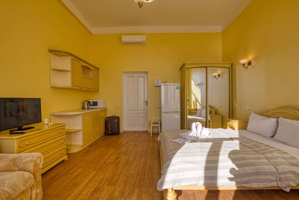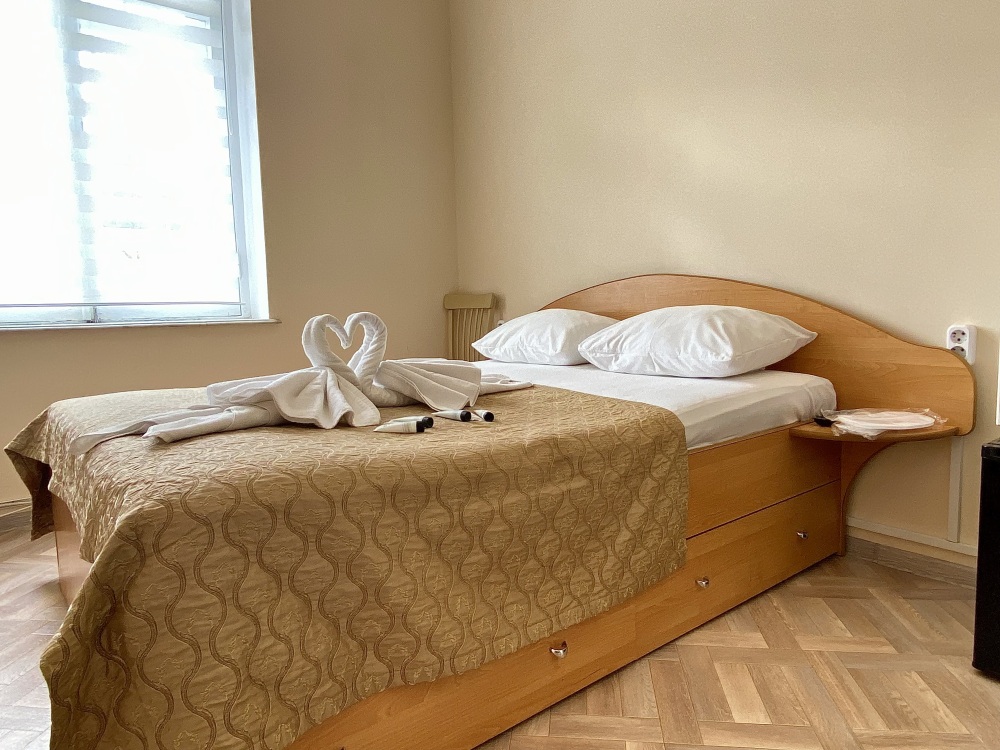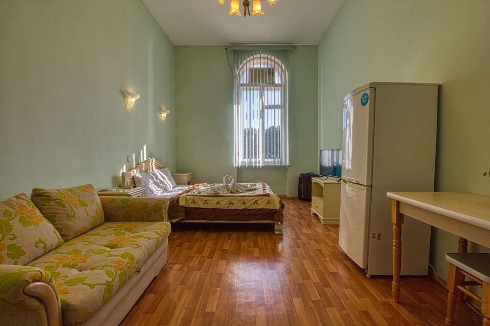 Однокомнатный номер общей площадью 25 м², c двуспальной кроватью и дополнительным местом в виде раскладного дивана.
