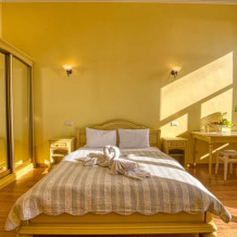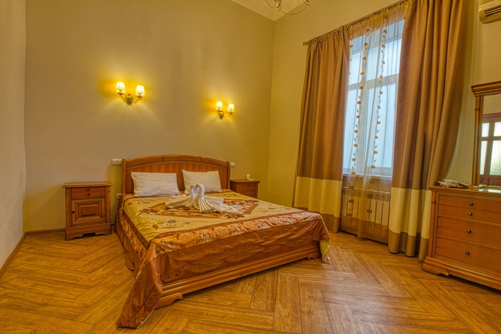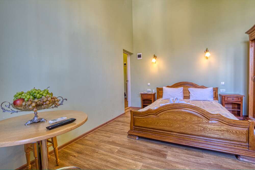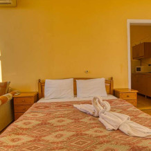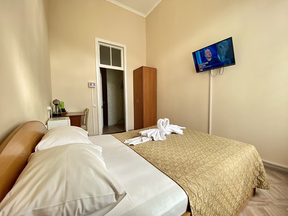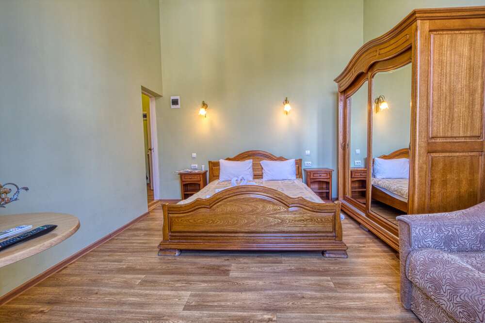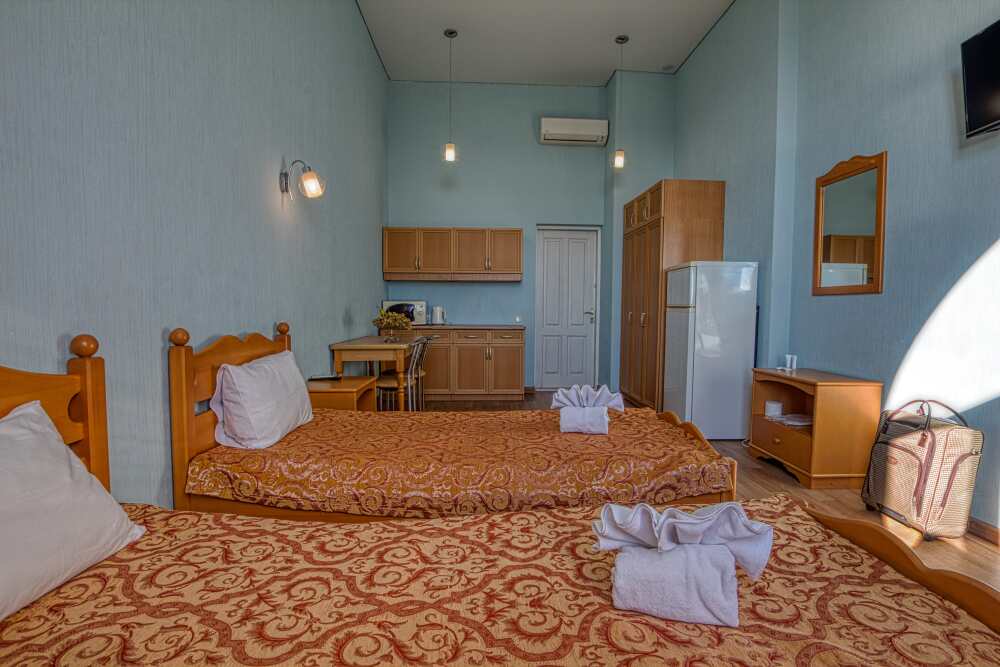 В номере расположена двуспальная кровать, весь необходимый комплект мебели, кондиционер, телевизор. Для дополнительных мест предусмотрены односпальные кровати, раскладные мягкие кресла.