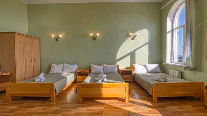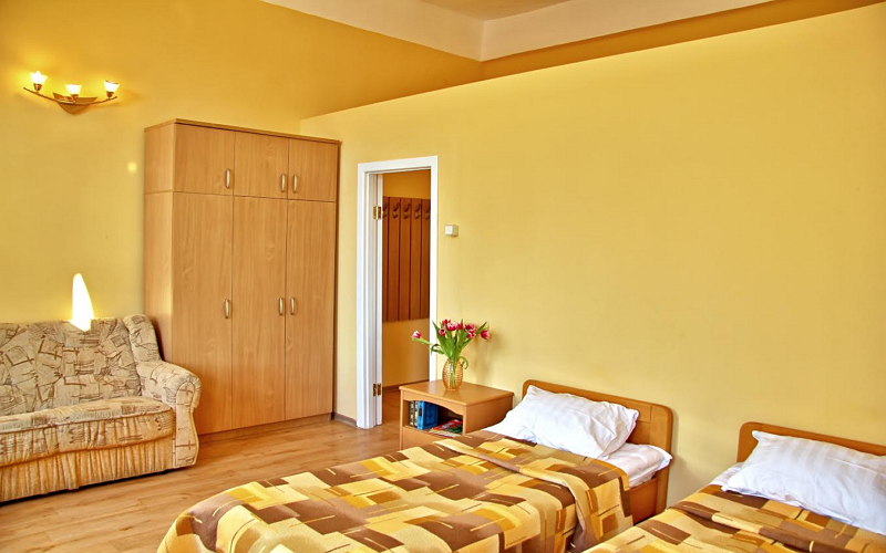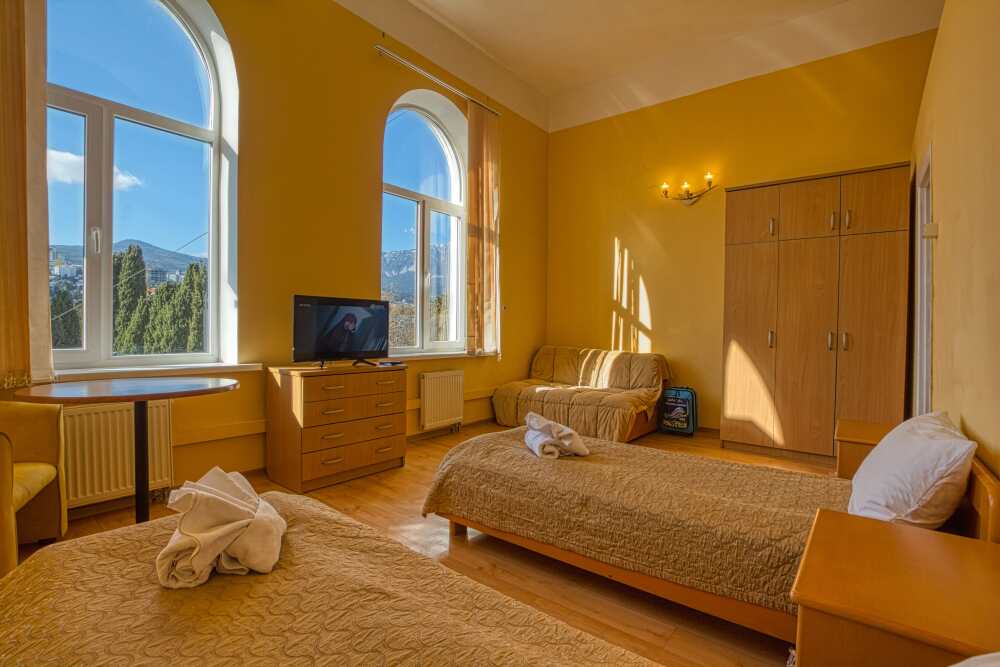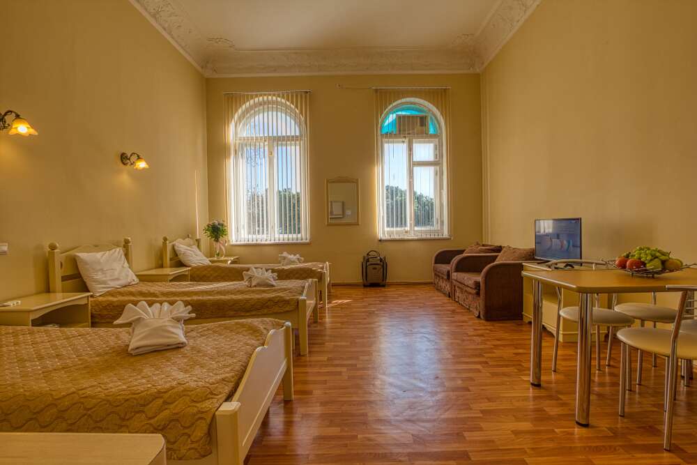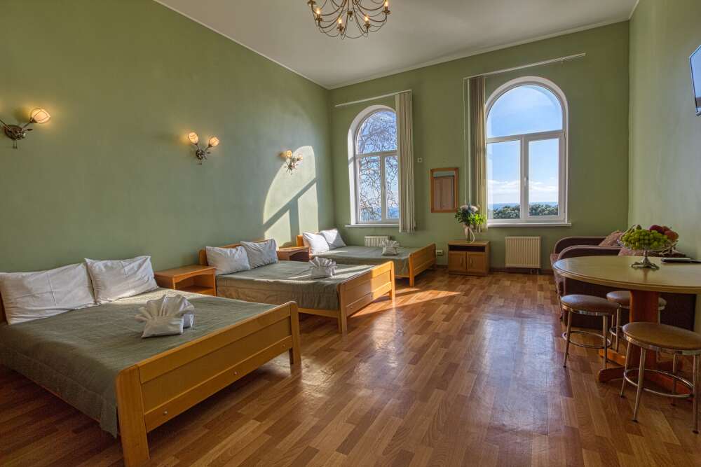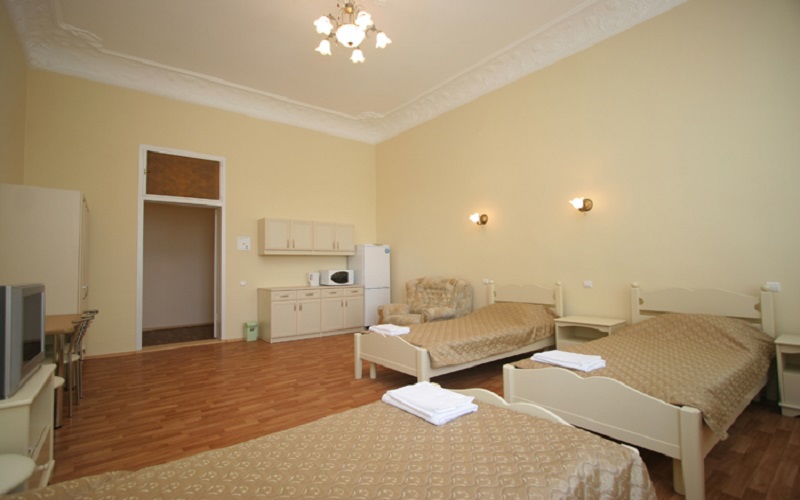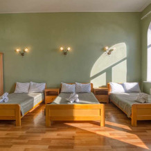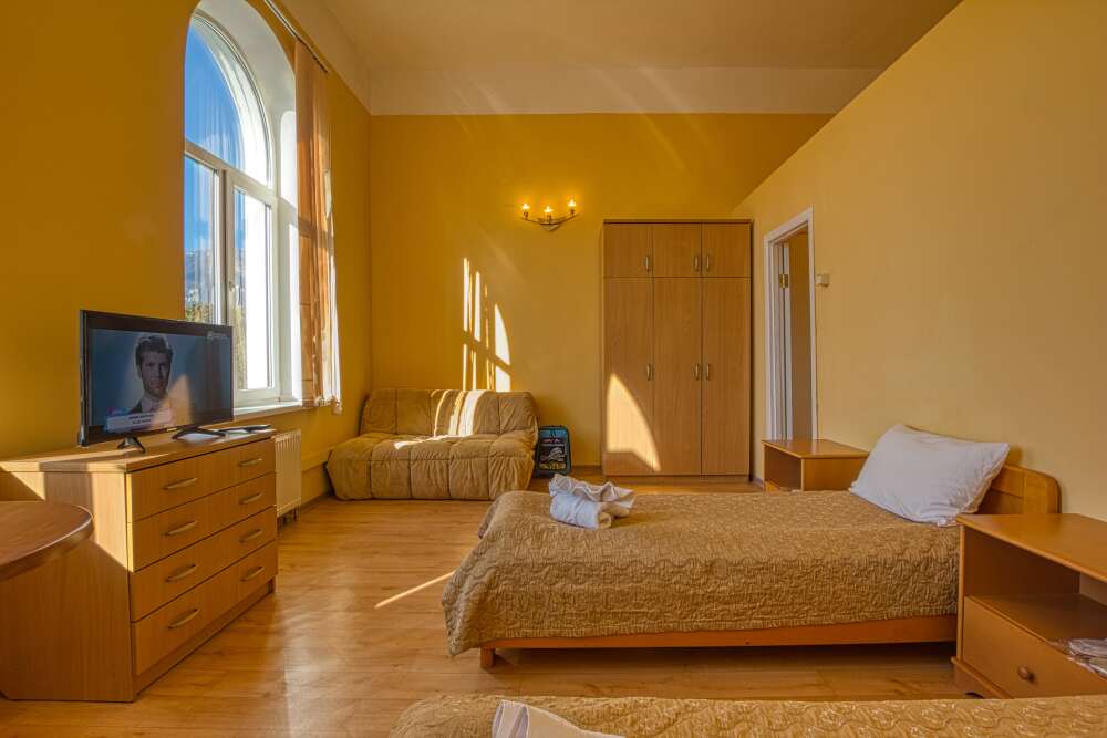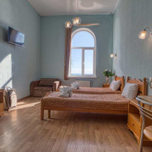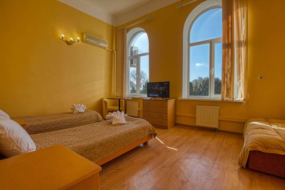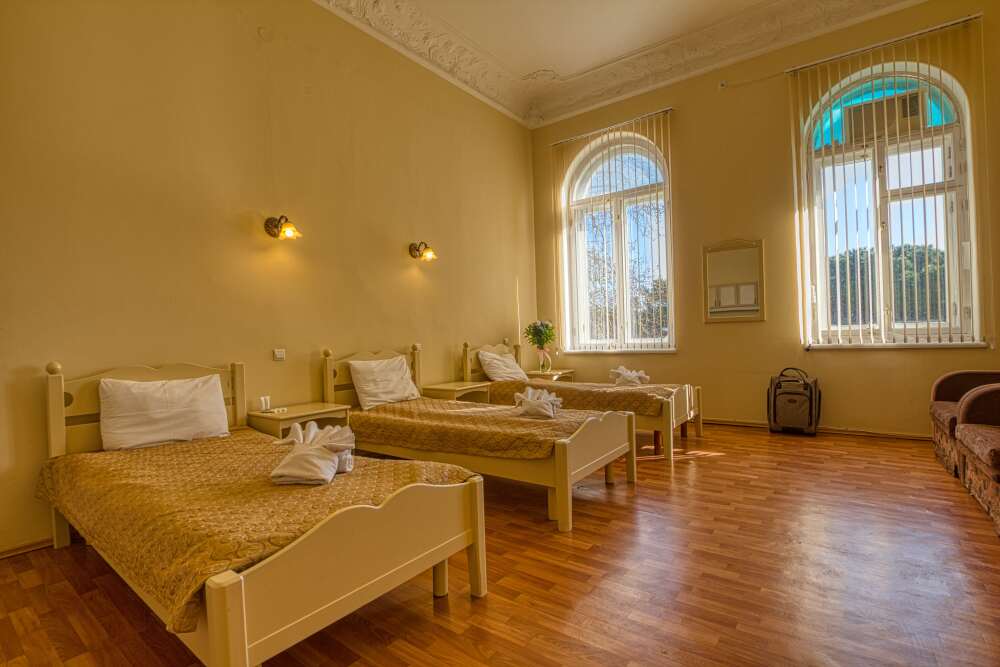 Просторный трехместный номер оборудована 3 раздельными односпальными или полутороспальными кроватями общей площадью 30м2. Дополнительное место - раскладной диван.