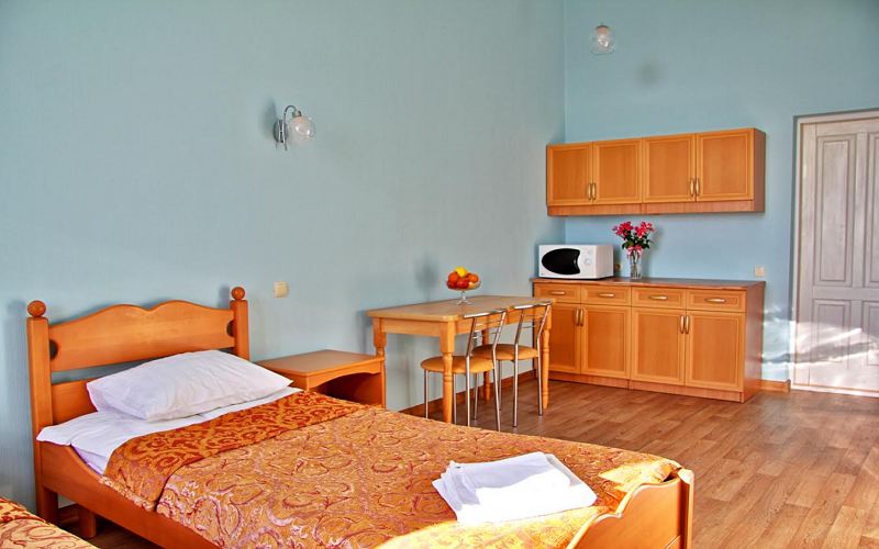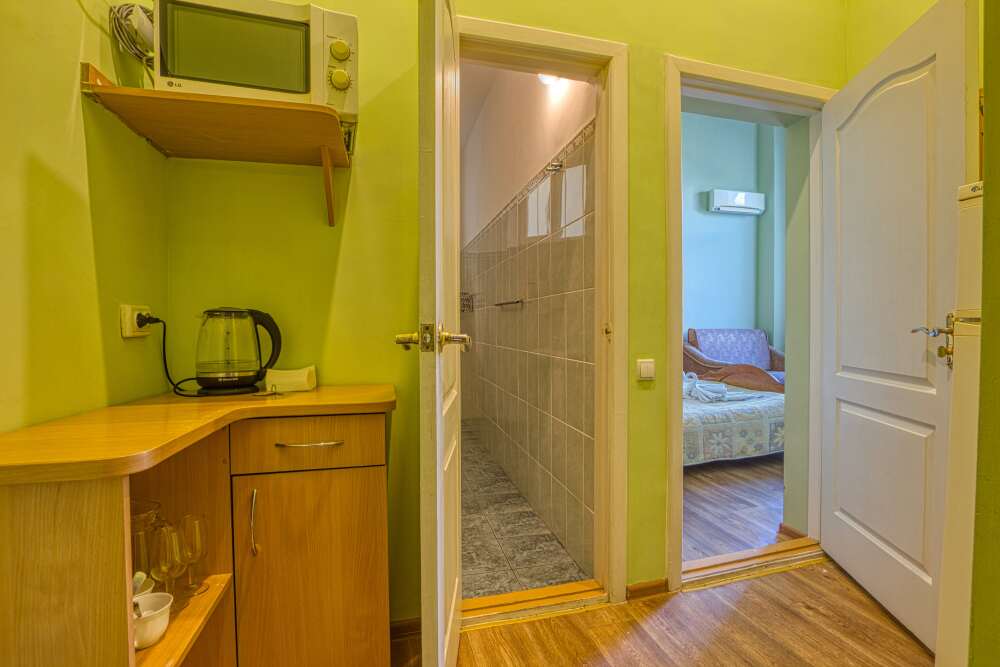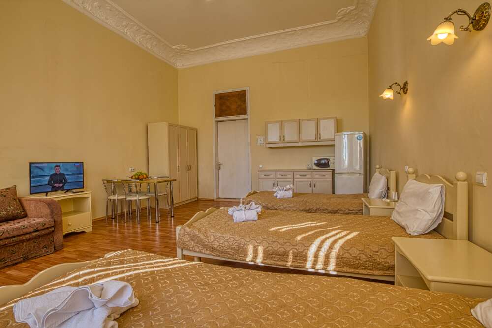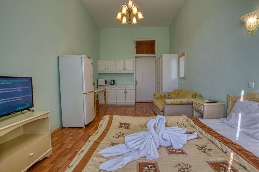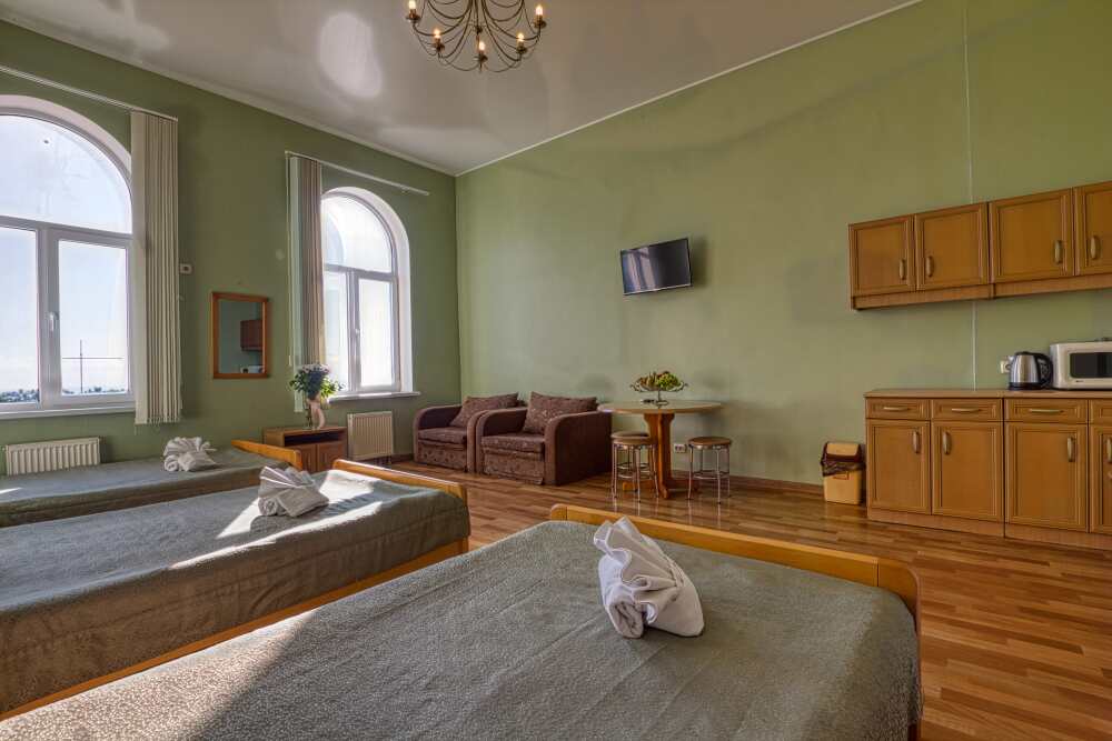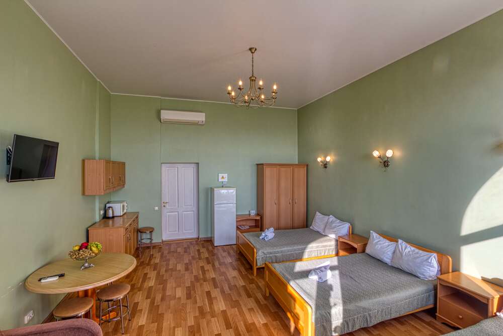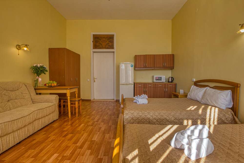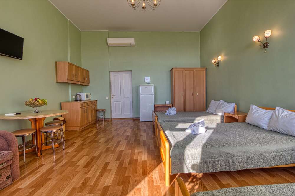 Номер состоит из спальни с одной семейной кроватью, гостиной, в которой расположен раскладной диван, и оборудованной мини-кухней, отдельный санузел и душевая кабина, что позволит разместиться трем-четырем человек.