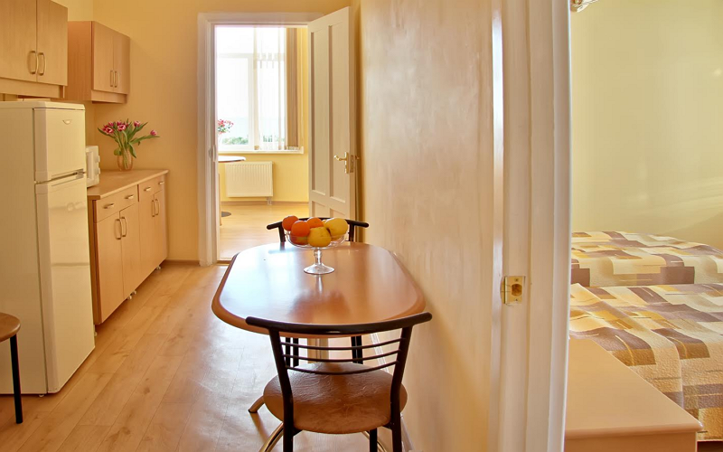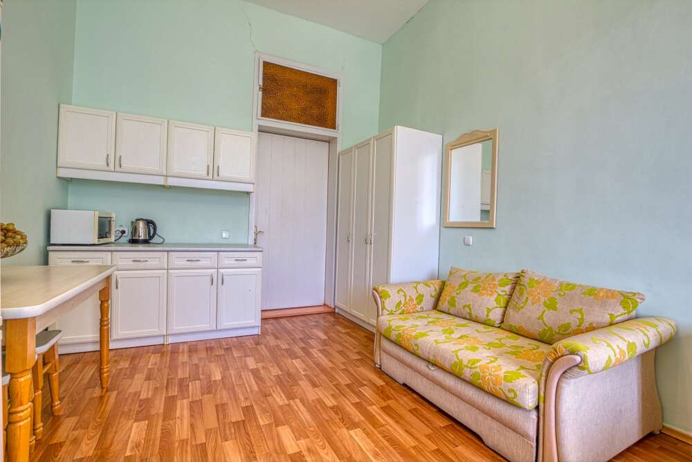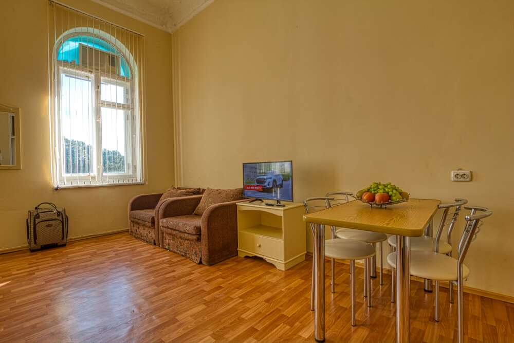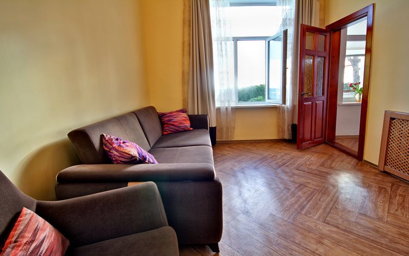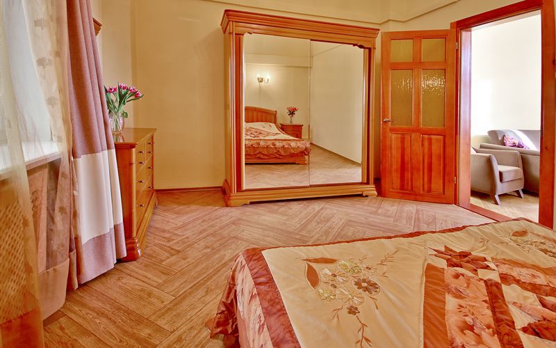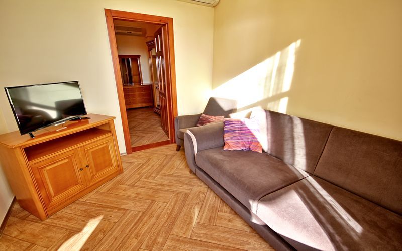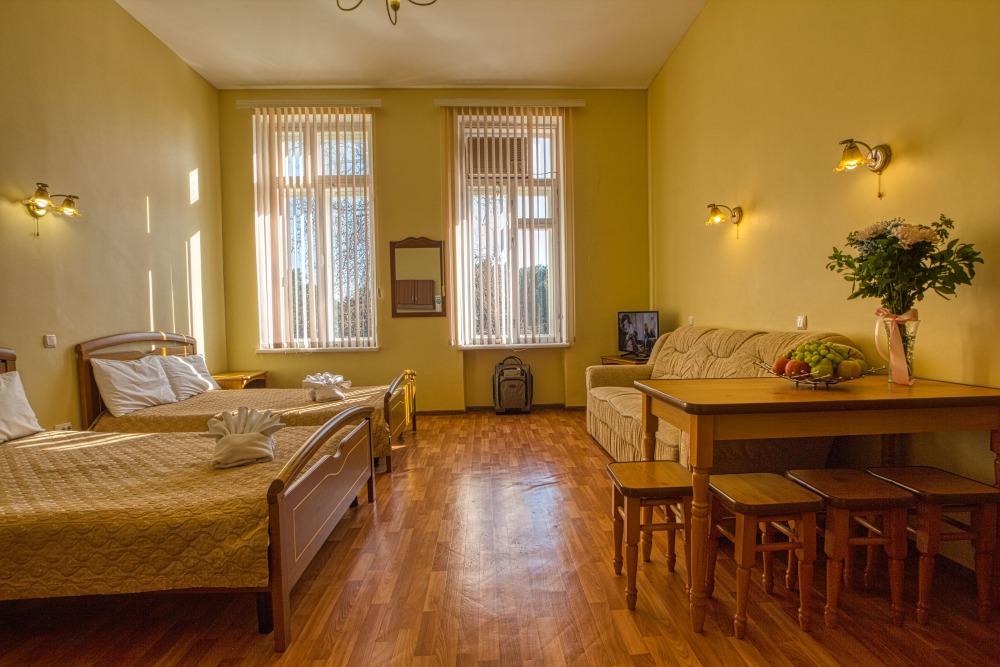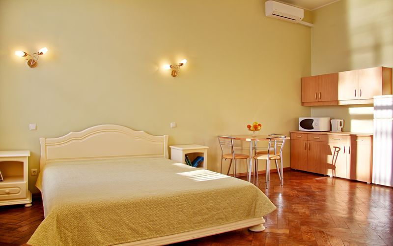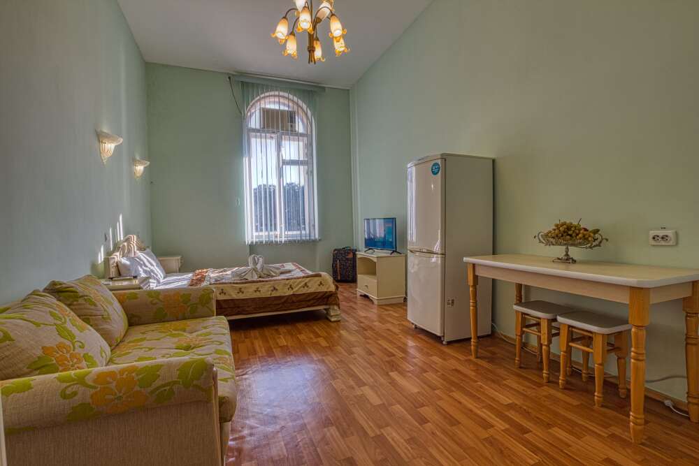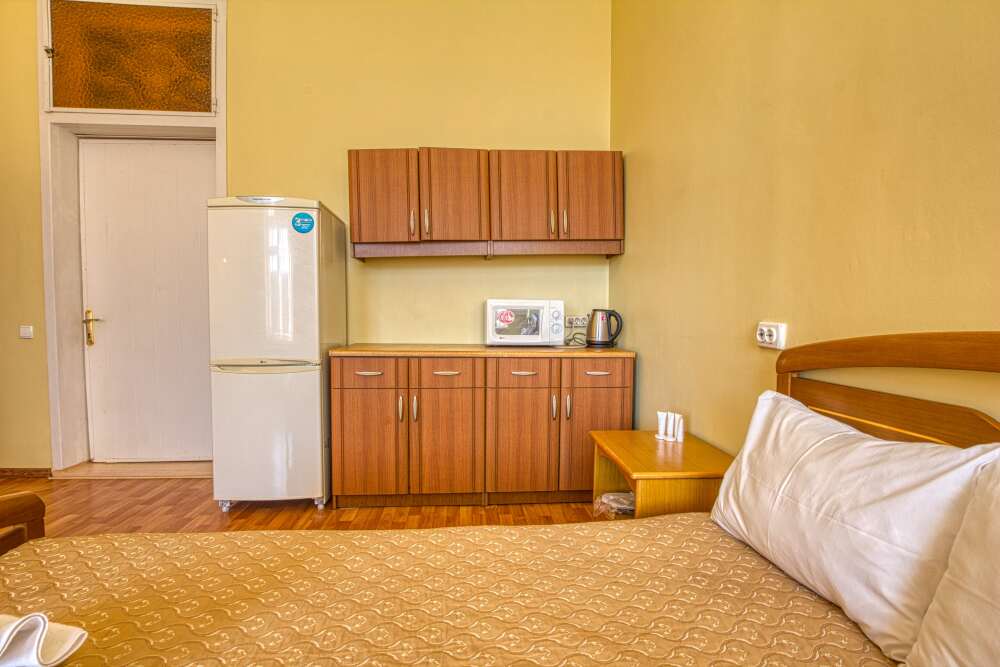 Номер состоит из спальни с одной семейной кроватью, гостиной, в которой расположен раскладной диван, и оборудованной мини-кухней, отдельный санузел и душевая кабина, что позволит разместиться трем-четырем человек.