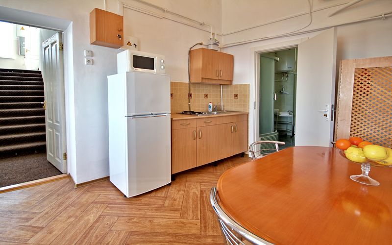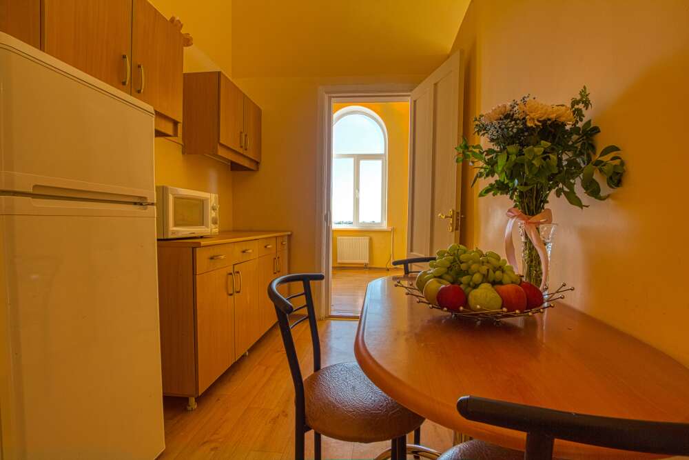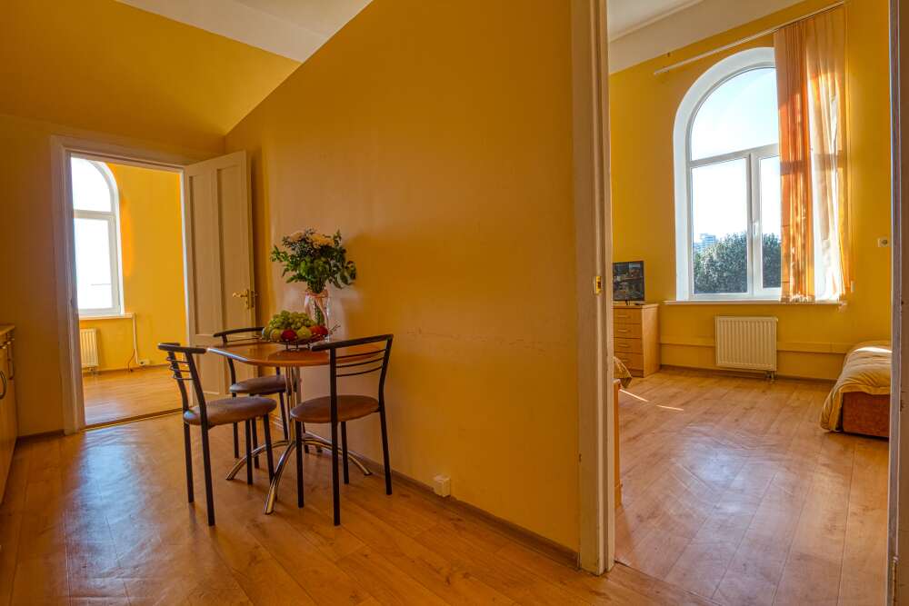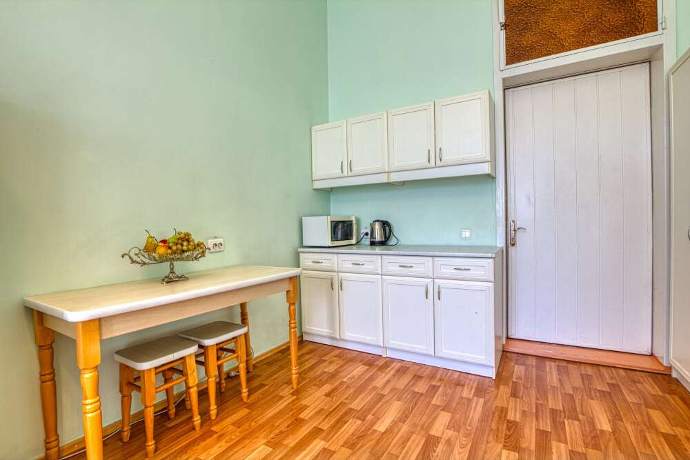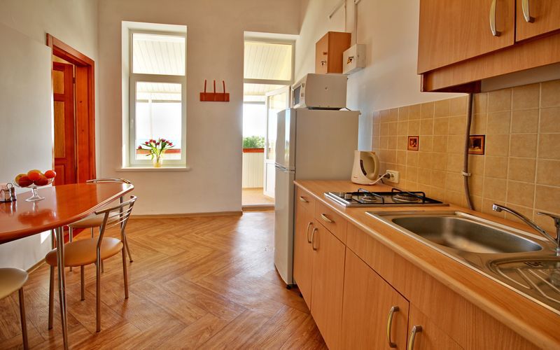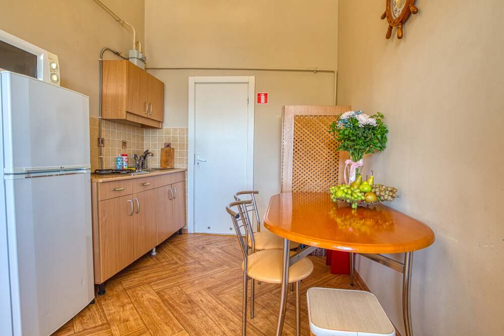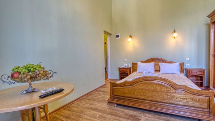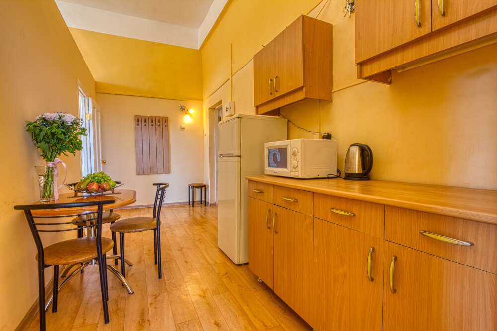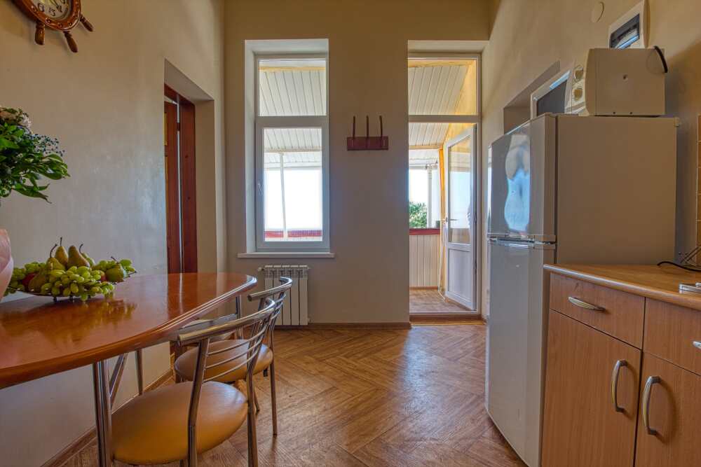 Номер состоит из спальни с одной семейной кроватью, гостиной, в которой расположен раскладной диван, и оборудованной мини-кухней, отдельный санузел и душевая кабина, что позволит разместиться трем-четырем человек.