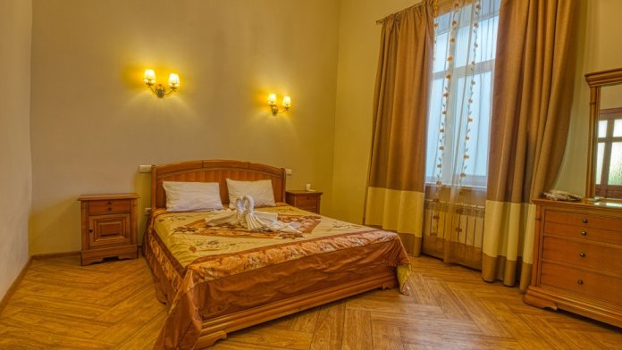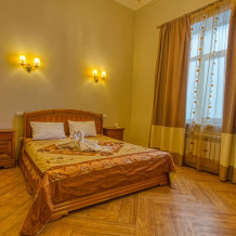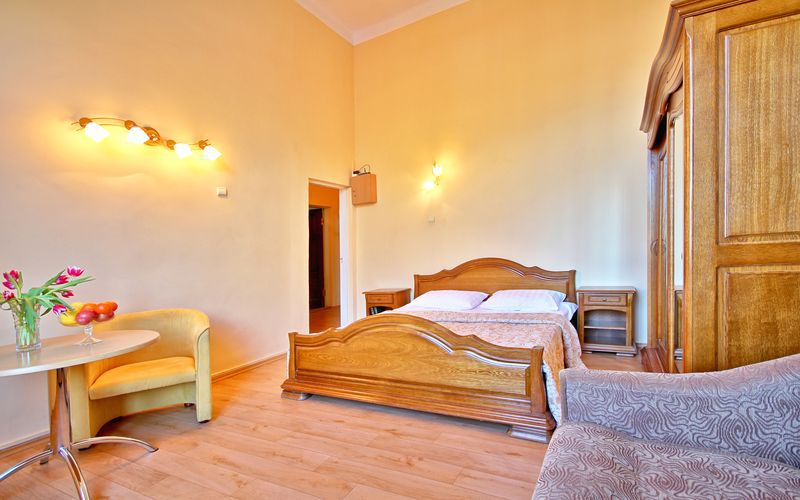 Однокомнатный просторный номер общей площадью 25-26 м2, с одной семейной кроватью или двумя одно- или полутороспальными кроватями. В виде дополнительного места представлены раскладной диван или кресла, что позволяет комфортно разместиться от двух до четырех человек.
