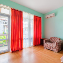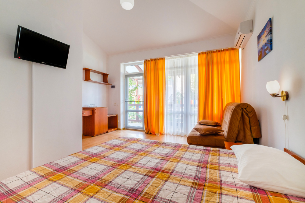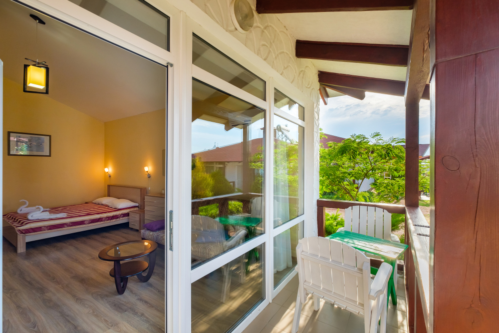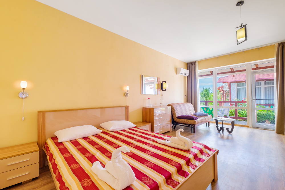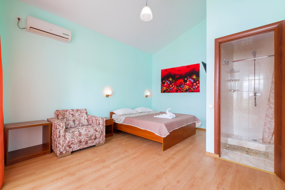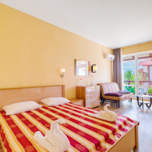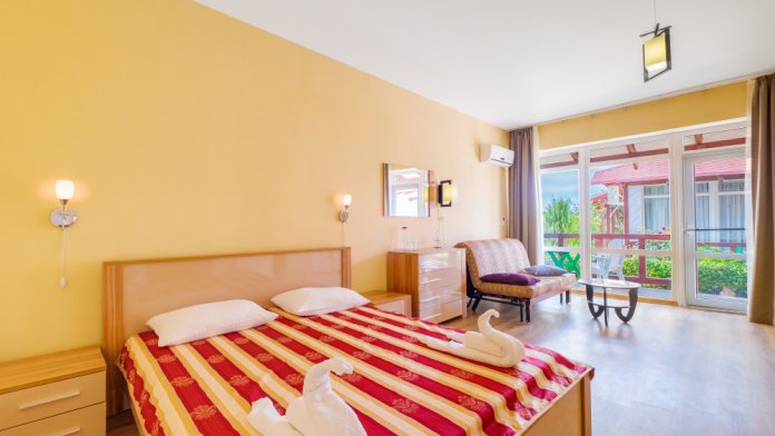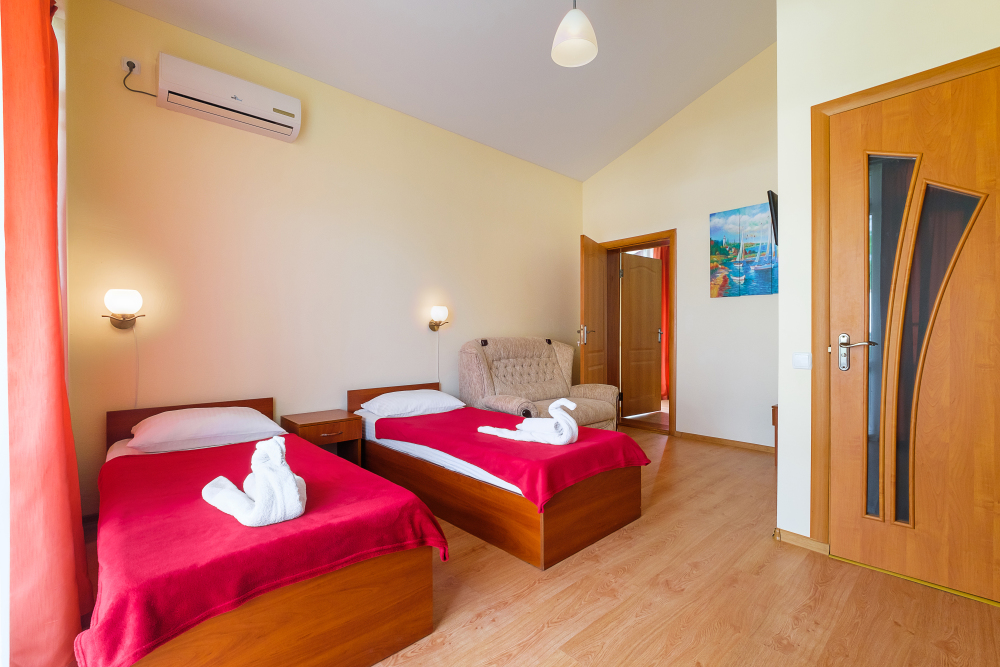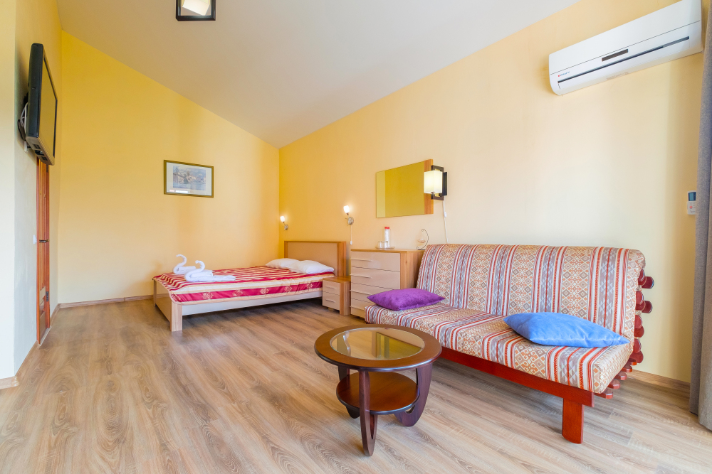 Уютный двухместный номер, в котором есть двуспальная или 2 полуторных кровати, кондиционер, телевизор со спутниковым ТВ, стол, сейф, посуда и холодильник, удобства. Номера с террасой или балконом. Есть доступ к Интернету (Wi-FI).