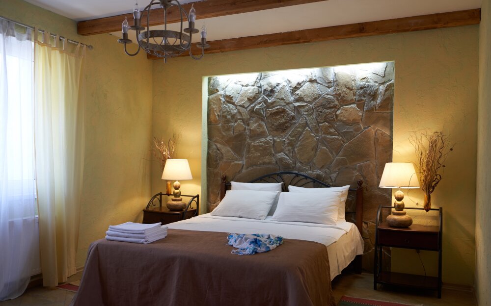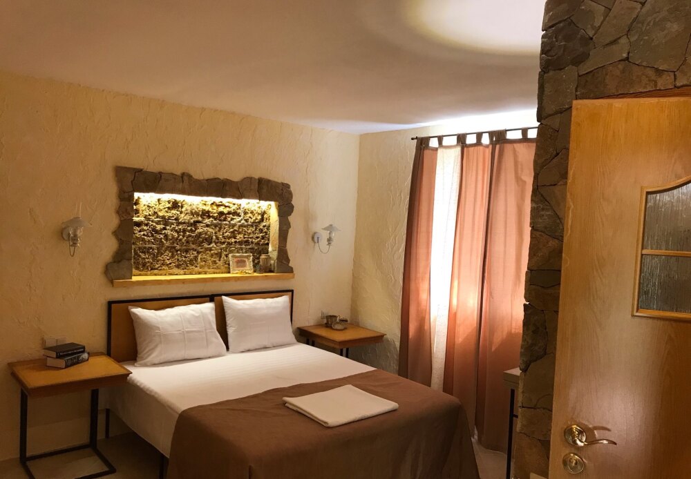 Однокомнатный двухместный номер категории Стандарт № 1 (площадь 18 м², в средиземноморском стиле с собственной ванной комнатой, на первом этаже, с лоджией, видом на внутренний дворик, двухместное размещение, одна двухспальная кровать с ортопедическим матрасом и подушками).