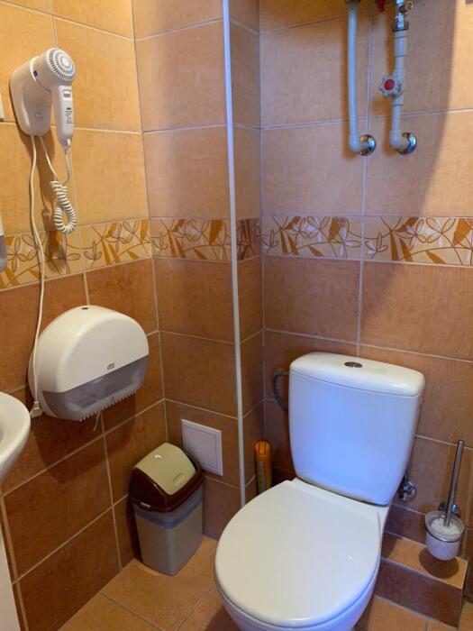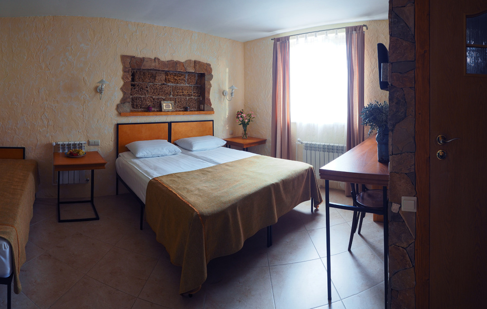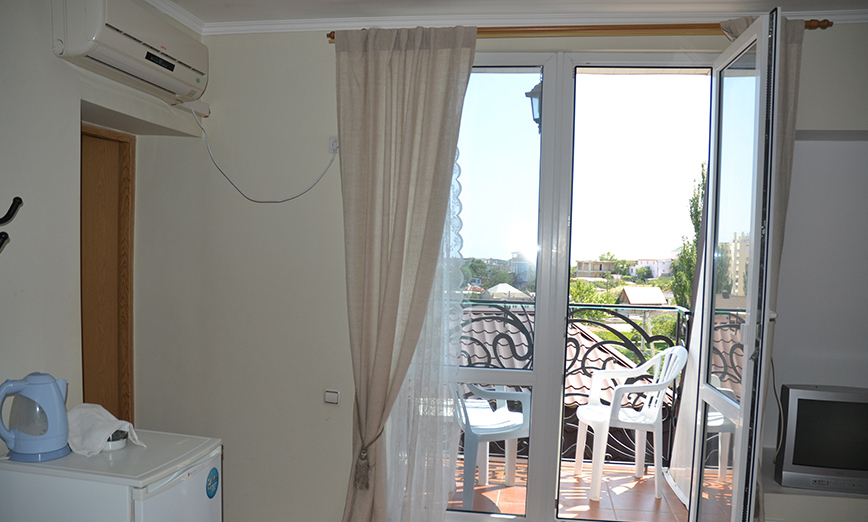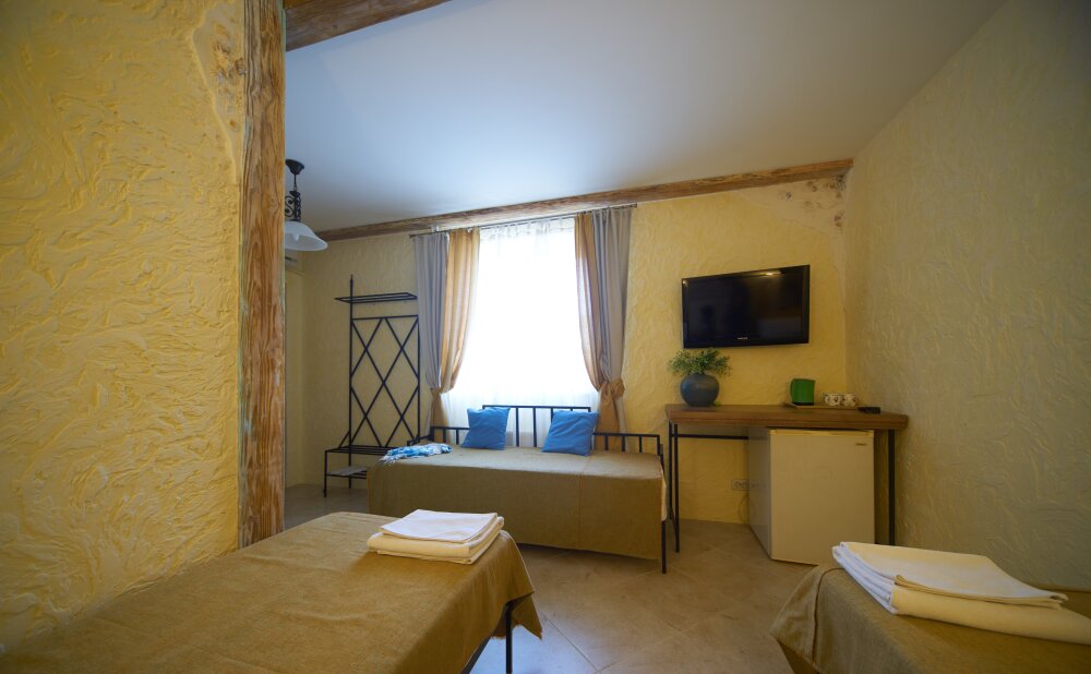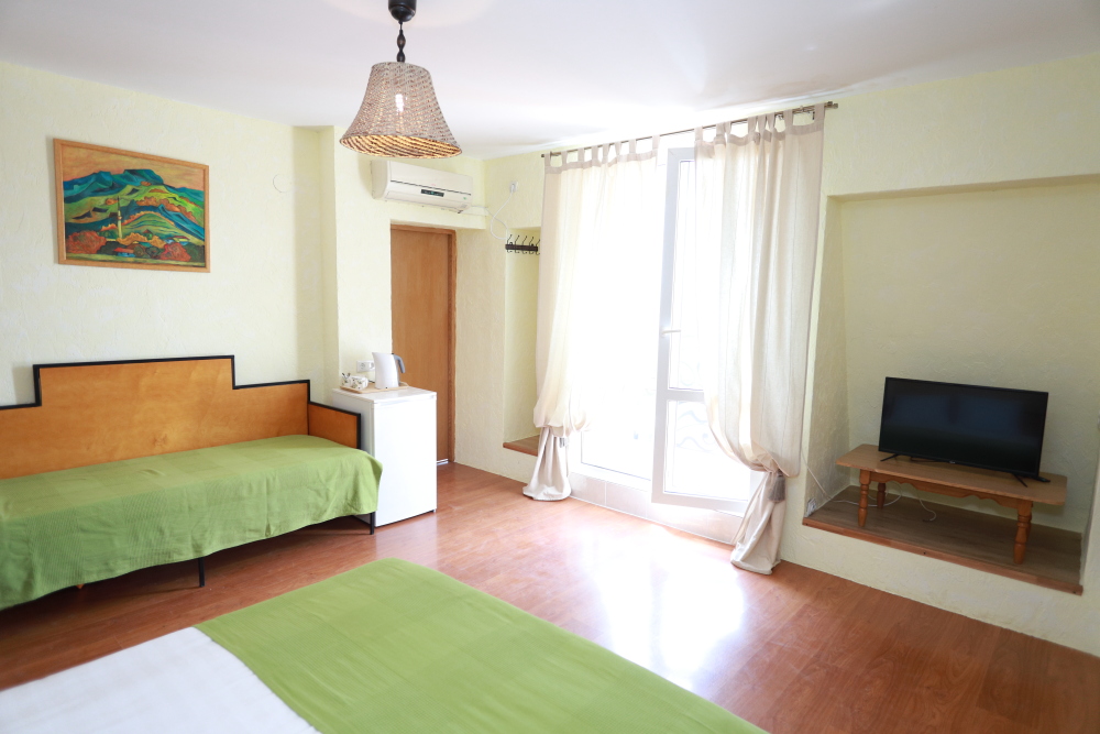 Однокомнатный трёхместный номер категории Стандарт Улучшенный № 5 (площадь 22 м², в средиземноморском стиле с собственной ванной комнатой, на третьем этаже, с балкончиком, видом на улицу и внутренний дворик, трёхместное размещение, на выбор:одна двухспальная кровать и одна односпальная кровать или три раздельные кровати с ортопедическими матрасами и подушками).