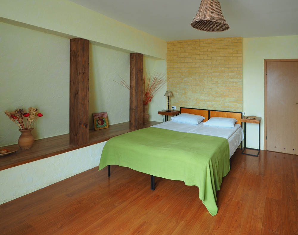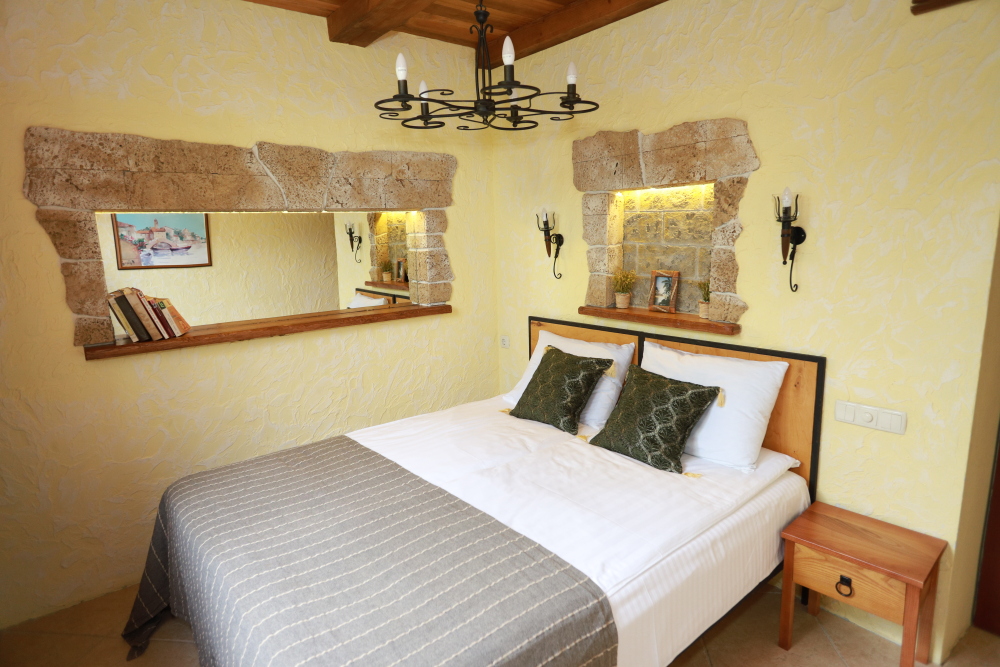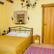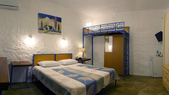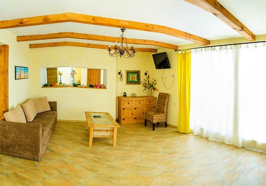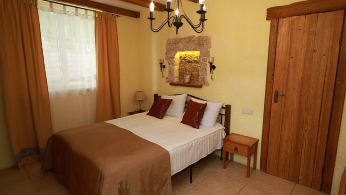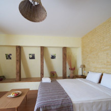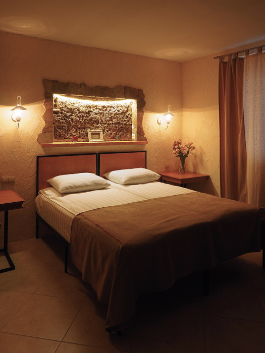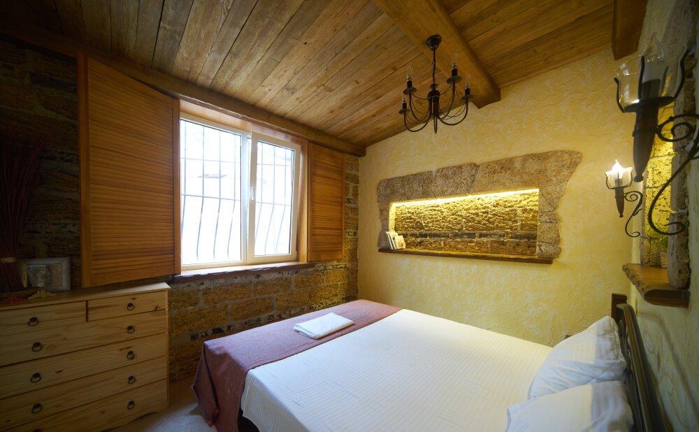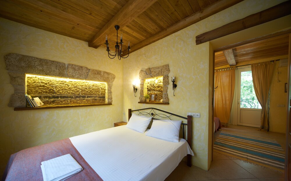 Двухкомнатный номер категории Делюкс № 9 (площадь 44 м², с раздельными комнатами, в средиземноморском стиле с собственной ванной комнатой, на втором этаже, с лоджией, видом на улицу и соседский дворик), четырёхместное размещение, на выбор две двухспальных кровати или одна двухспальная кровать и две раздельные кровати с ортопедическими матрасами и подушками.
