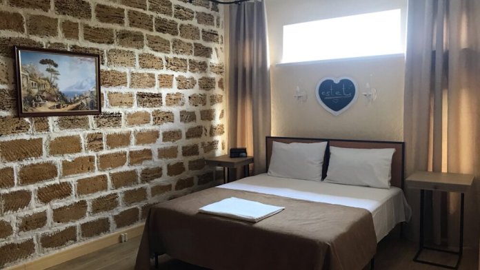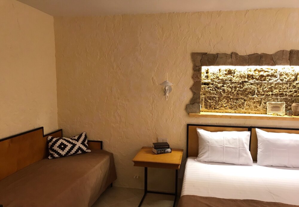 Двухкомнатный номер студия категории Делюкс № 18 (площадь 42 м², одна комната проходная, в средиземноморском стиле с собственной ванной комнатой, на третьем этаже, с обзорной террасой, видом на Генуэзскую крепость, море, горы и внутренний дворик), пятиместное размещение, одна двухспальная кровать и одна односпальная кровать с ортопедическими матрасами и подушками, один двухспальный раскладной диван.