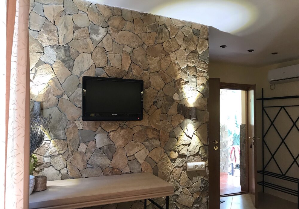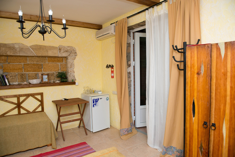 Однокомнатный трёхместный номер категории Стандарт Улучшенный № 11 (площадь 18 м², в средиземноморском стиле с собственной ванной комнатой, на первом этаже, с большой террасой, топчаном и видом на соседский дворик, трёхместное размещение, на выбор:одна двухспальная кровать и одна односпальная кровать или три раздельные кровати с ортопедическими матрасами и подушками).