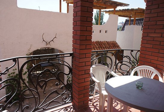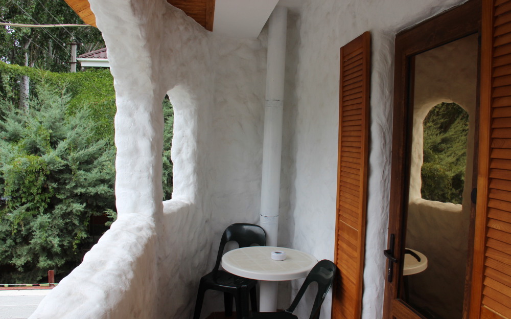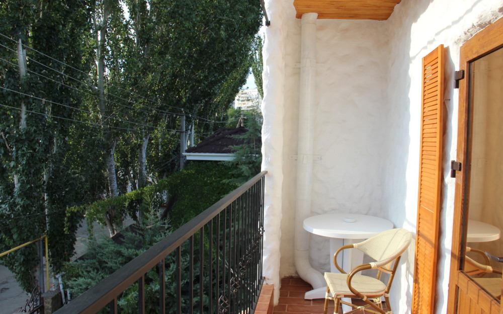 Однокомнатный двухместный номер категории Стандарт № 15 (площадь 18 м², в марокканском стиле с собственной ванной комнатой, на втором этаже, с лоджией, видом на соседский дворик, двухместное размещение, одна двухспальная кровать с ортопедическим матрасом и подушками).