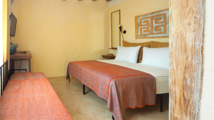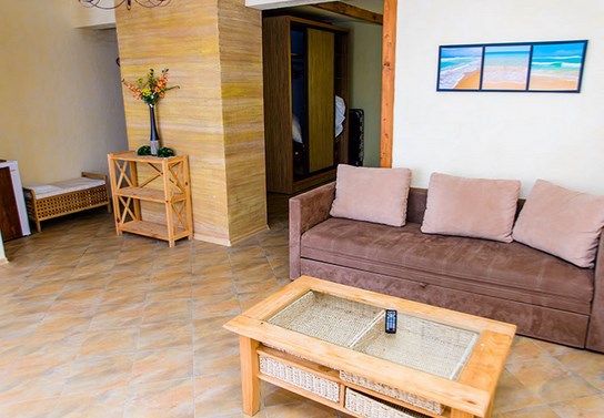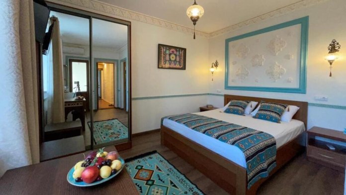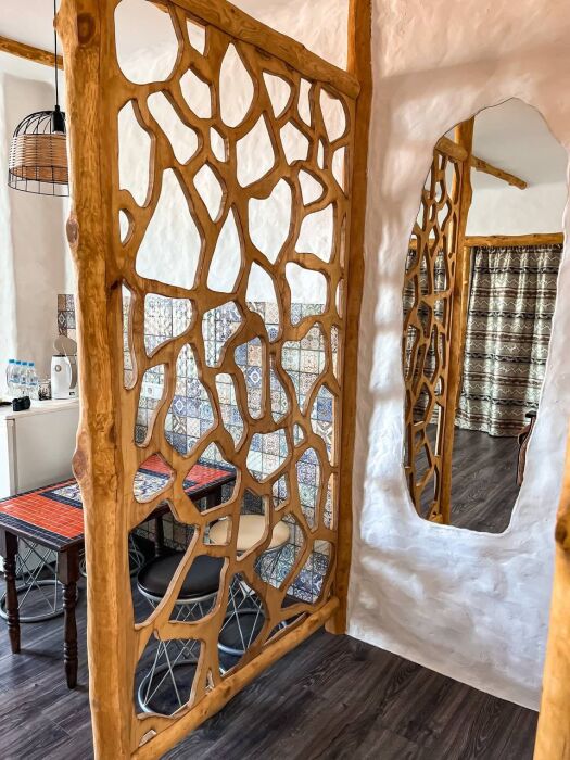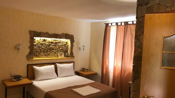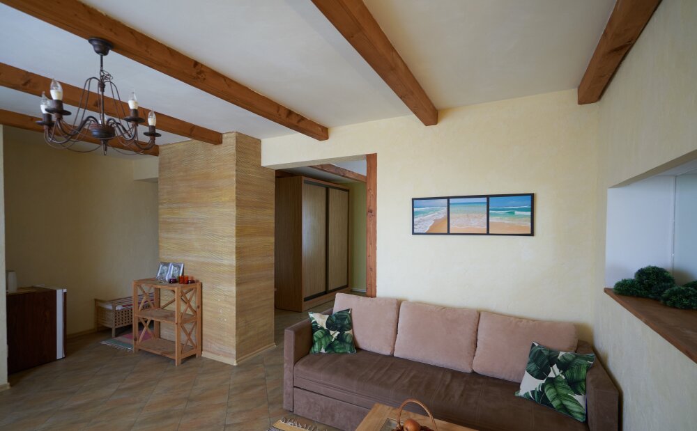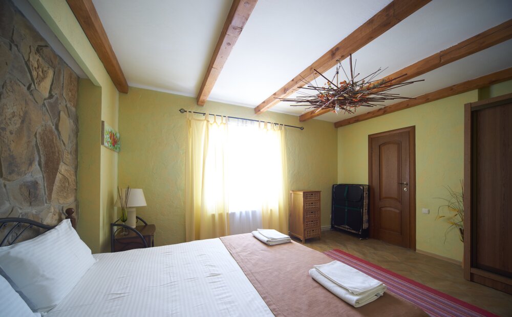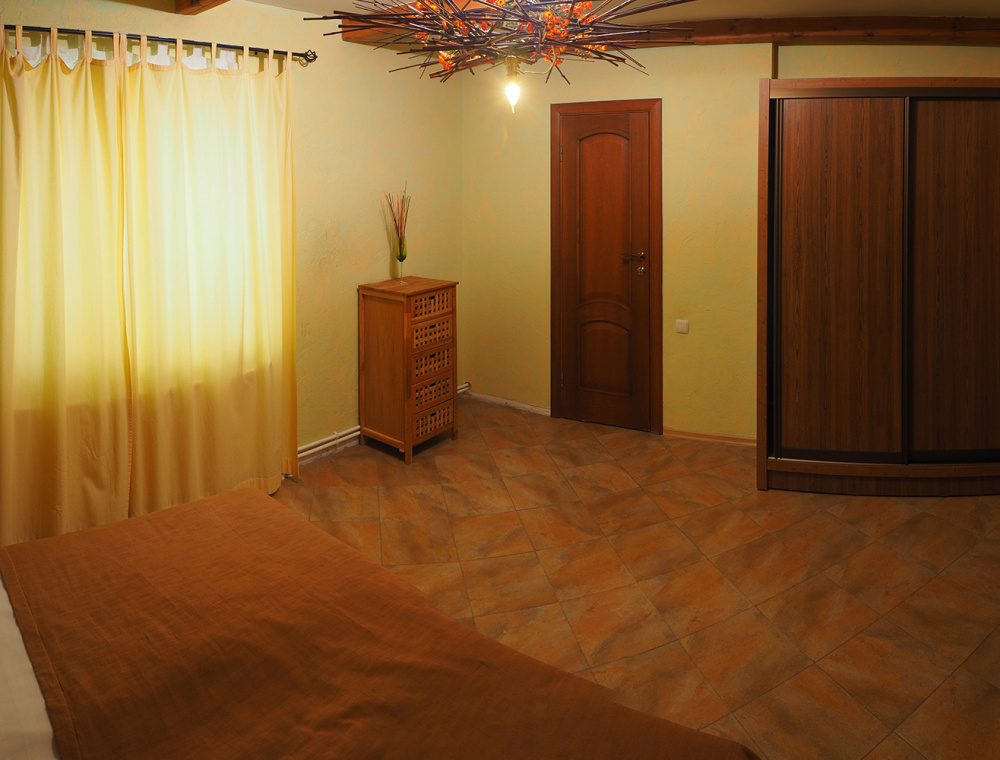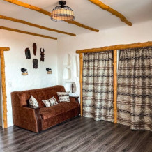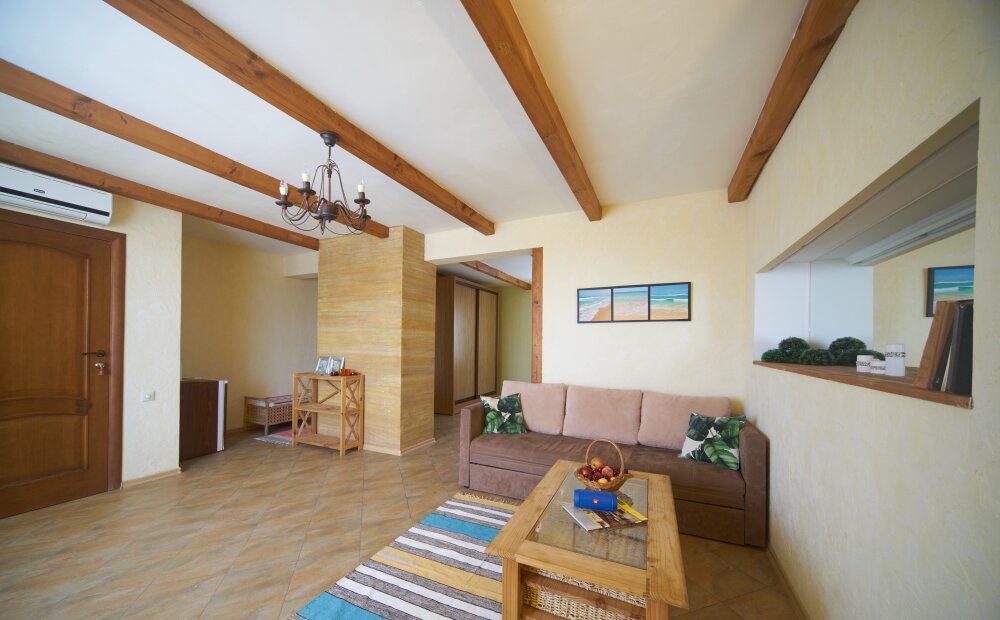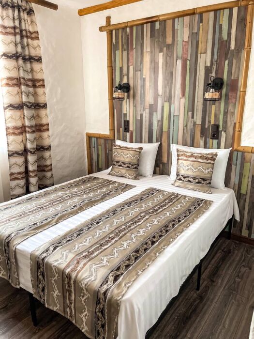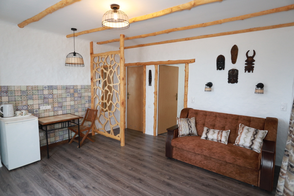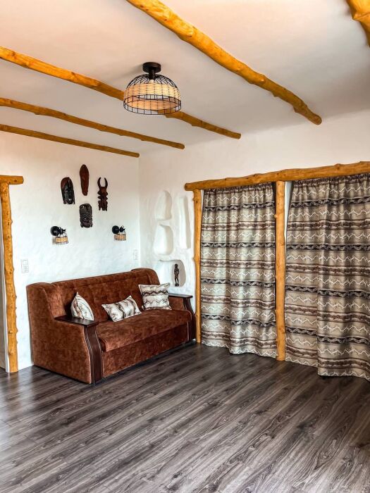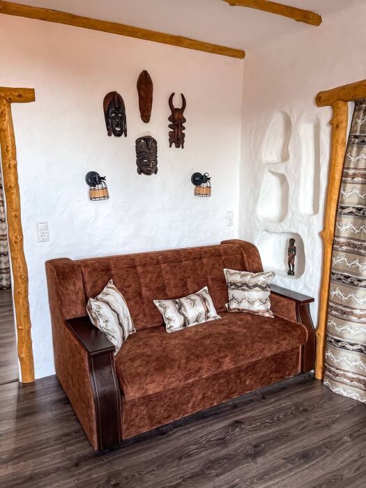 Двухкомнатный номер категории Люкс № 6 (площадь 28 м², одна комната проходная, в африканском стиле с собственной ванной комнатой, на третьем этаже, с балкончиком, видом на внутренний дворик), четырёхместное размещение, на выбор:один двухспальный раскладной диван и одна двухспальная кровать с ортопедическим матрасом и подушками или один двухспальный диван и две раздельные кровати с ортопедическими матрасами и подушками).