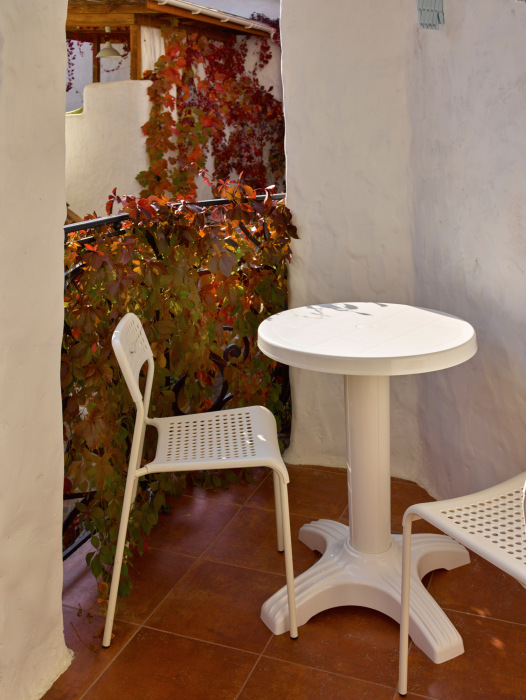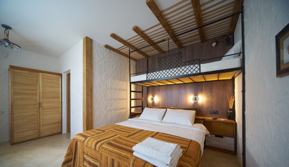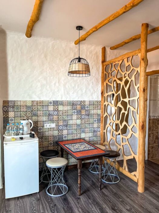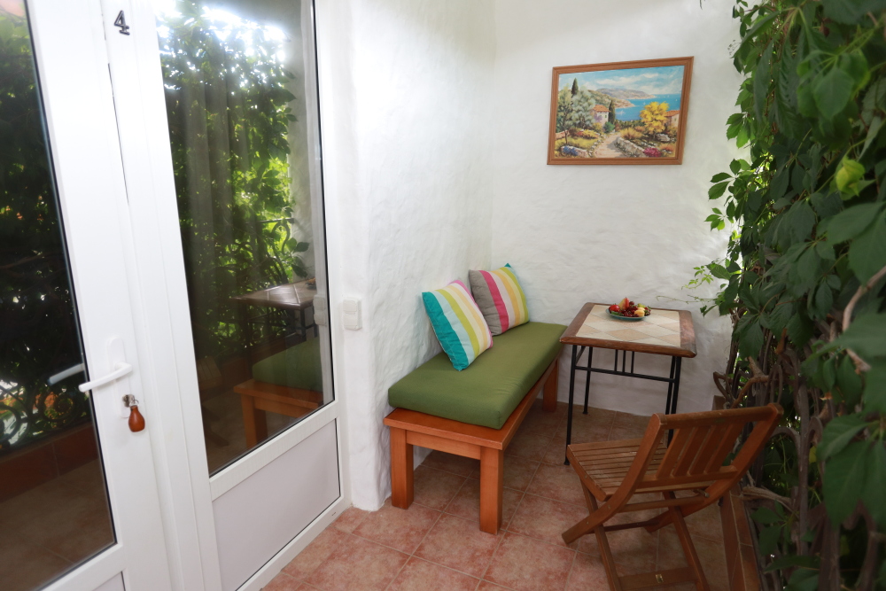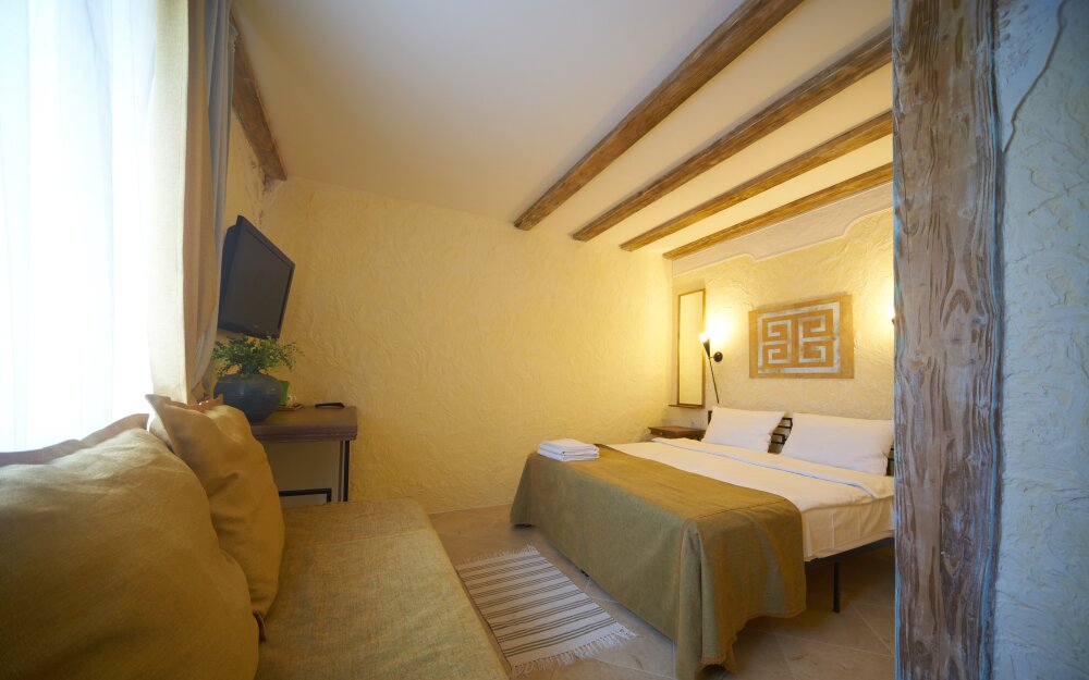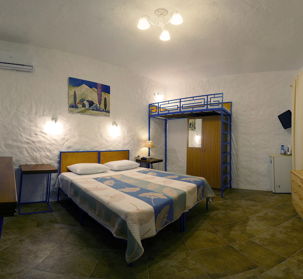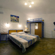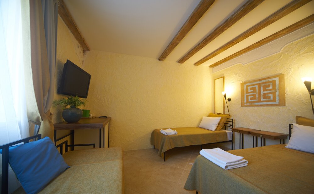 Однокомнатный трёхместный номер категории Стандарт Улучшенный № 10 (площадь 22 м², в средиземноморском стиле с собственной ванной комнатой, на первом этаже, с большой террасой, топчаном и видом на внутренний дворик, трёхместное размещение, на выбор:одна двухспальная и одна односпальная чердачная кровать или две раздельные кровати и одна односпальная чердачная кровать с ортопедическими матрасами и подушками).