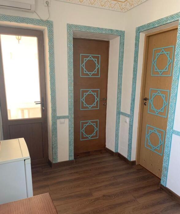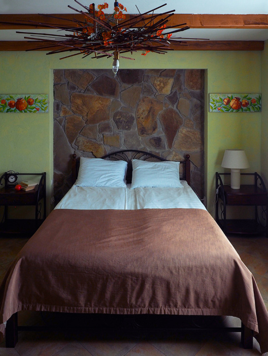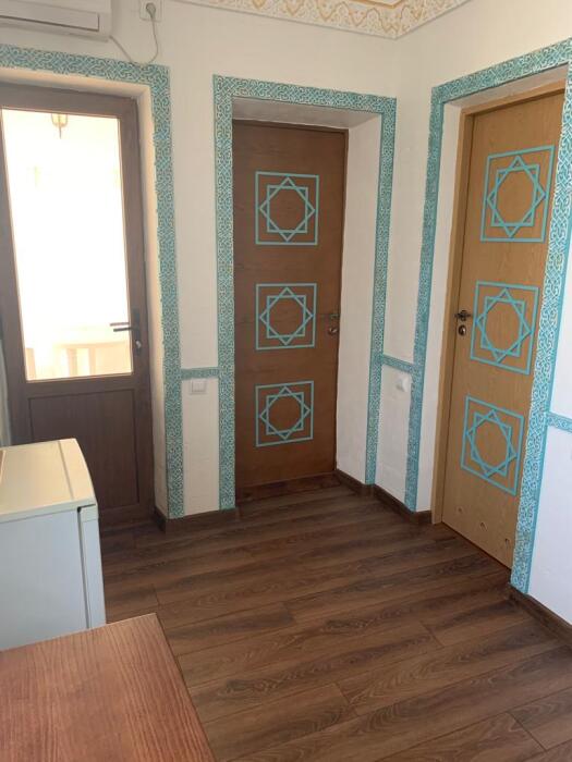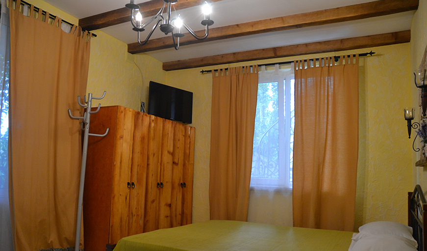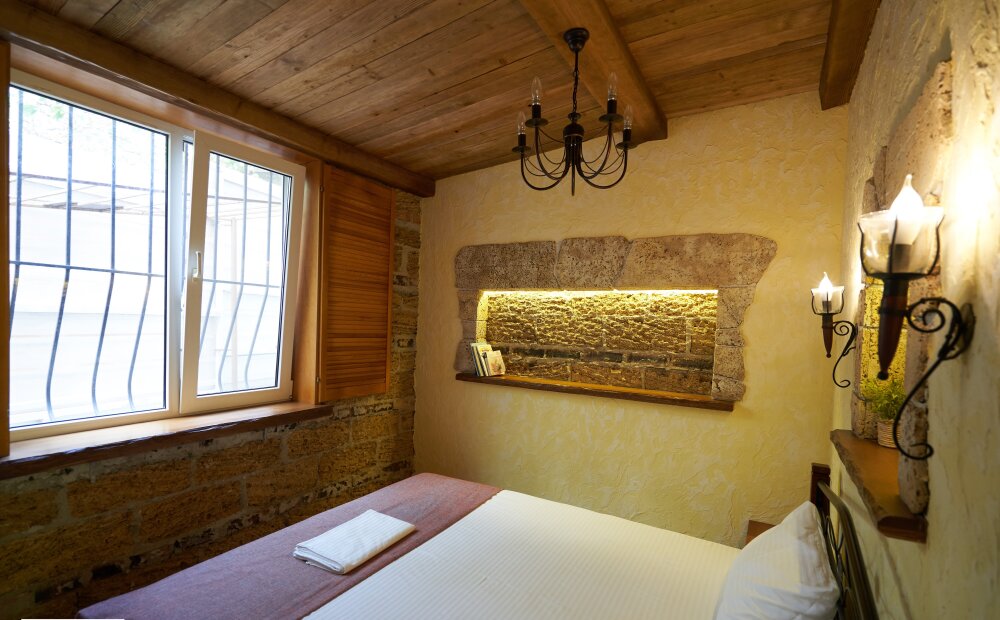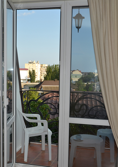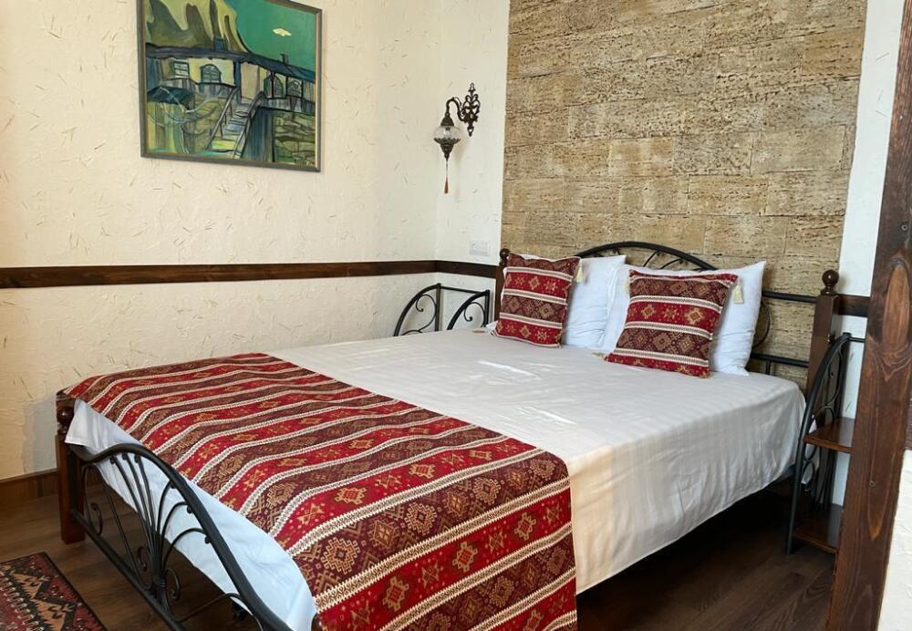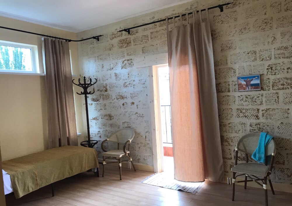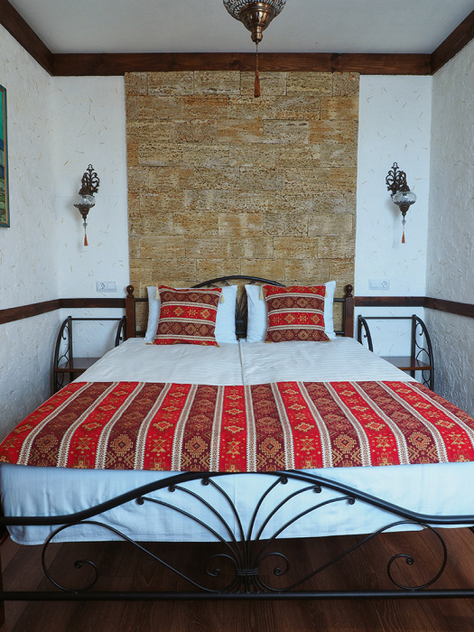 Однокомнатный двухместный номер категории Стандарт № 16 (площадь 18 м², в марокканском стиле с собственной ванной комнатой, на втором этаже, с лоджией, видом на соседский дворик, двухместное размещение, одна двухспальная кровать с ортопедическим матрасом и подушками).