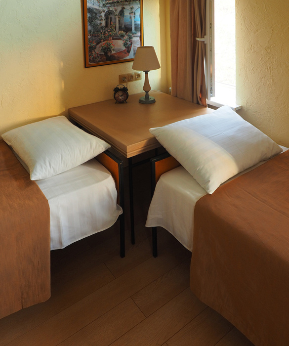 Однокомнатный трёхместный номер категории Стандарт № 12 (площадь 18 м², в средиземноморском стиле с собственной ванной комнатой, на первом этаже, с лоджией, видом на внутренний дворик, трехместное размещение, на выбор:одна двухспальная и одна односпальная чердачная кровать или две раздельные кровати и одна односпальная чердачная кровать с ортопедическими матрасами и подушками).